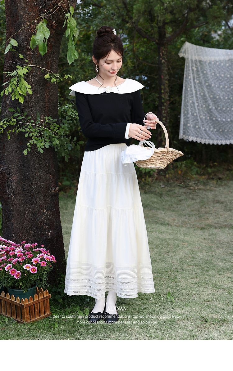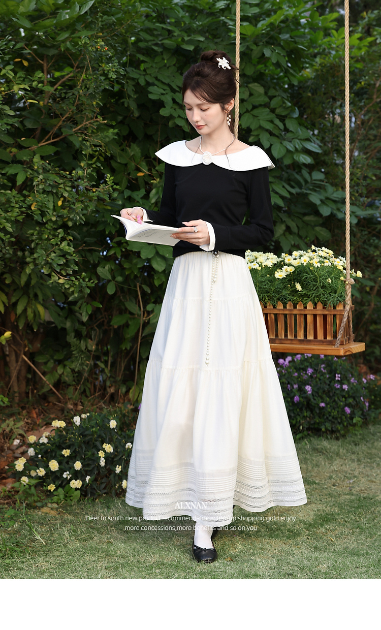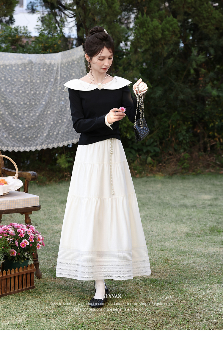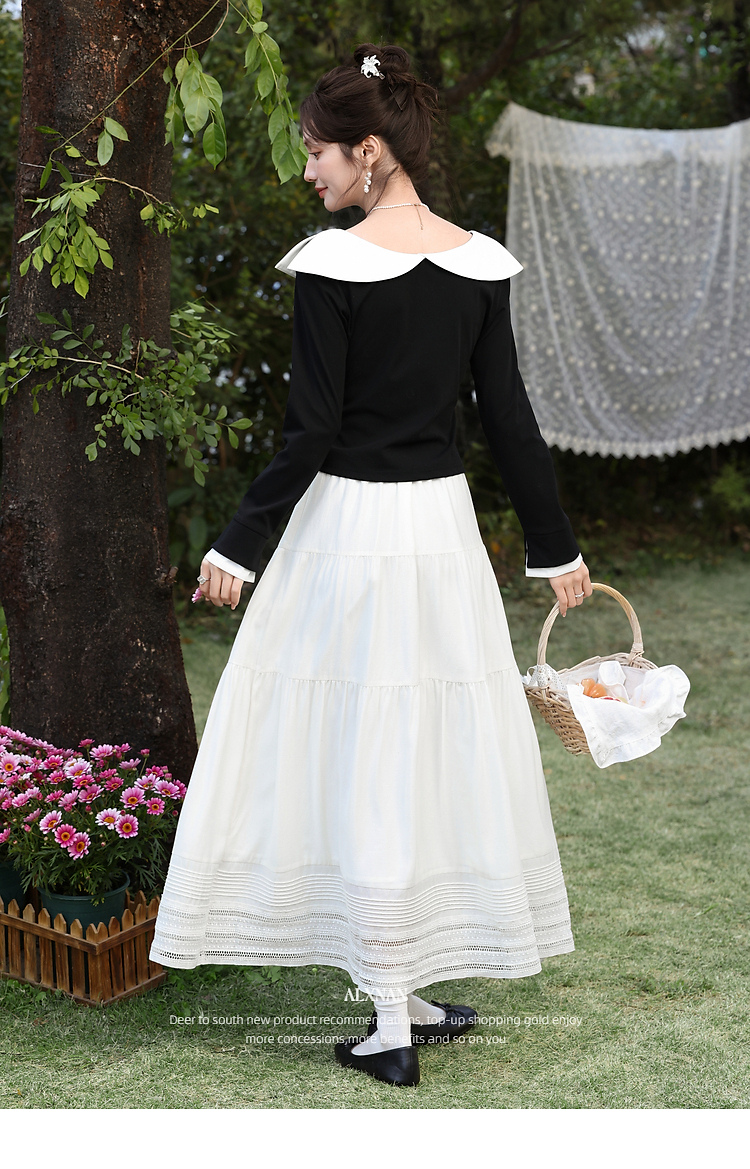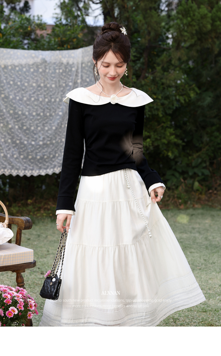 鹿向南「山茶墨韵」黑色假两件t恤女春季小众设计感法式长袖上衣