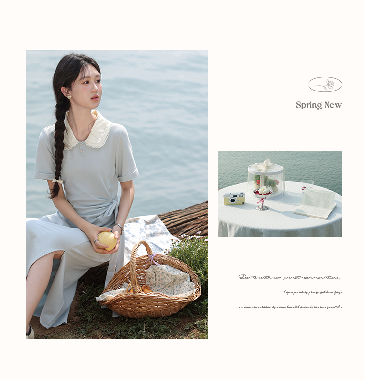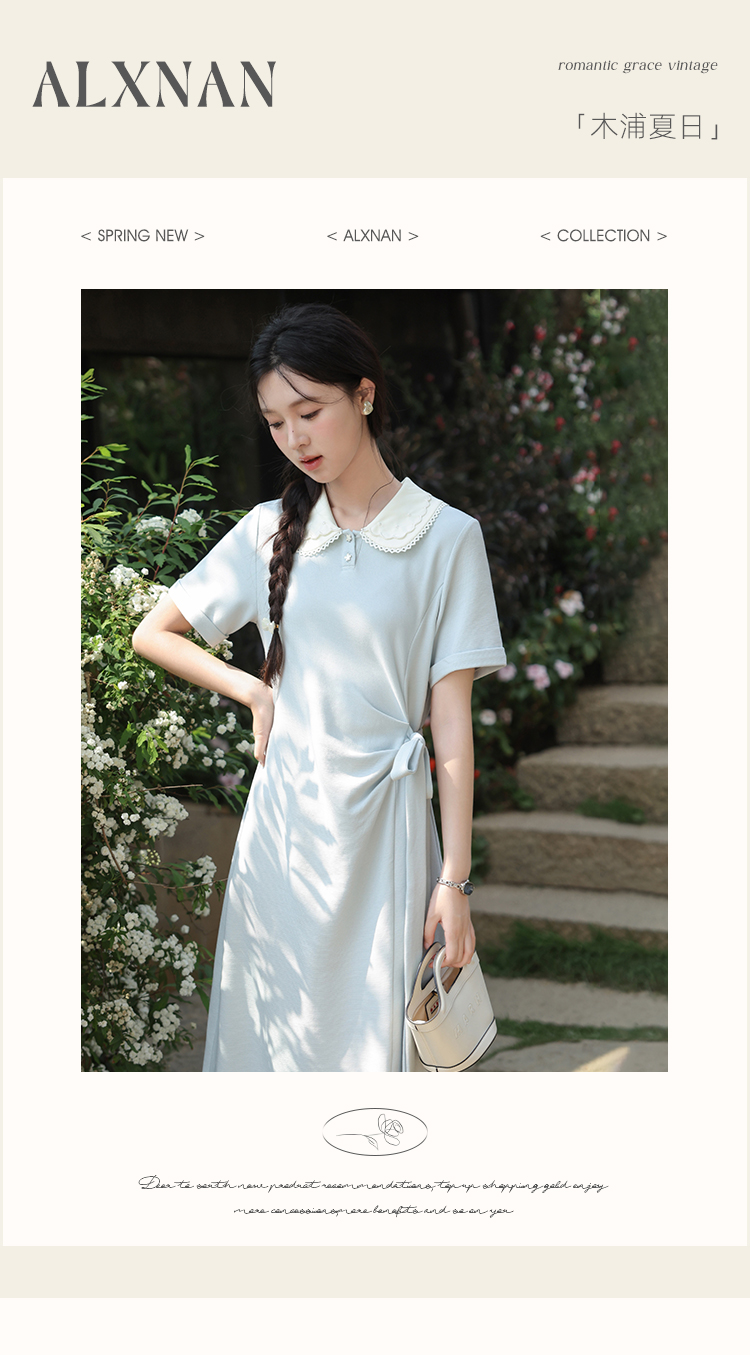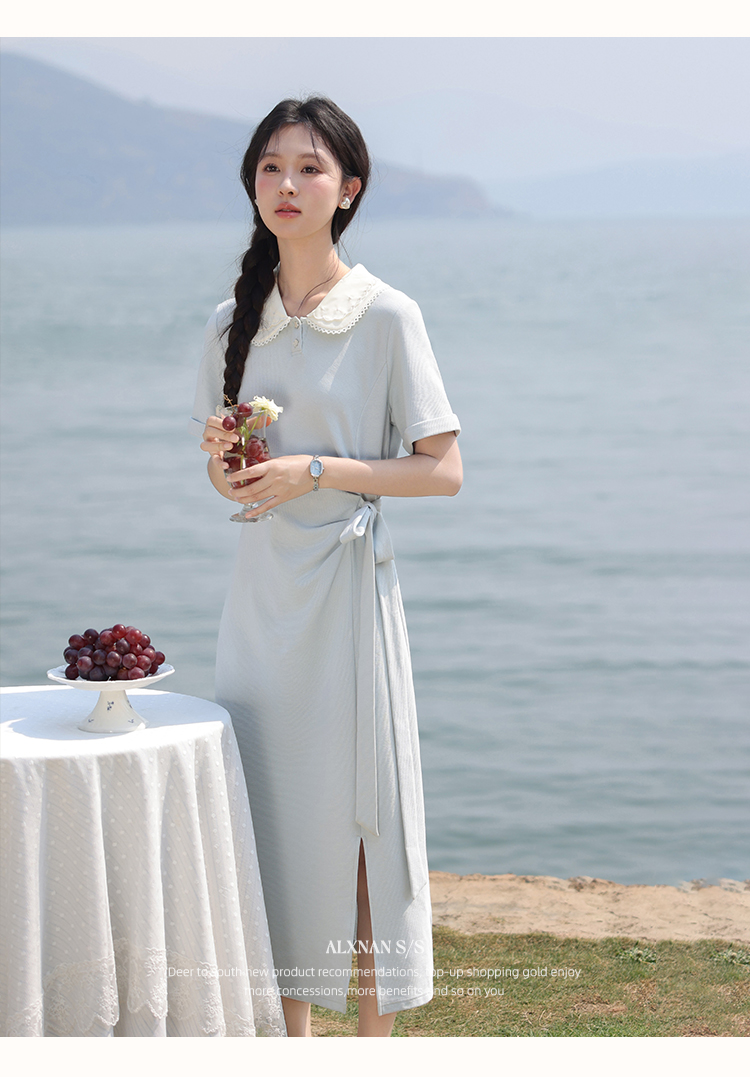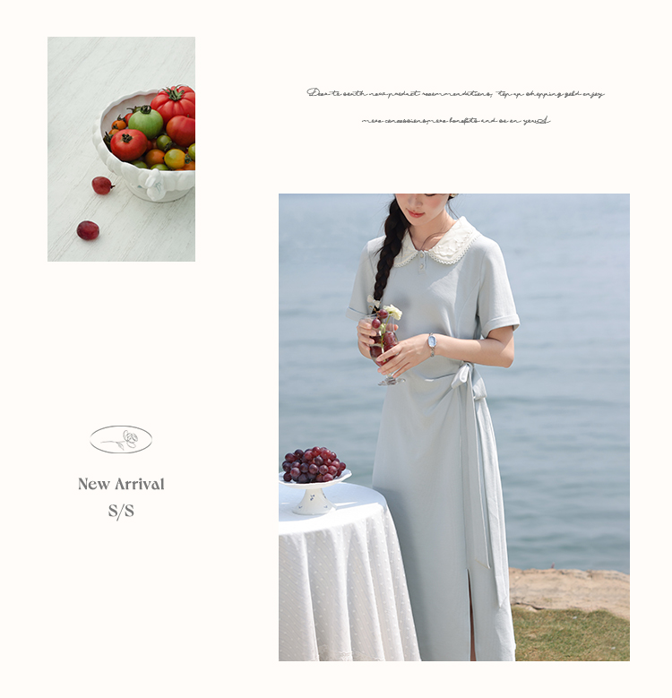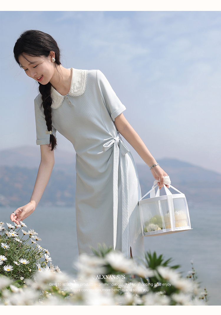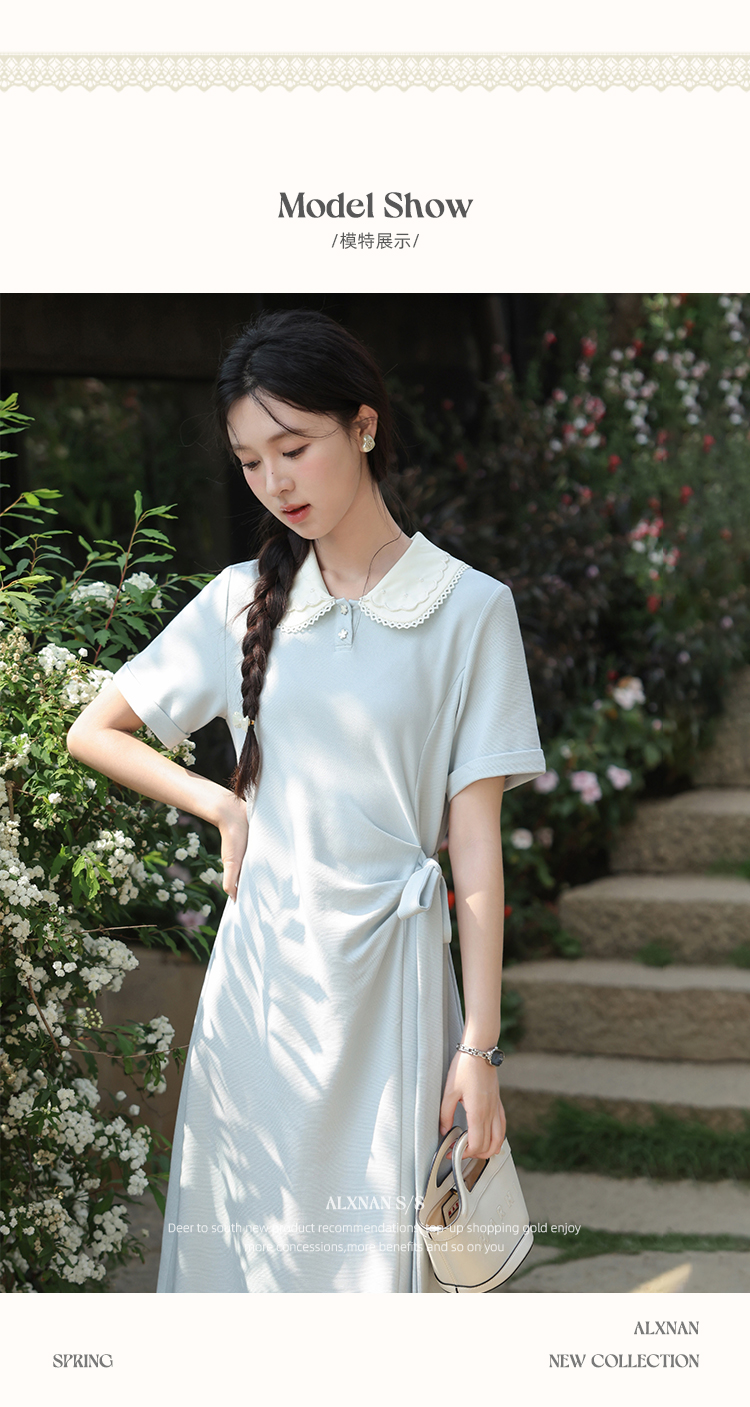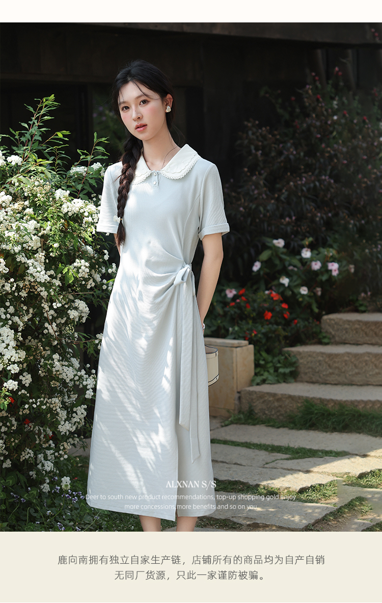 【6折秒杀】鹿向南「木浦夏日」气质翻领女夏连衣裙宽松短袖收腰侧开叉长款裙DYL661811