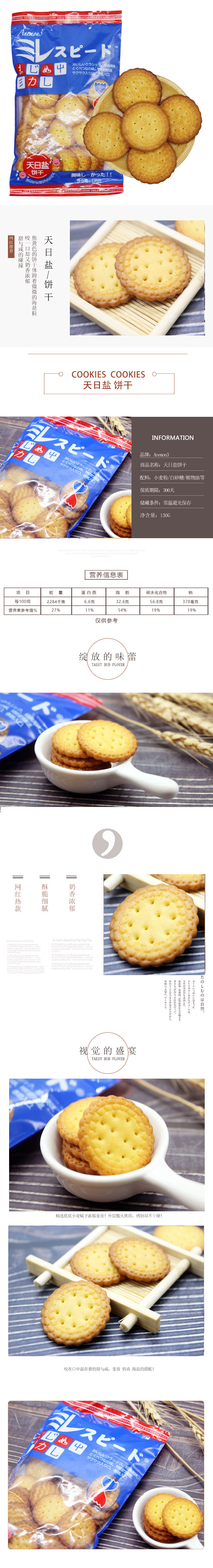 【产品名称】天日盐饼干 【产品类型】韧性饼干 【品牌】Anemon3系列 【规格】净含量 130g/袋 【特点】日式海盐味小圆饼,天然盐香,超级美味~ 【产地】福建泉州 【加运费地区】北京+1 【不发货地区】新疆 西藏 港澳台 【售后】提交带面单问题产品图片,24小时反馈客服处理 ①非产品质量问题 不支持七天无理由退货