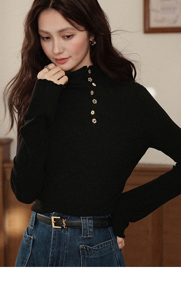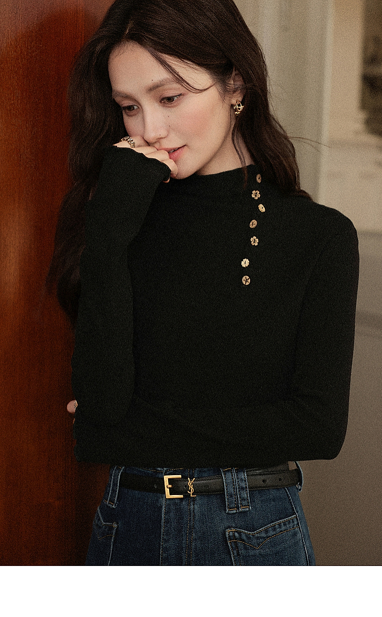 鹿向南「黑松绵绵」设计感黑色长袖t恤女秋修身半高领打底衫上衣
