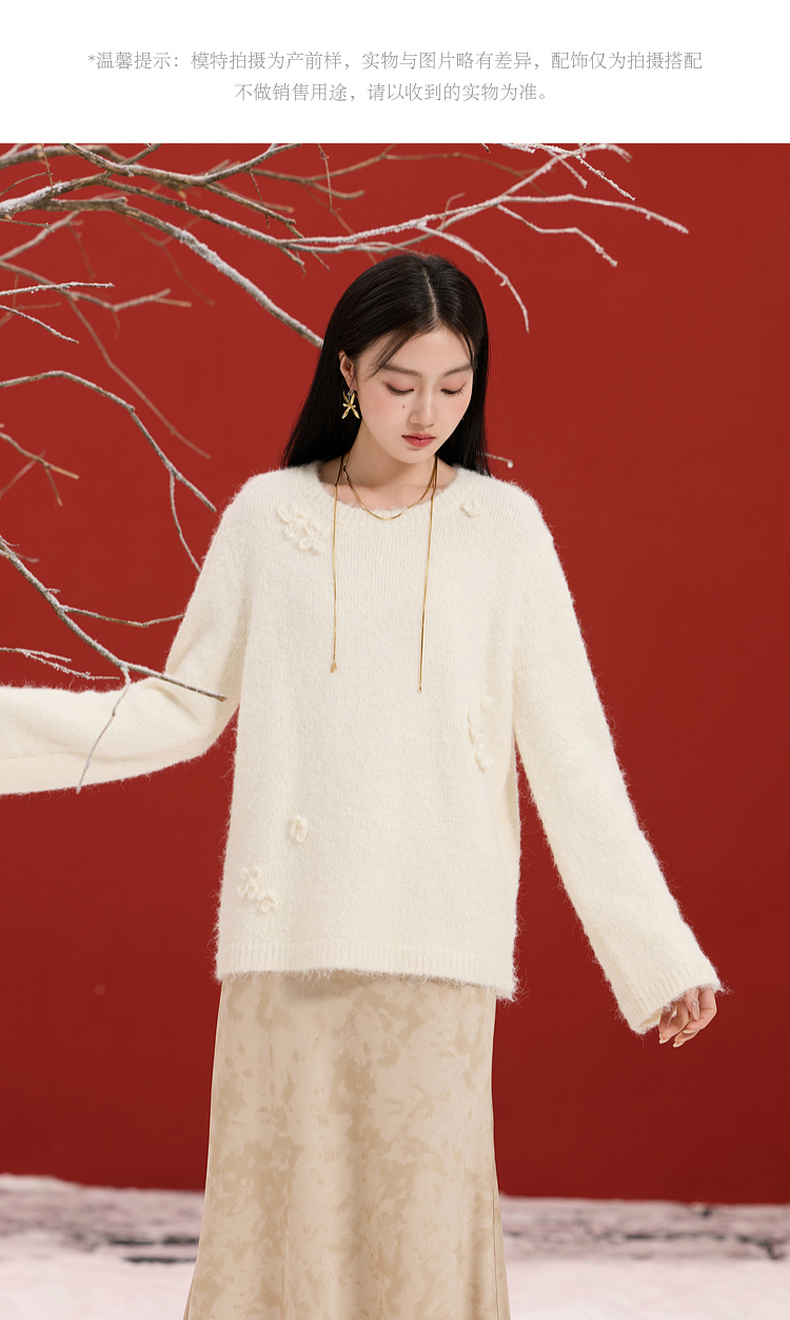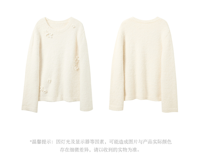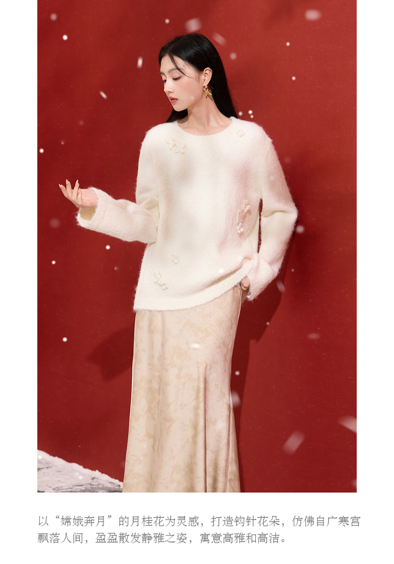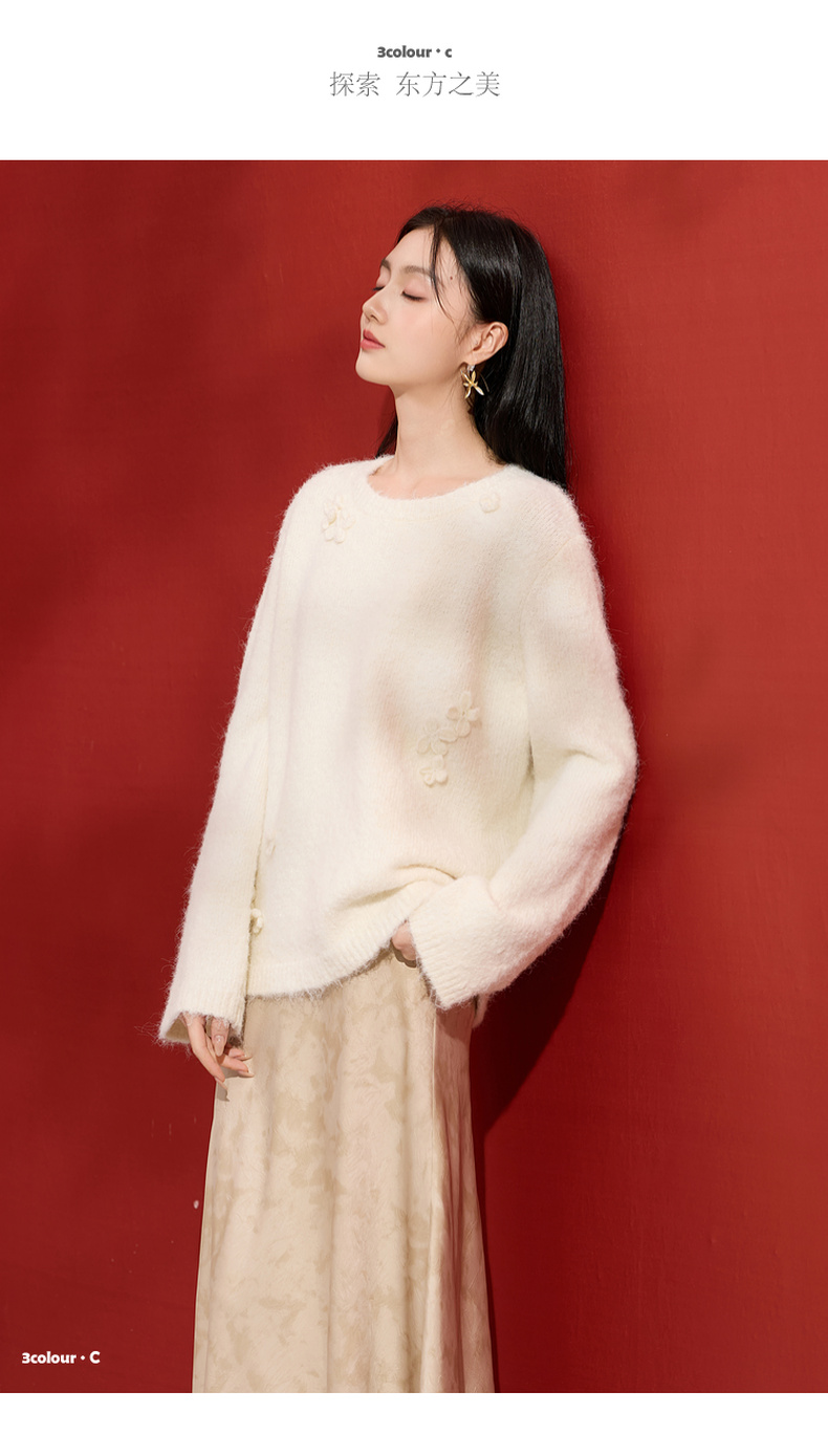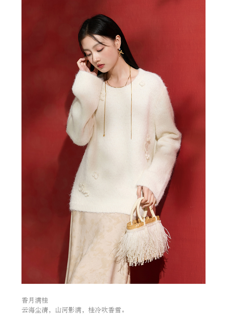 三彩【香月满桂】2025冬季新款钩花针织衫圆领宽松毛衫套头C