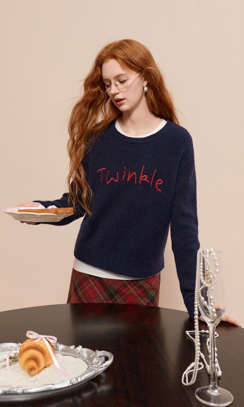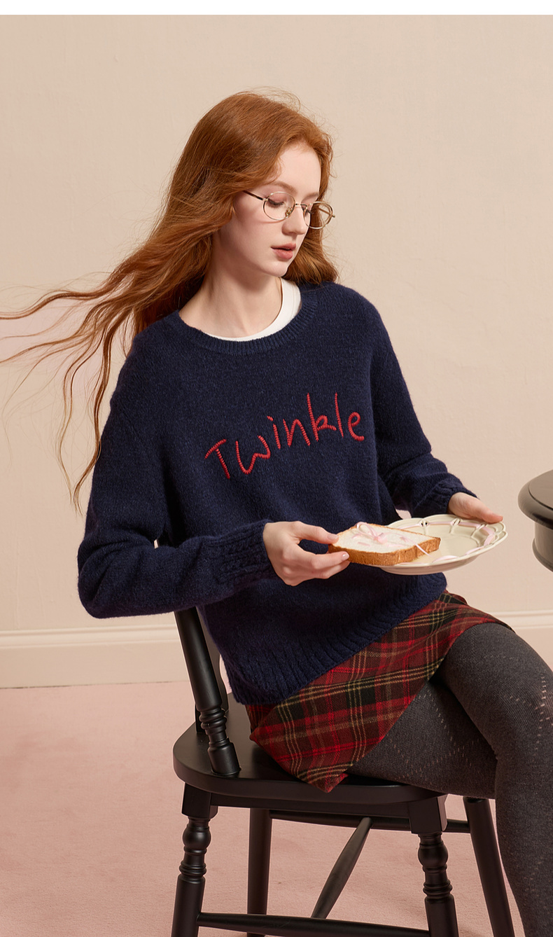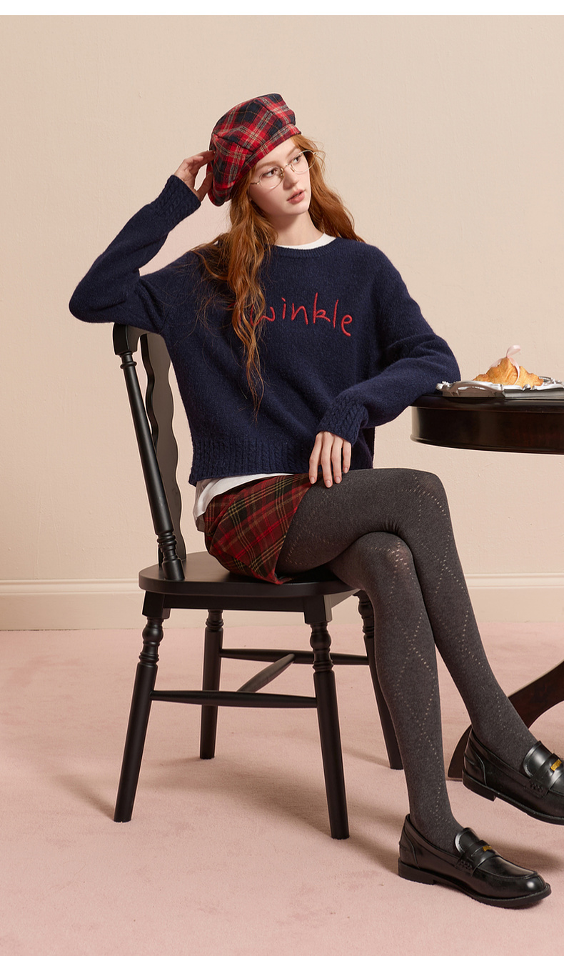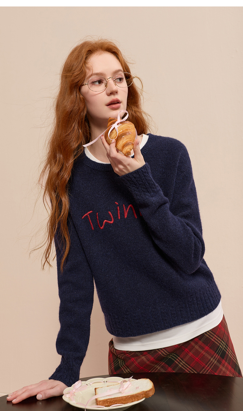 三彩2025冬季新款字母刺绣针织衫圆领宽松落肩袖毛衫休闲M
