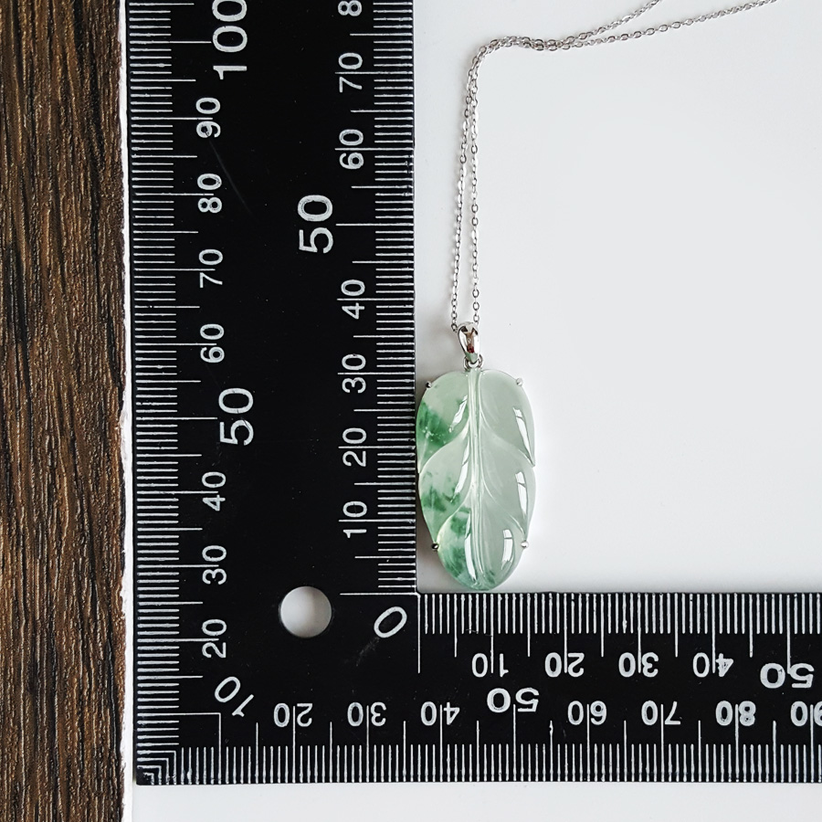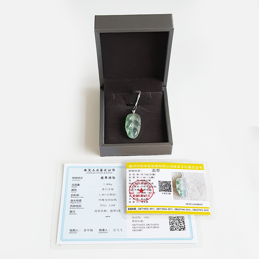 【天然正品】A货翡翠AU750收藏级白金镶天然木那高冰种飘蓝花叶子(金枝玉叶)翡翠吊坠项链36.1*16.2*7.1MM(皆取最大值)链长:45CM(长度可调节)女士021225NJS11