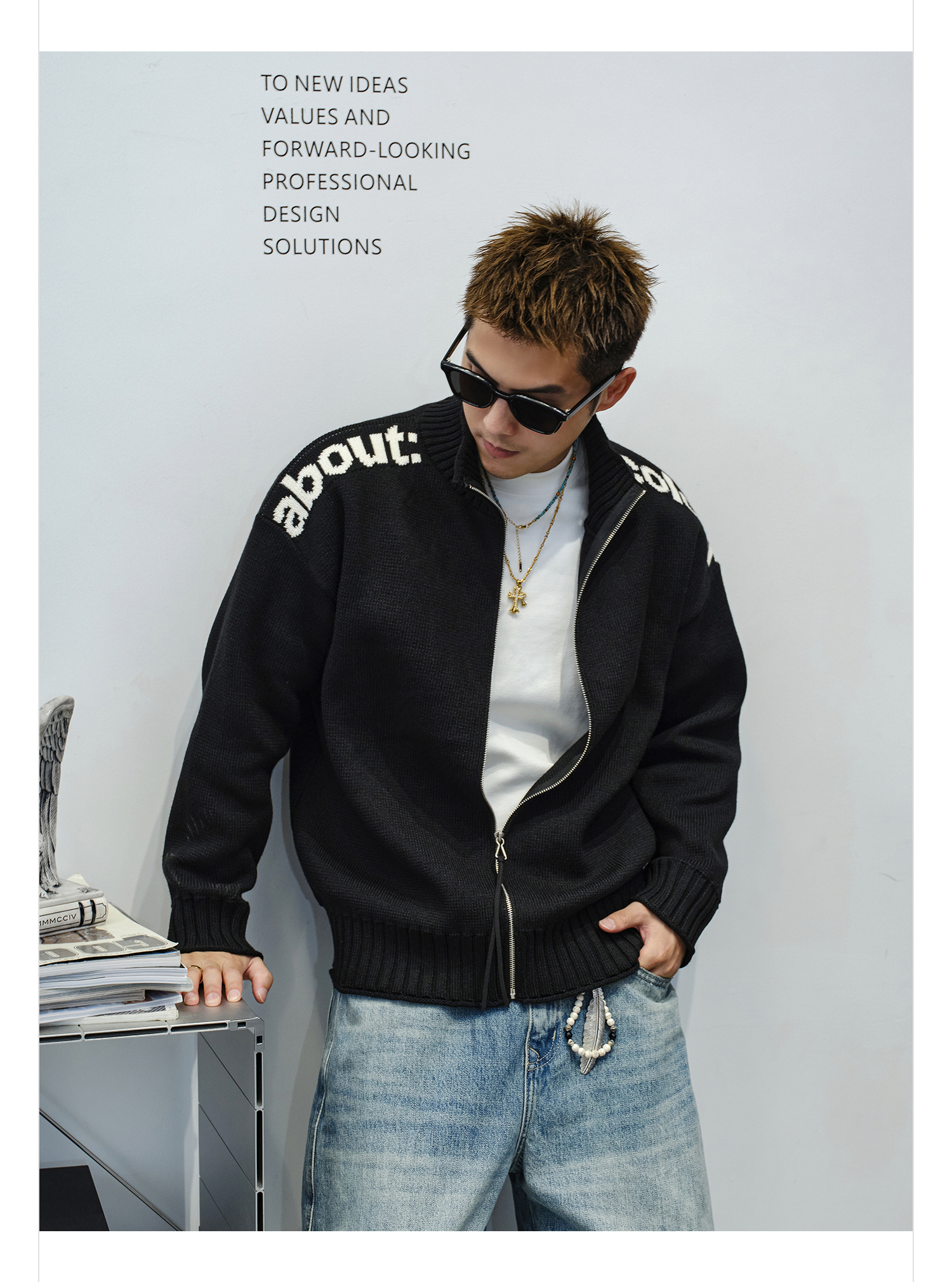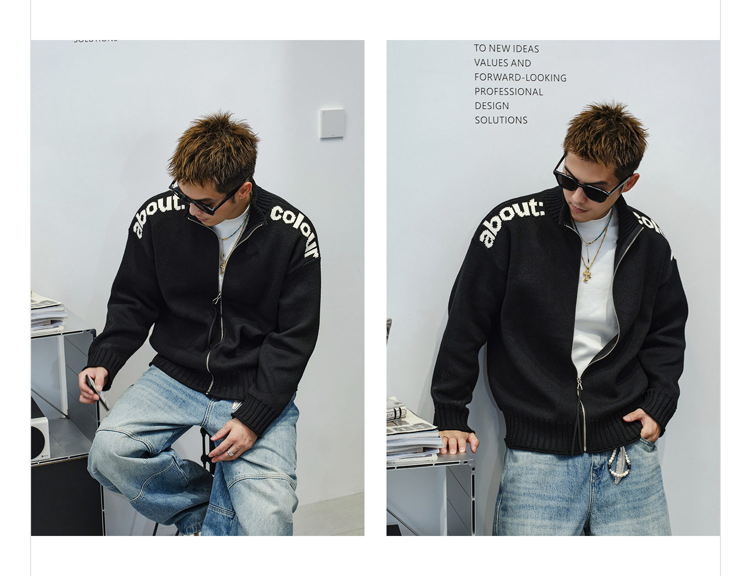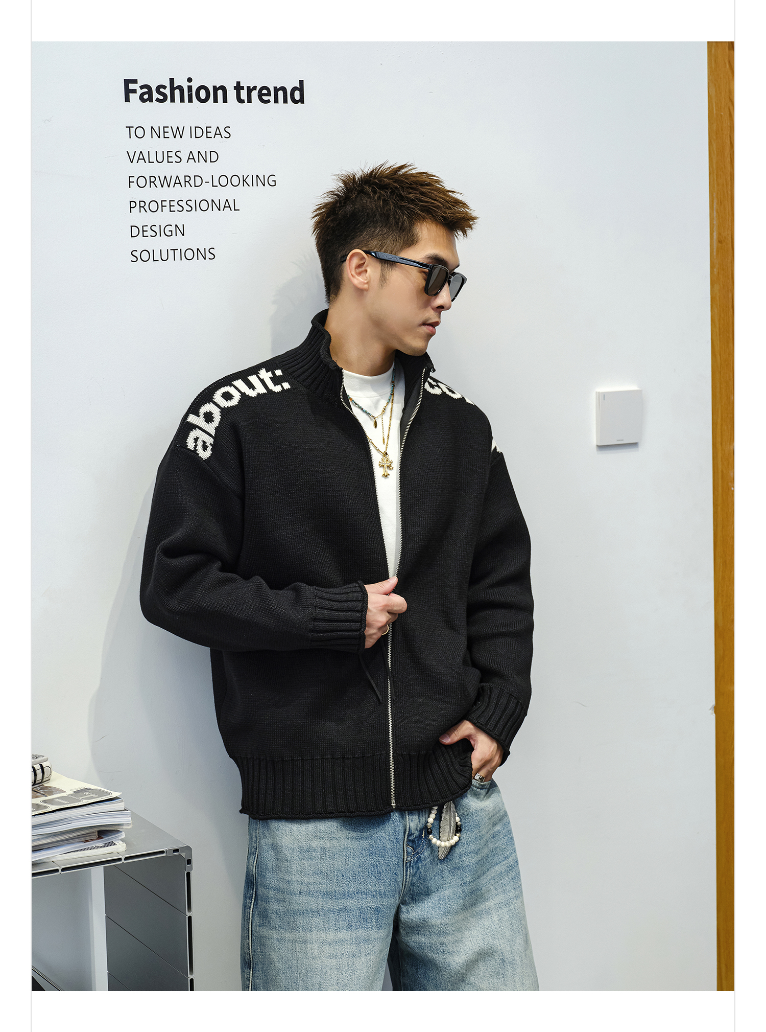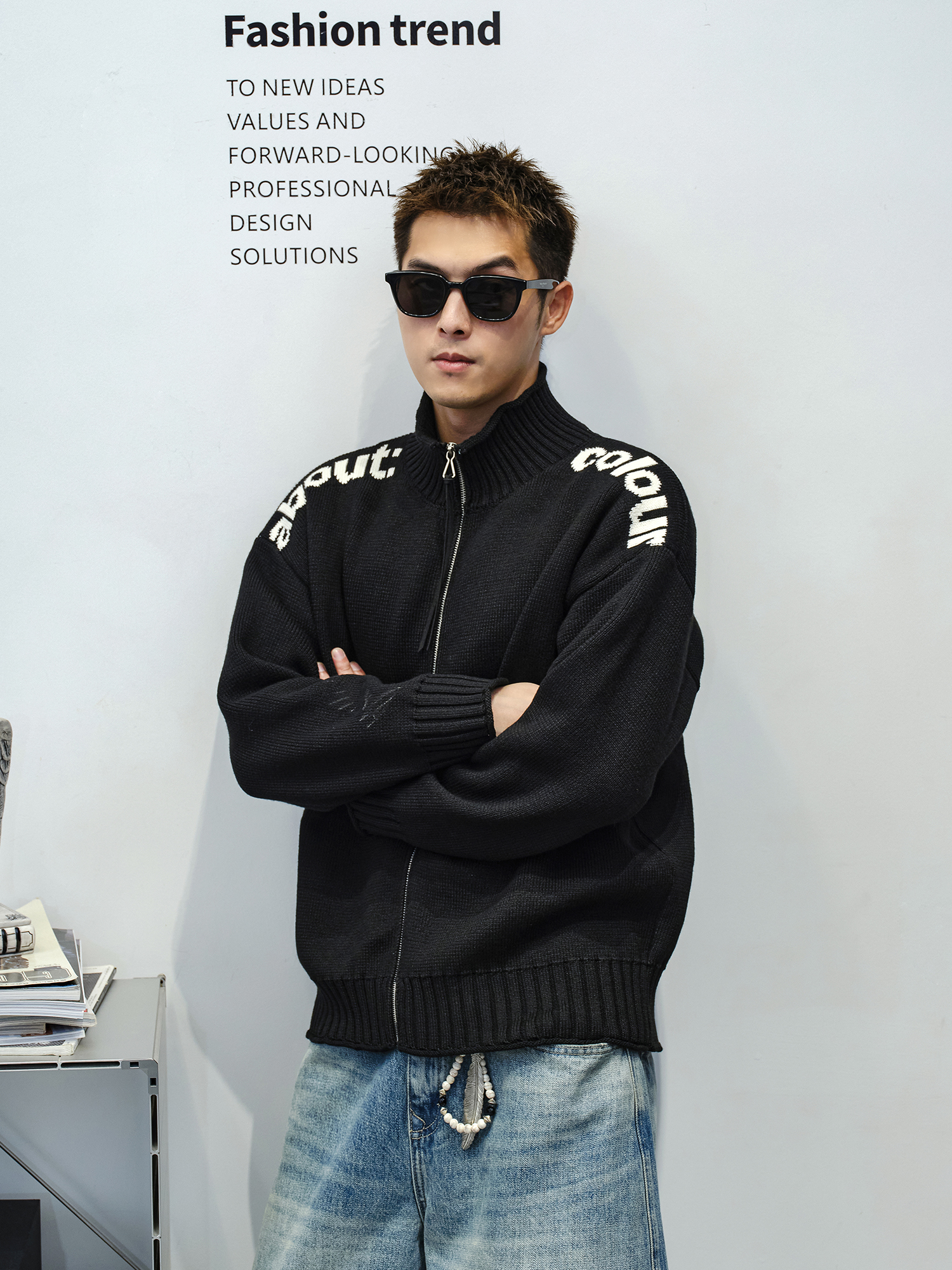 徐太浪【913g重磅 字母提花】黑色开衫毛衣男春秋休闲针织衫外套