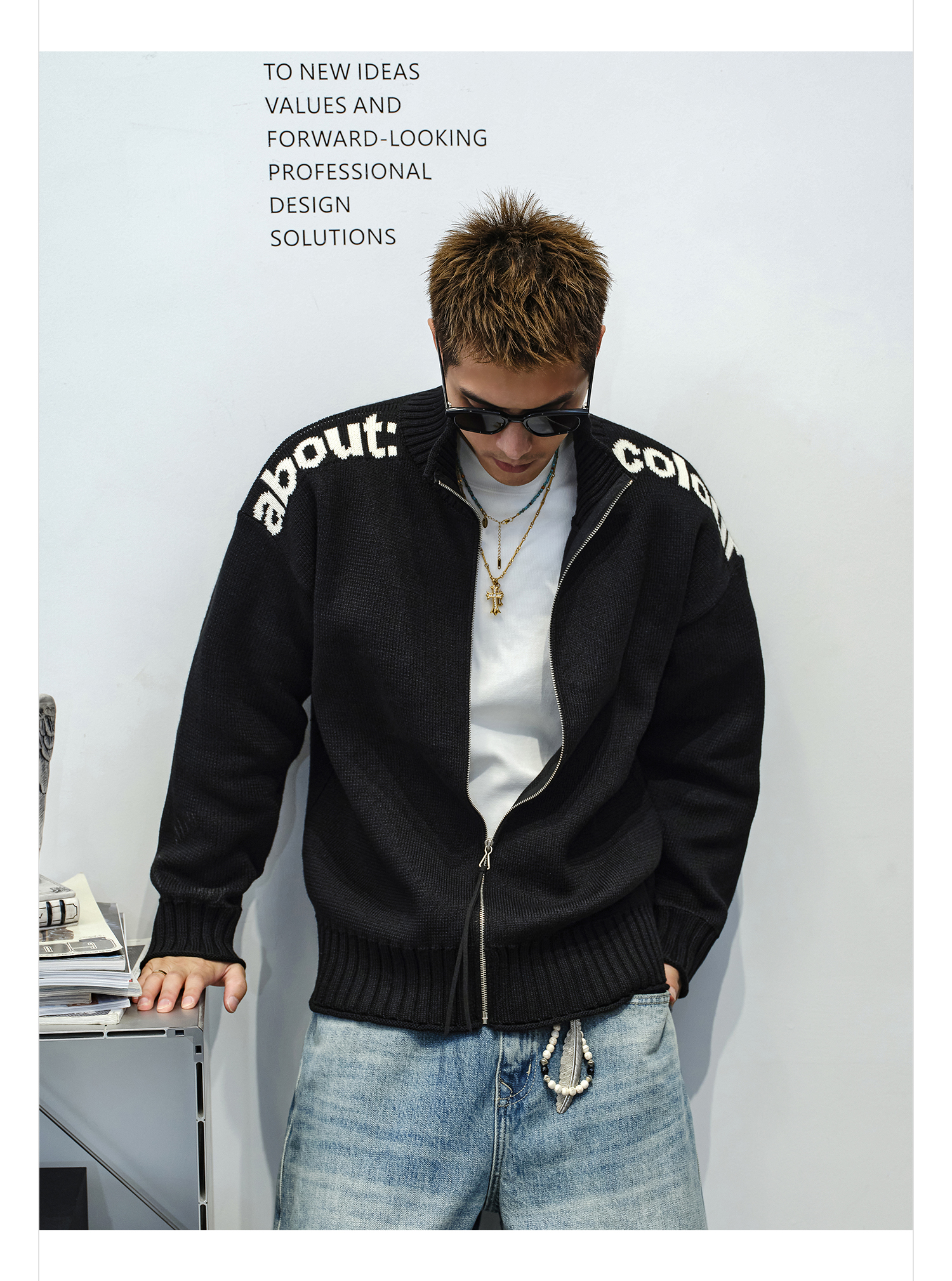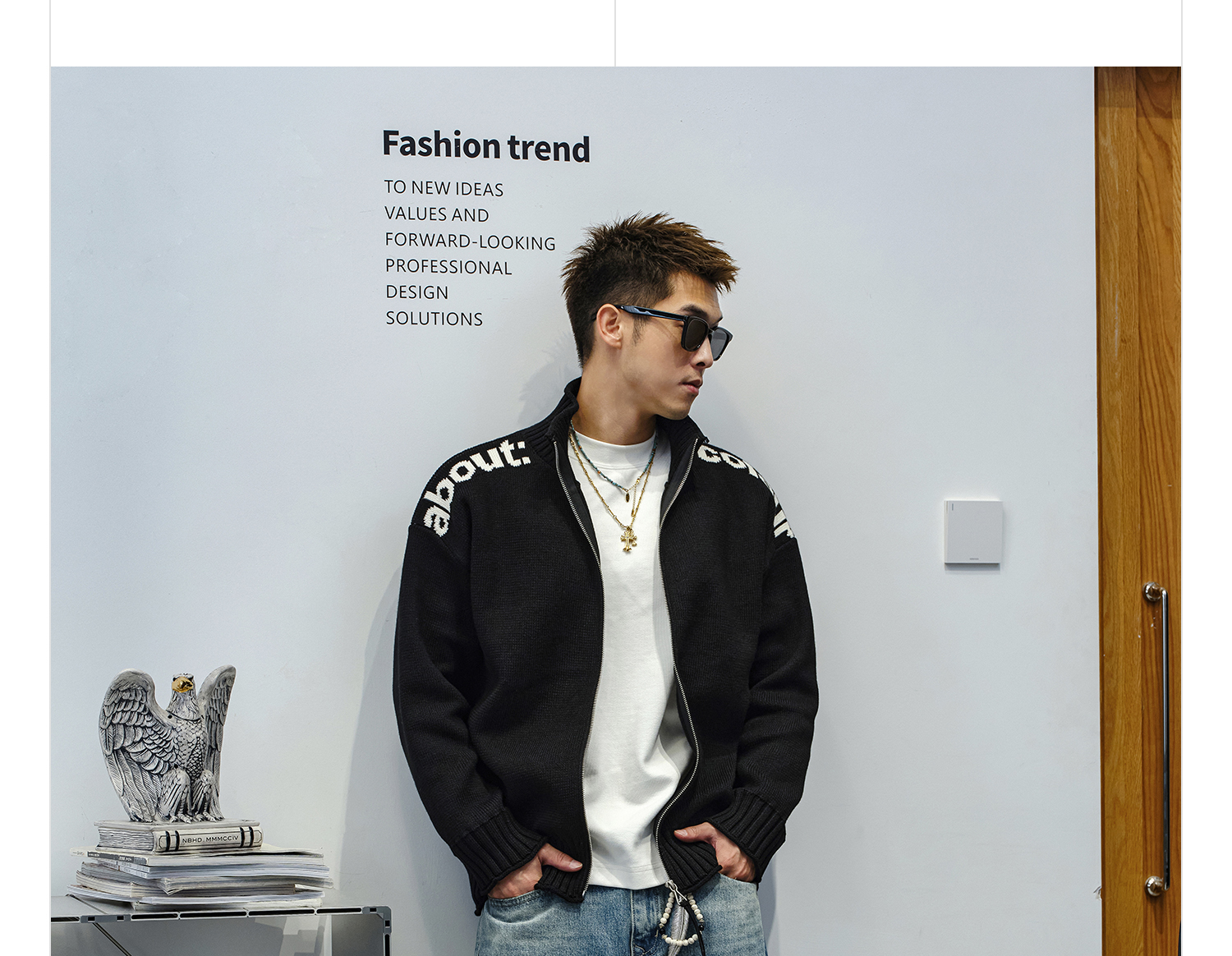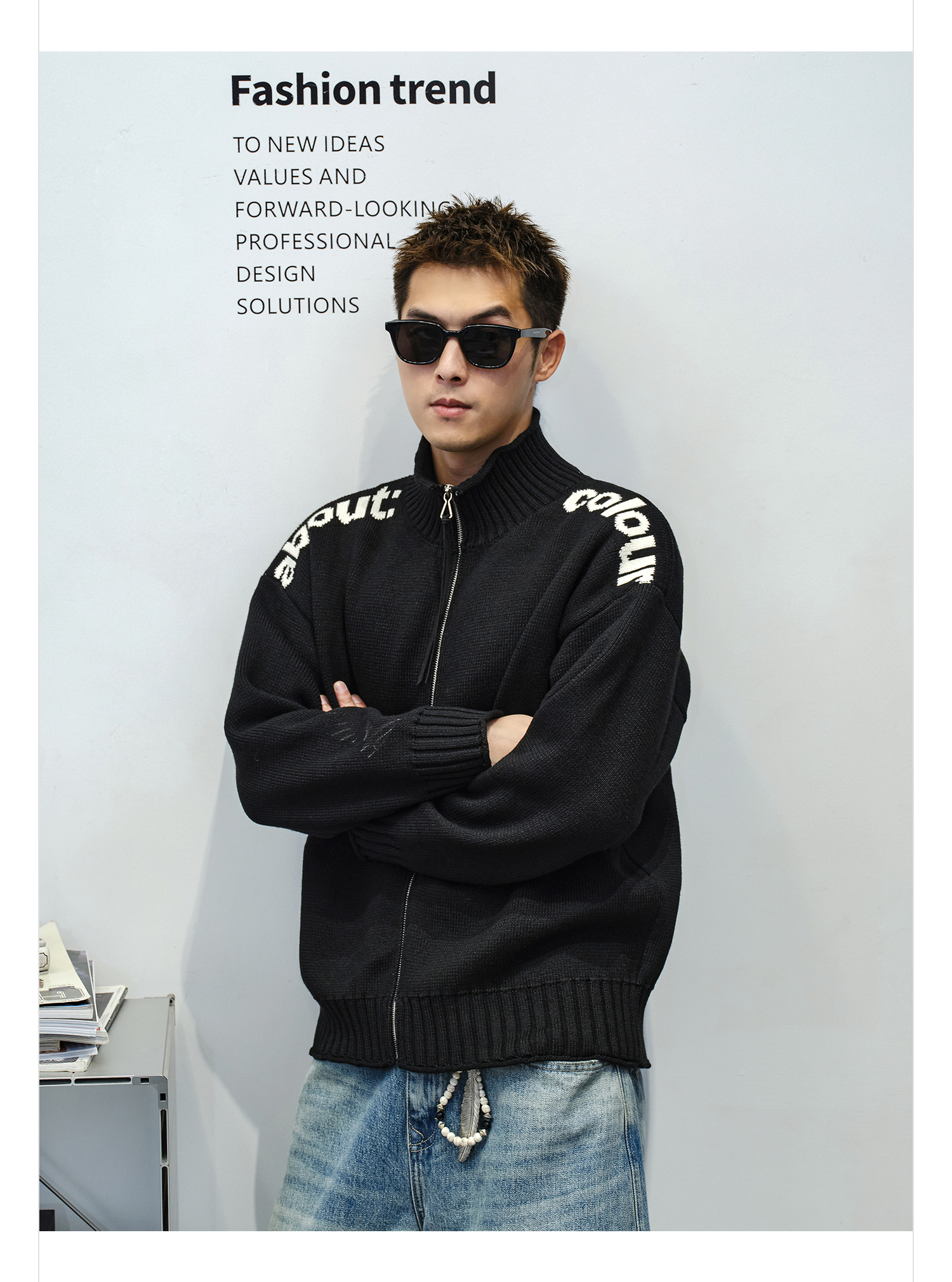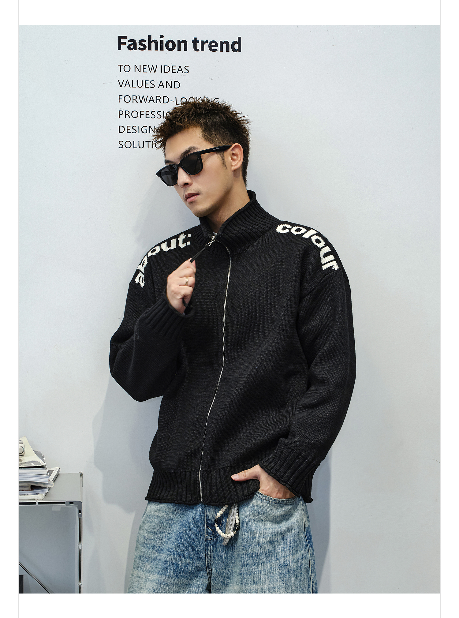 徐太浪【913g重磅 字母提花】黑色开衫毛衣男春秋休闲针织衫外套
