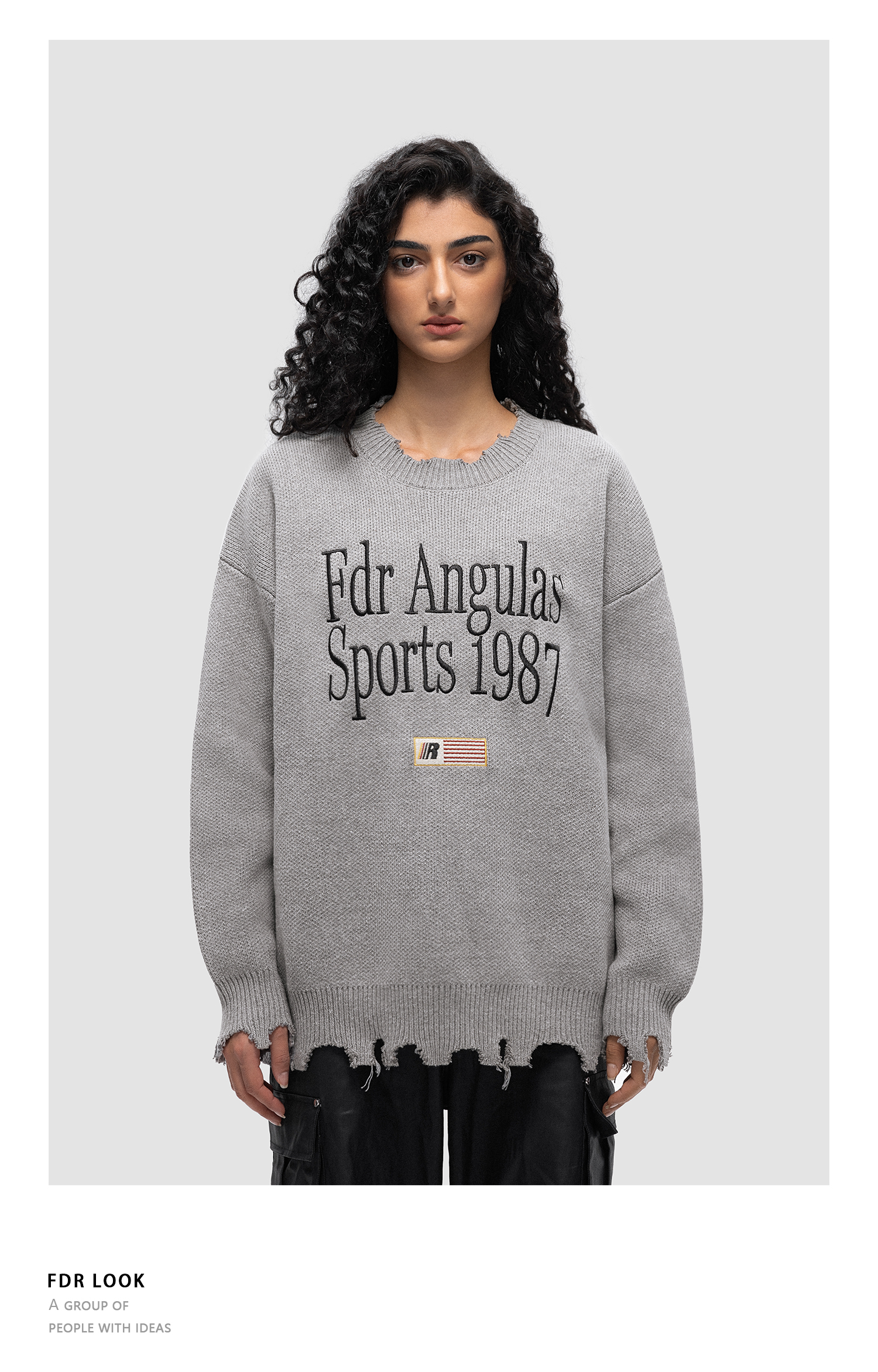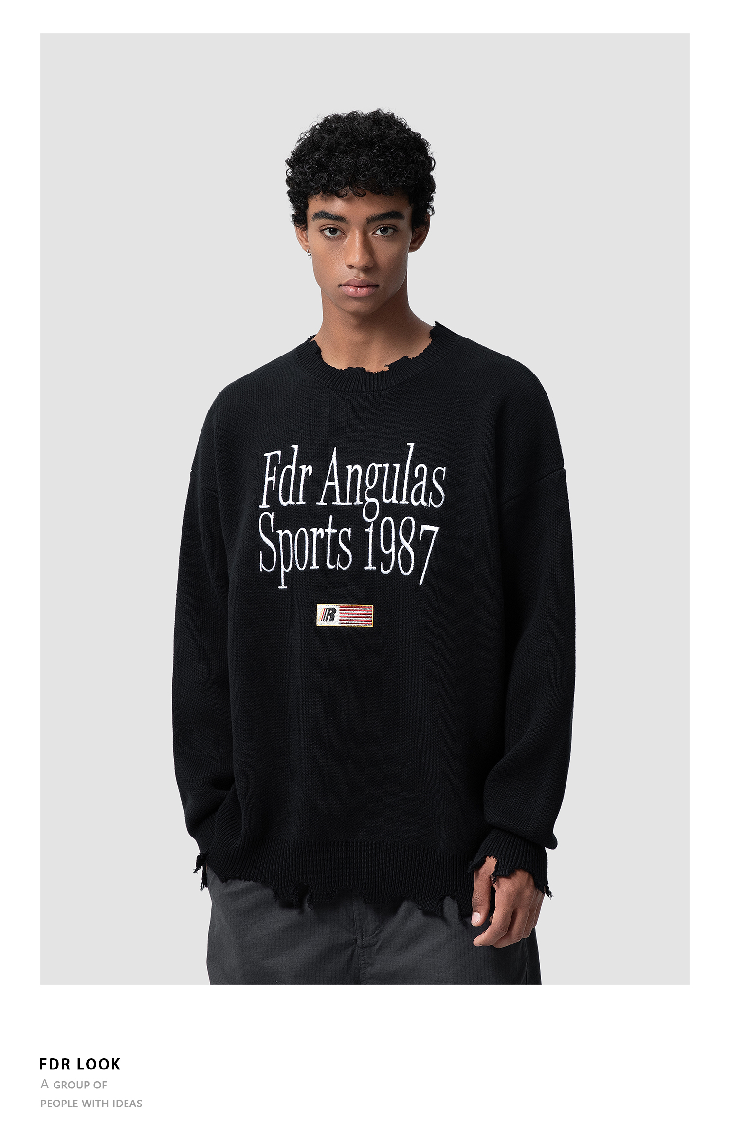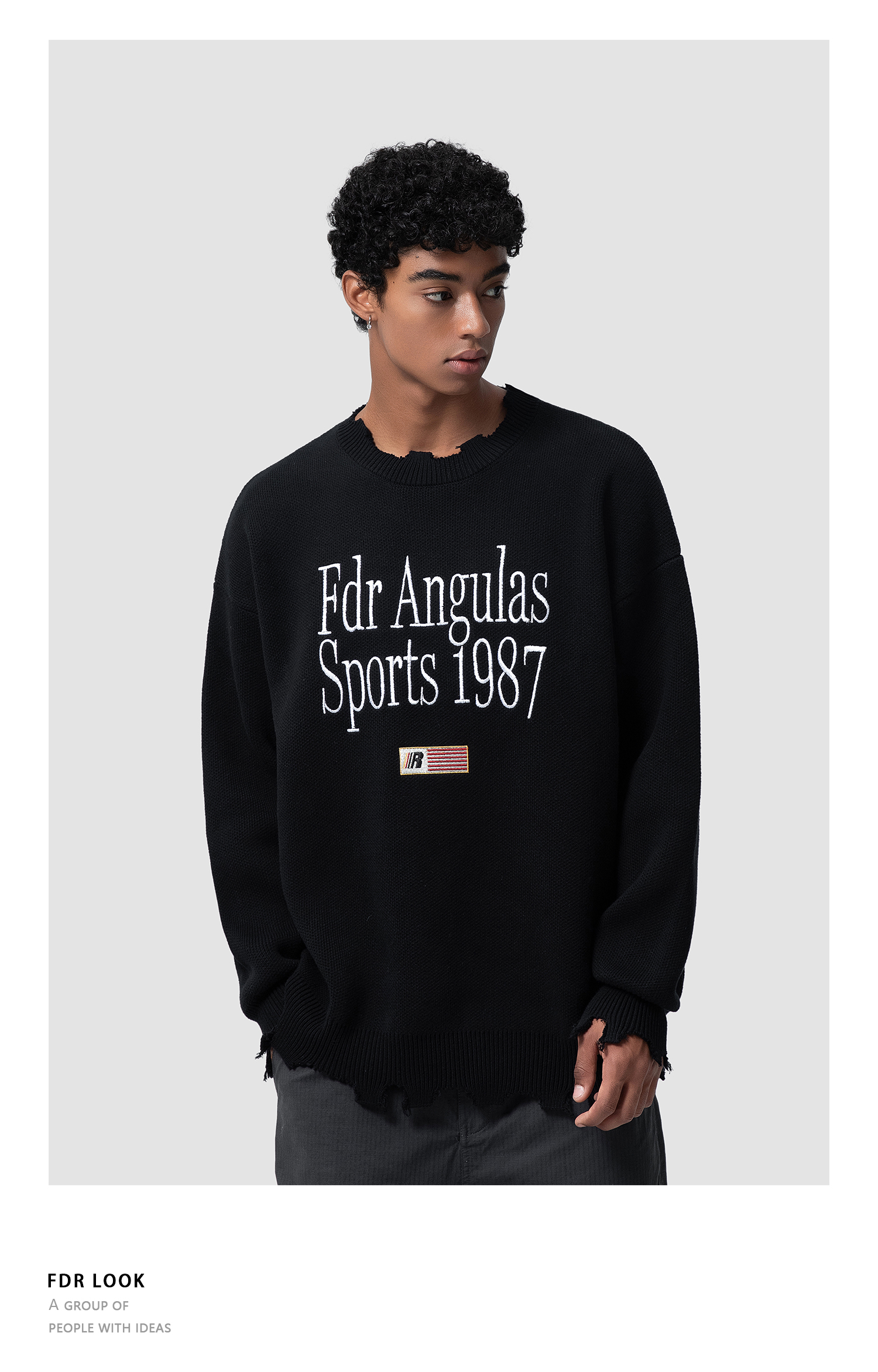 【限时7折】FDR 国潮美式字母图案印花破洞毛衣男女秋冬季高街情侣针织衫上衣