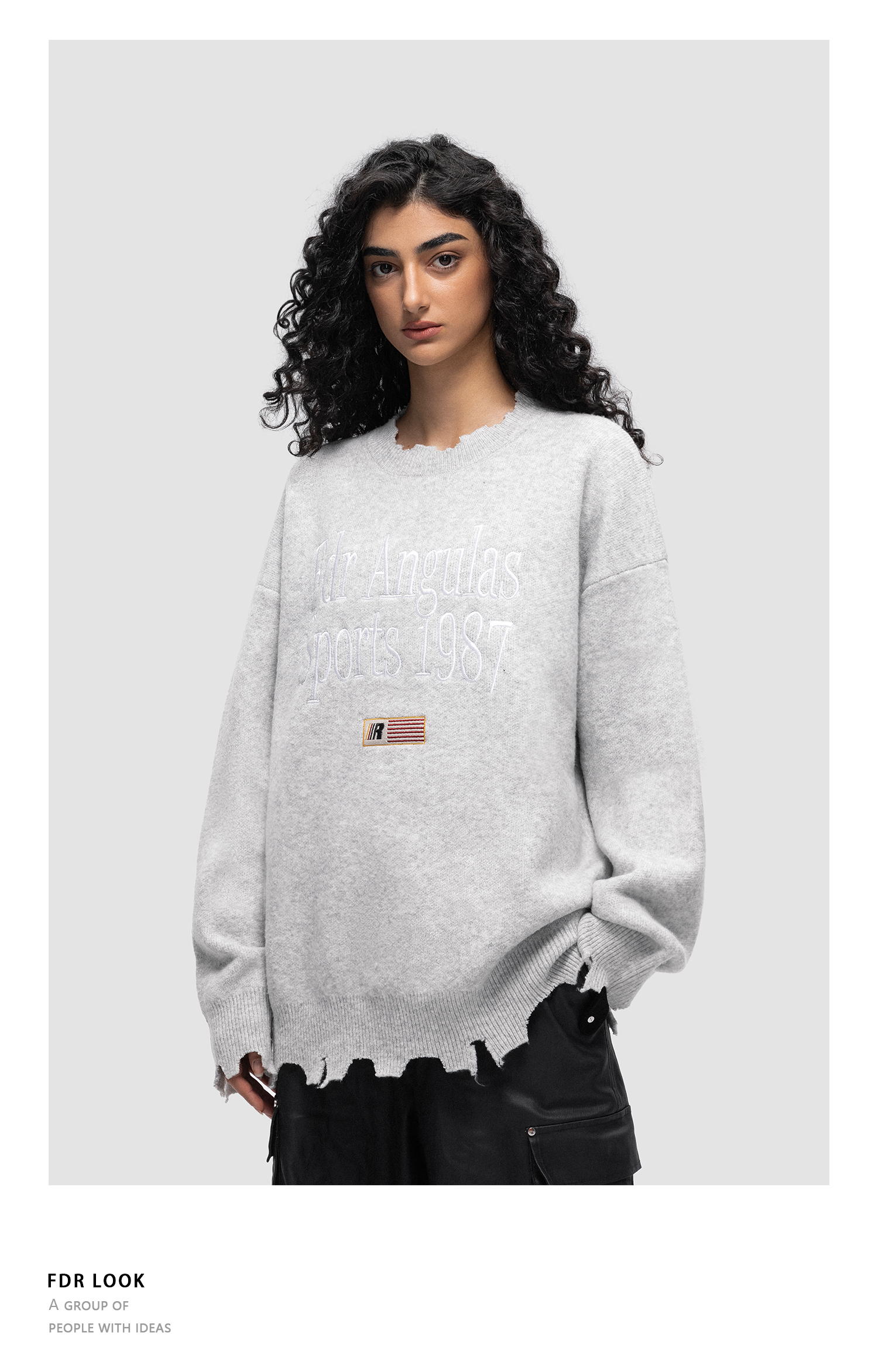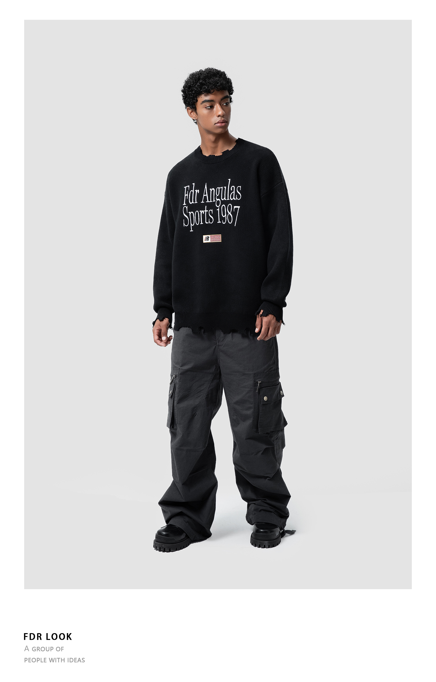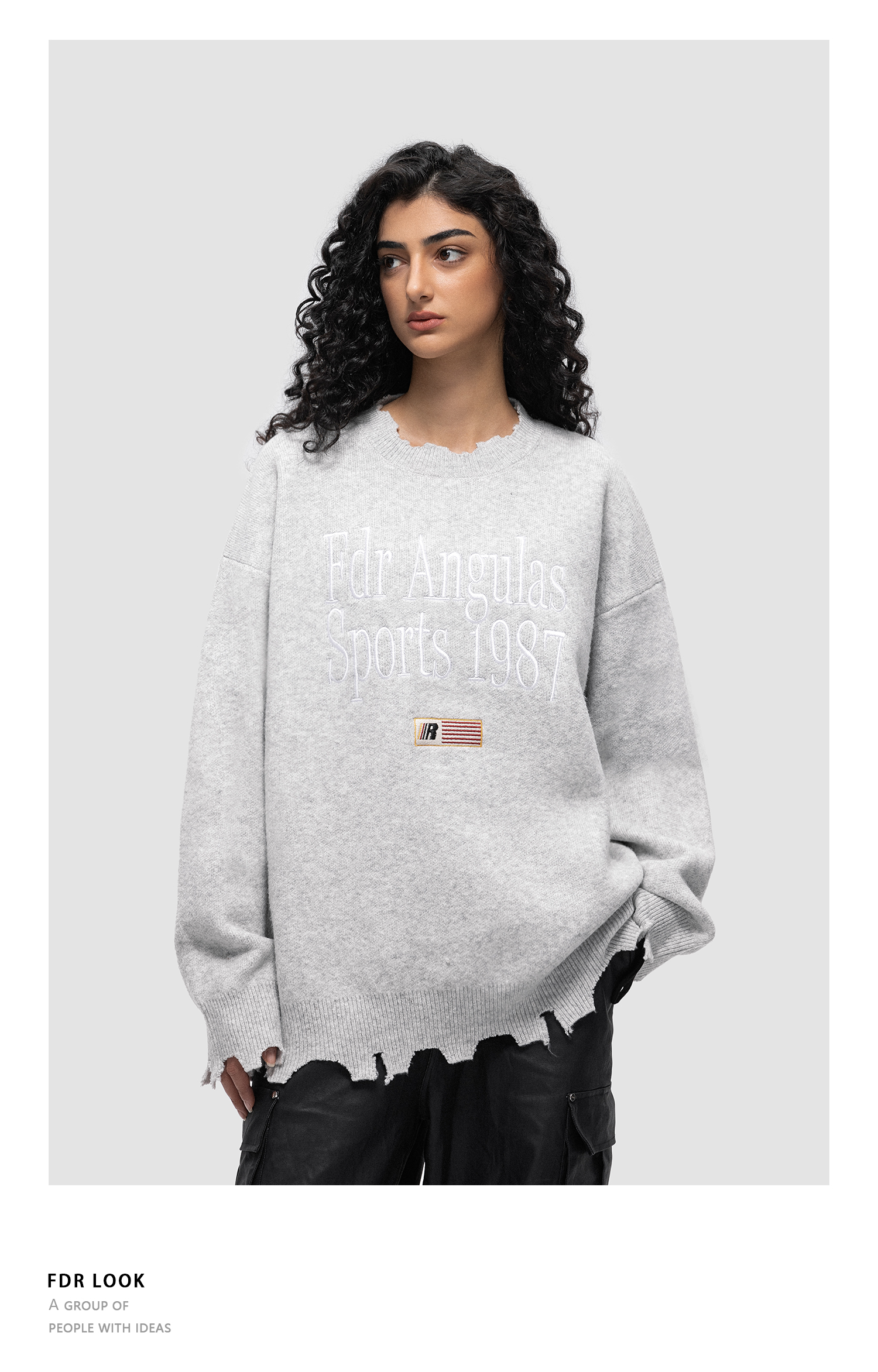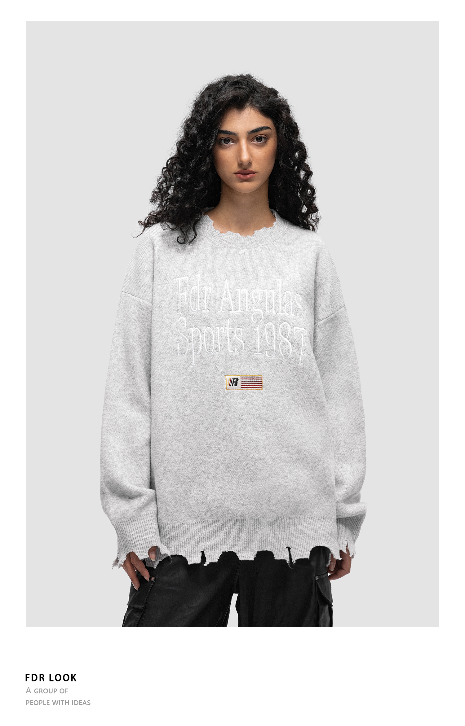 【限时7折】FDR 国潮美式字母图案印花破洞毛衣男女秋冬季高街情侣针织衫上衣