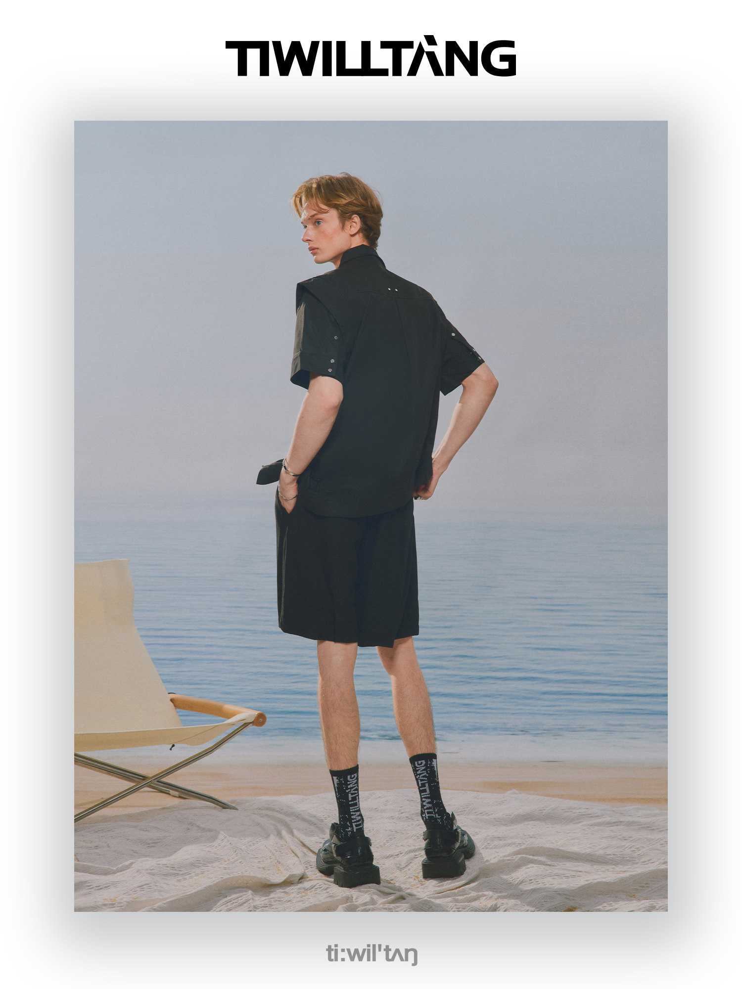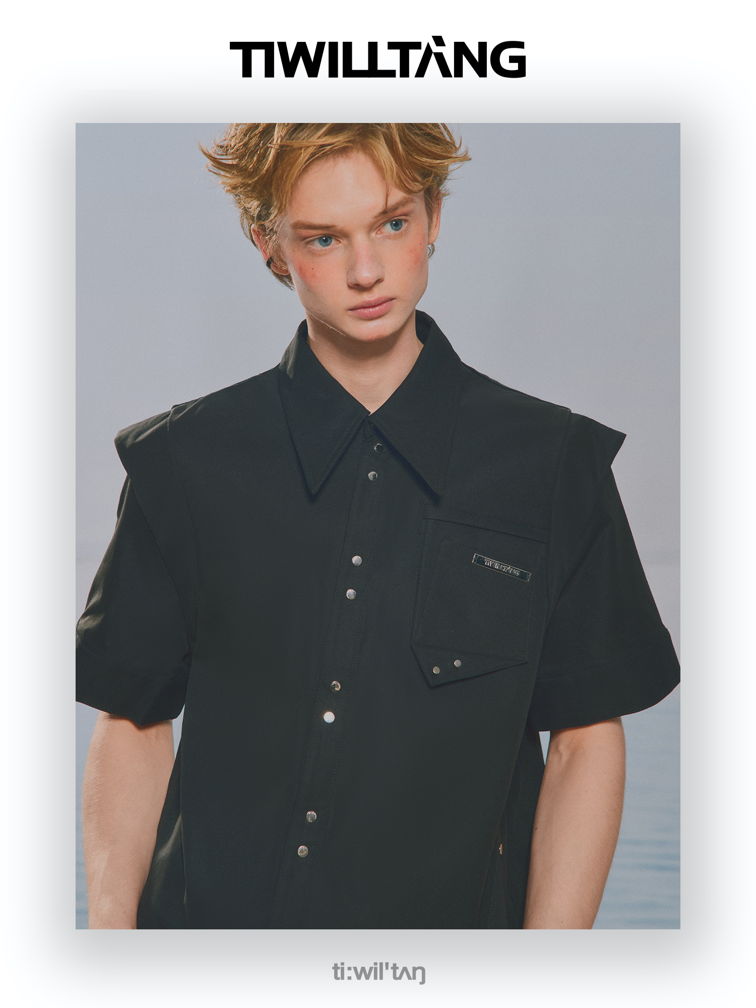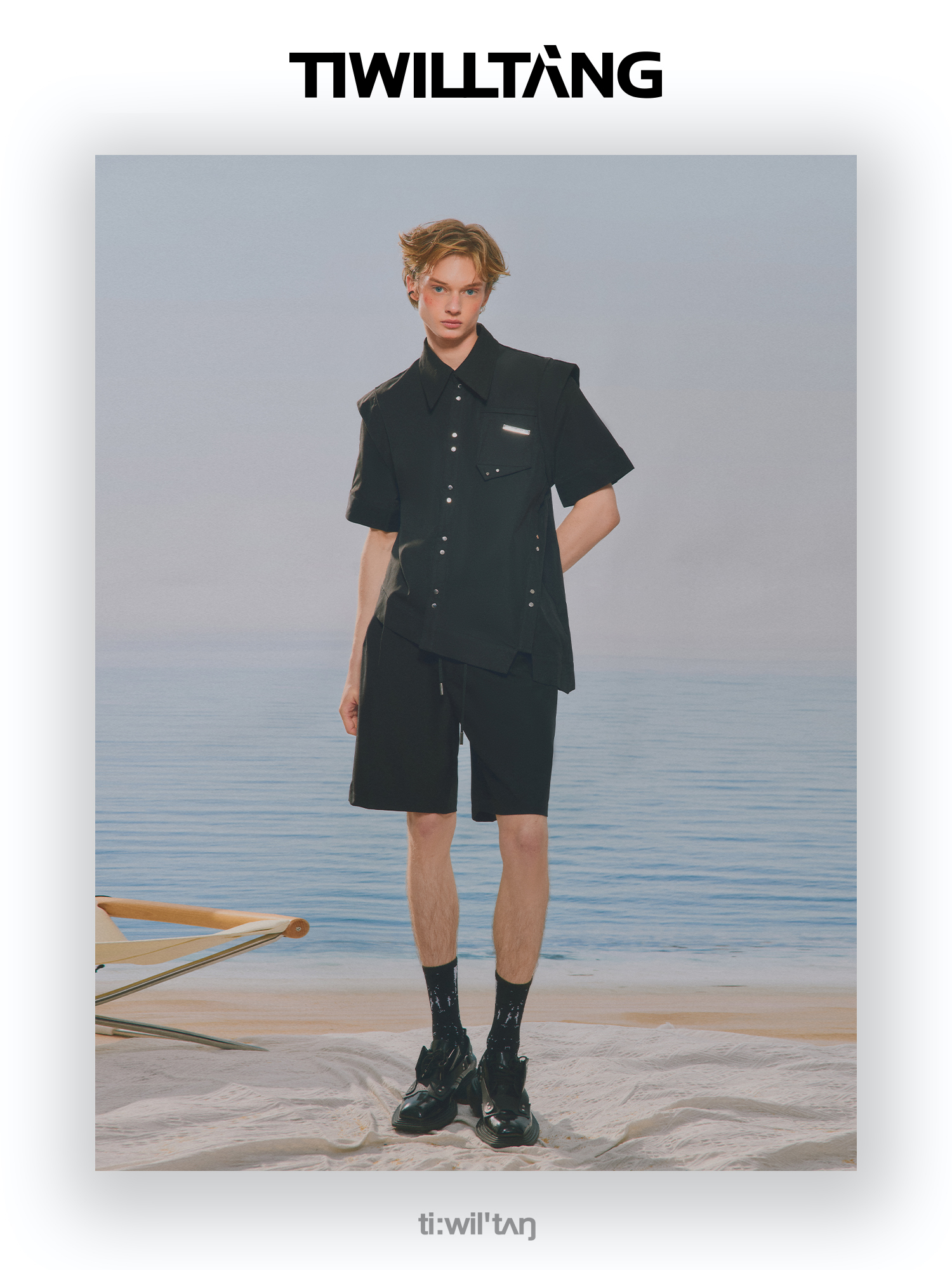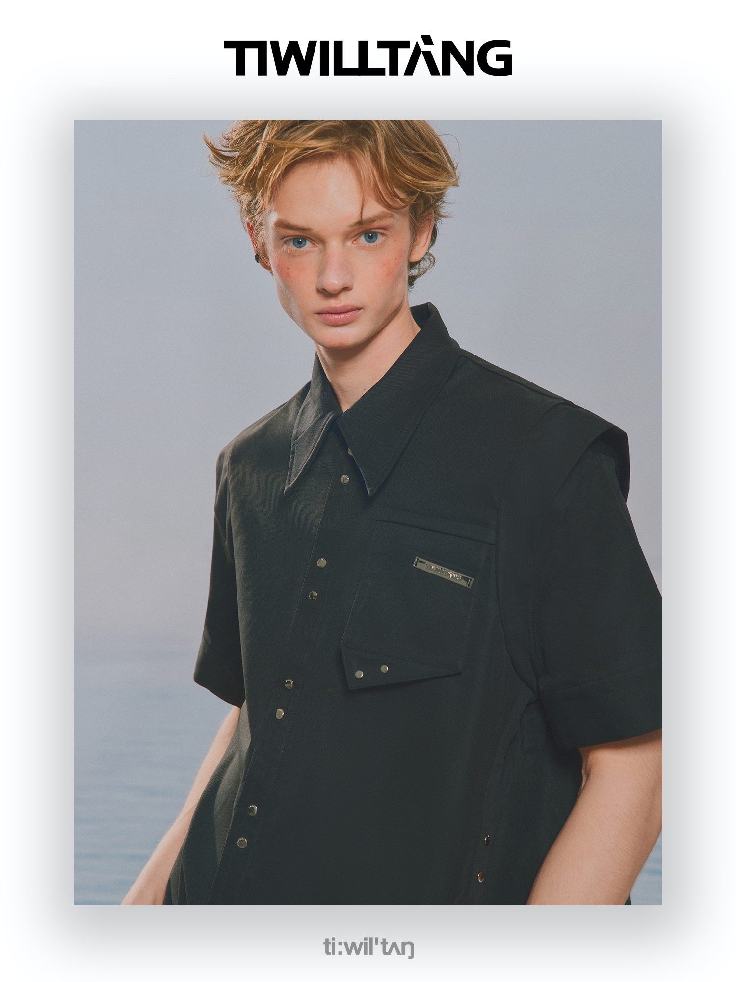 启世录TIWILLTANG“原焐汔制”斜门襟短袖衬衫黑白薄款衬衣修身男