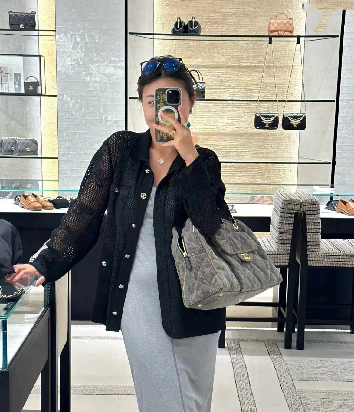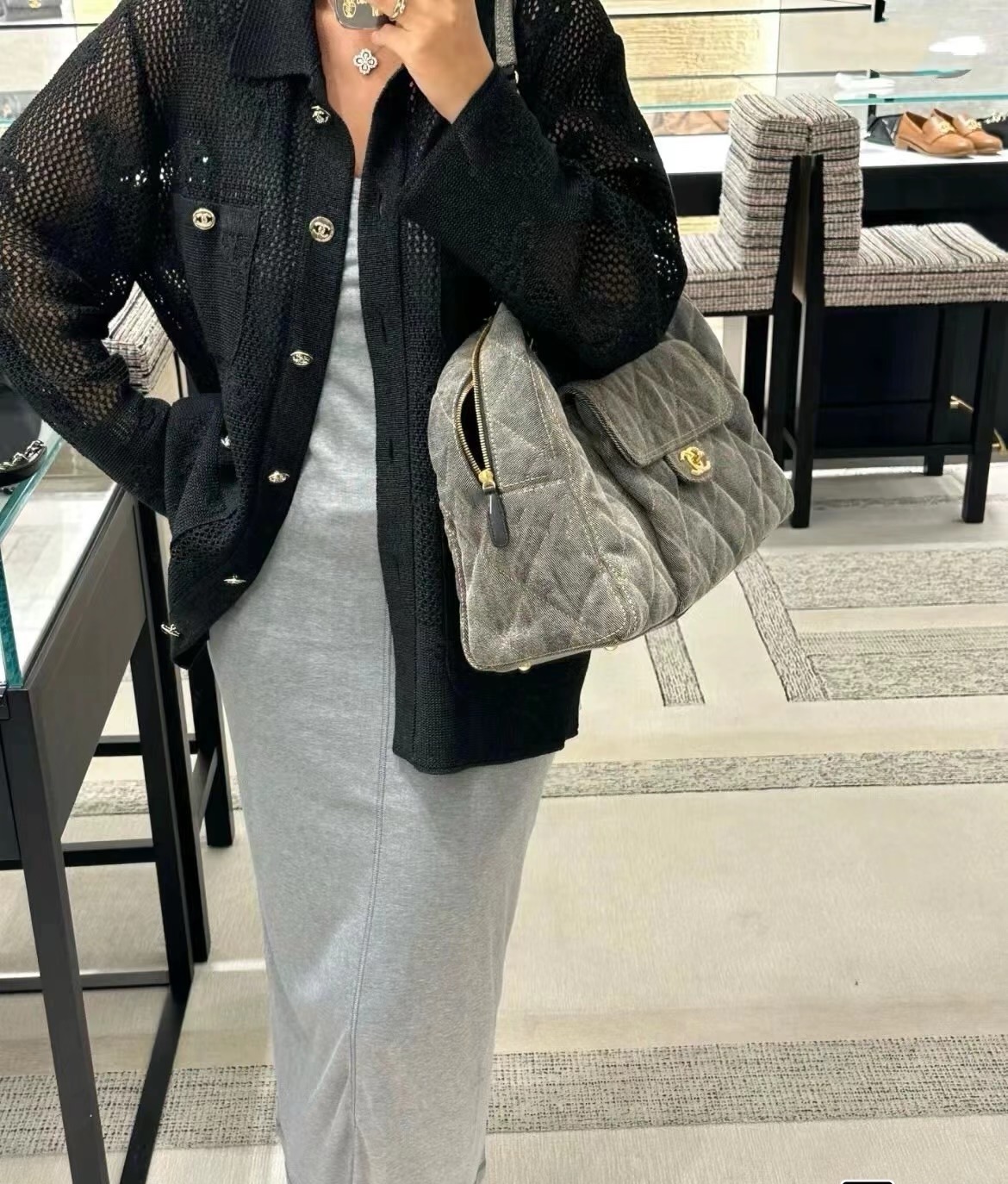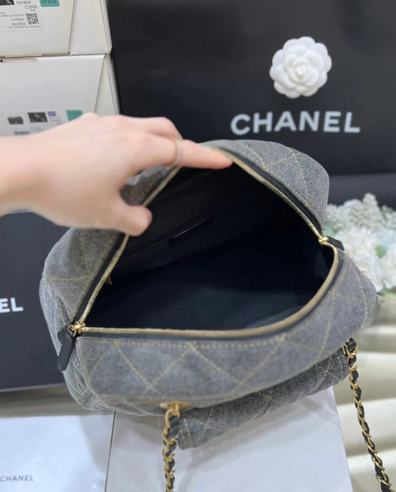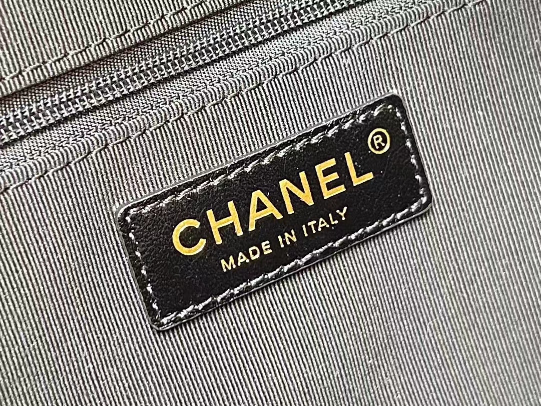 香奈儿 24A 金扣菱格皮穿链品牌Logo标志拉链开合 牛仔布 单肩手提包 小号 女款 灰色