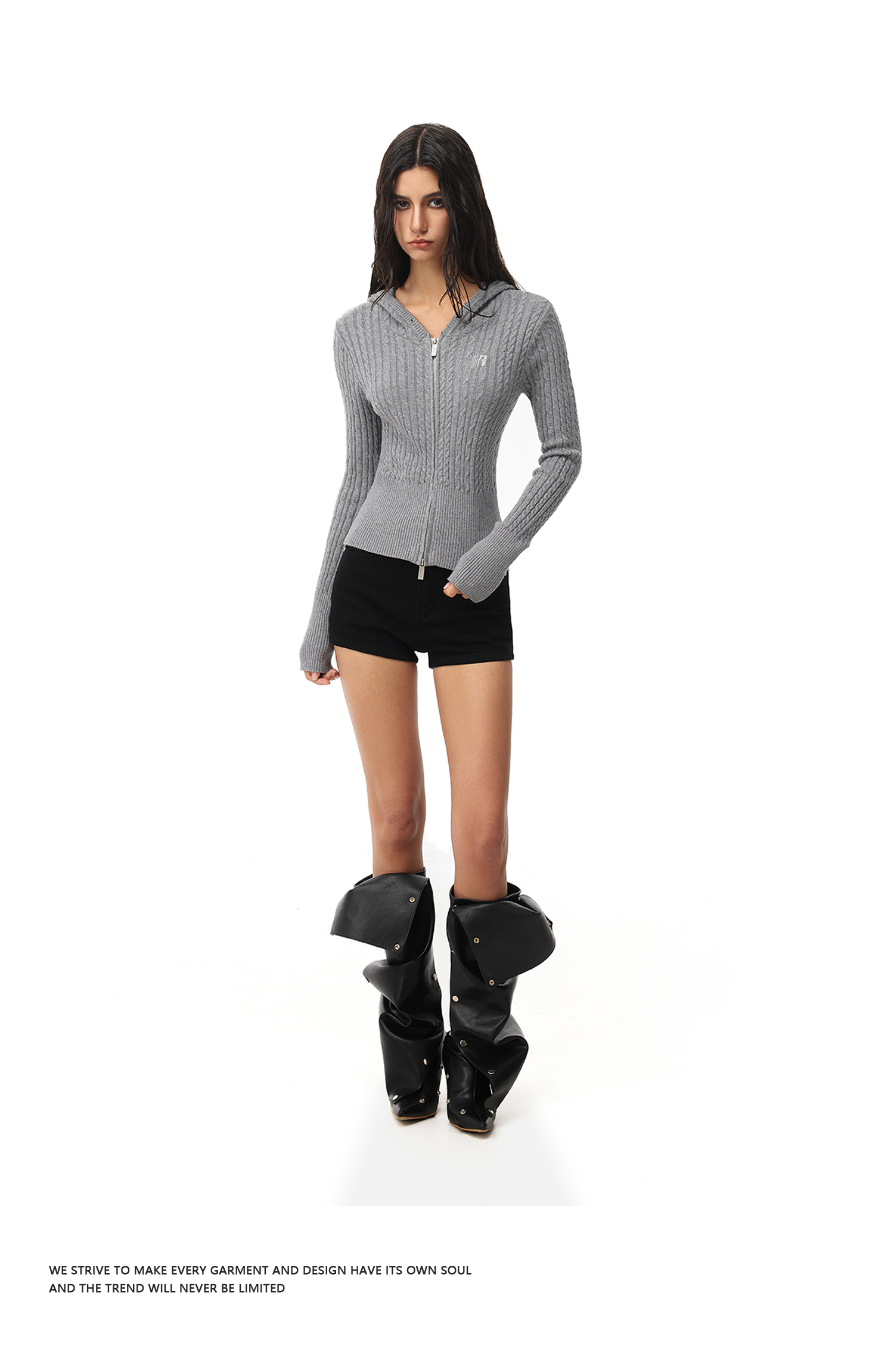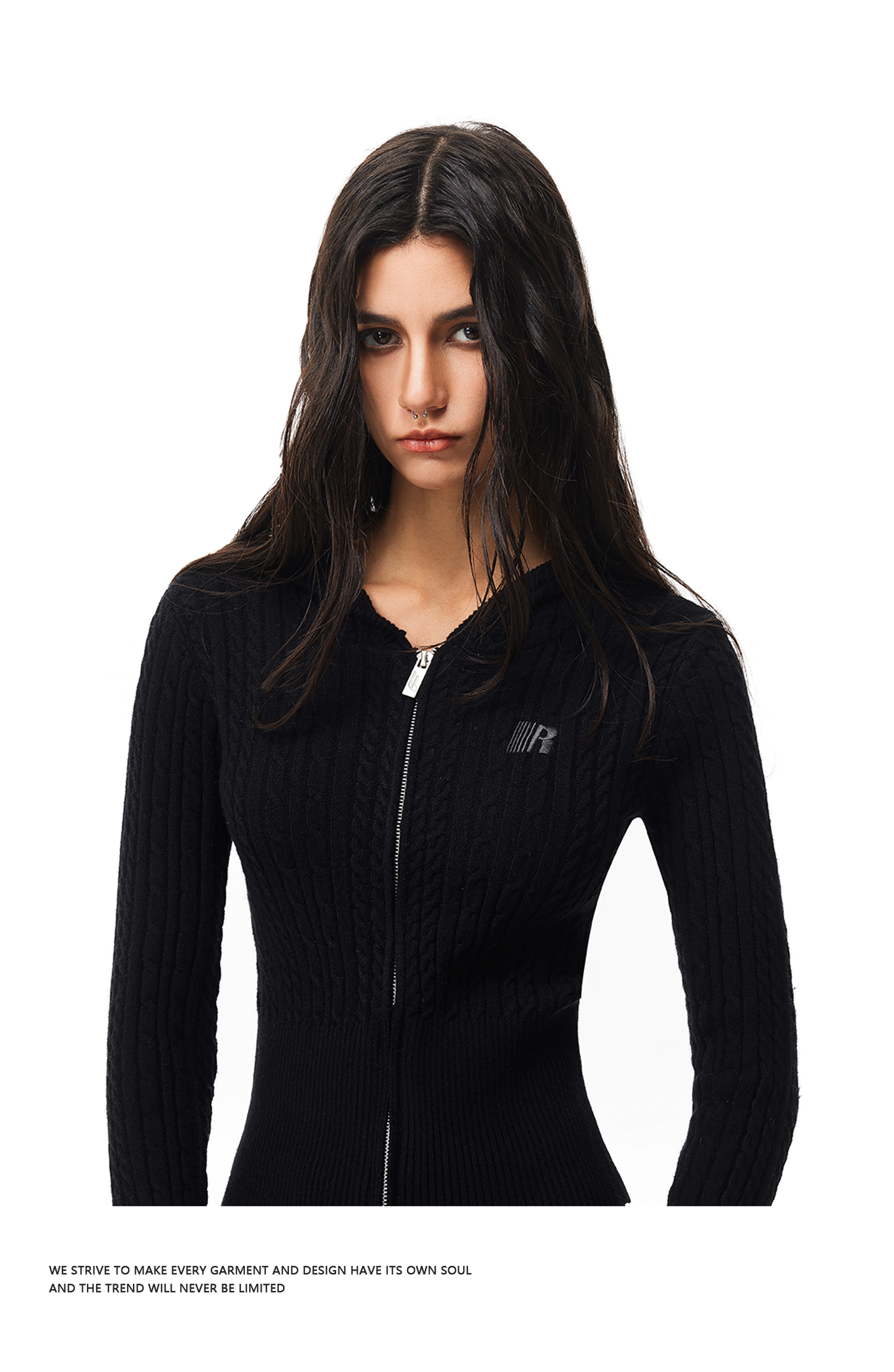FDR官方店 复古绞花纹连帽针织衫女春季修身显瘦拉链开衫上衣外套