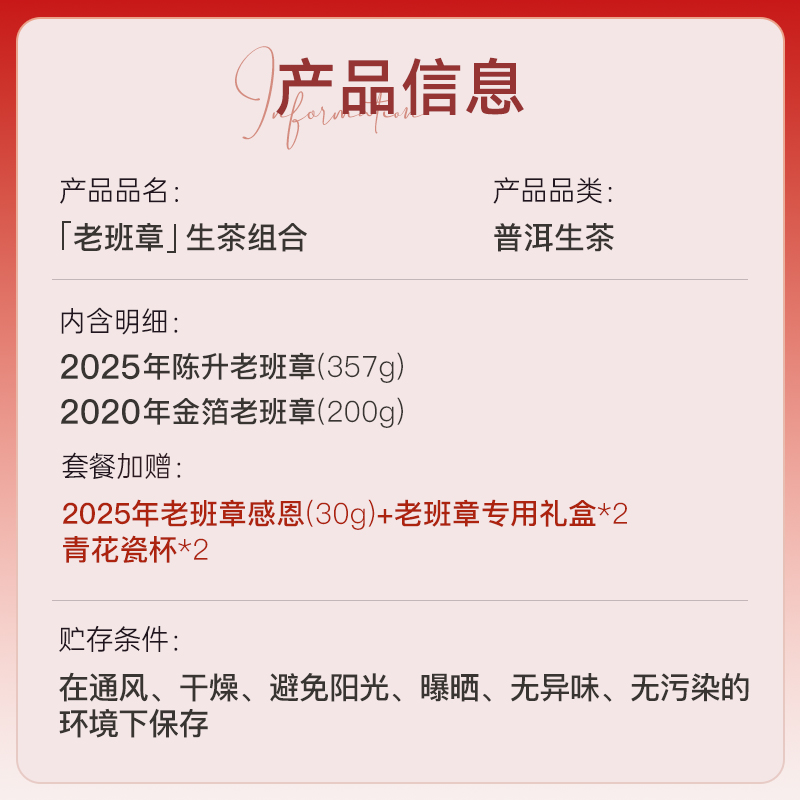 【老班章套餐】陈升号 2025年陈升老班章357g+2020年金箔老班章200g加赠老班章感恩30g单罐+青花瓷杯2个+老班章礼盒