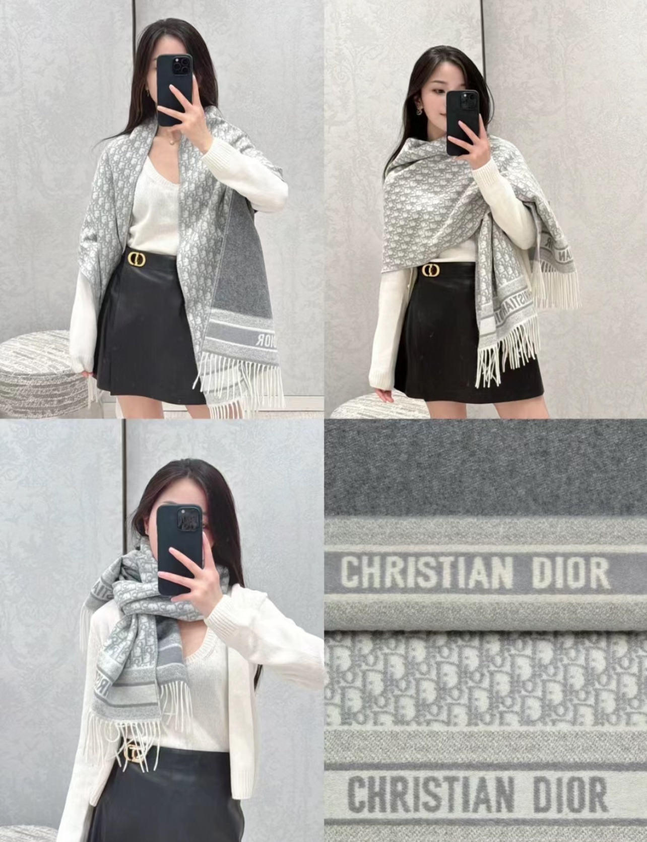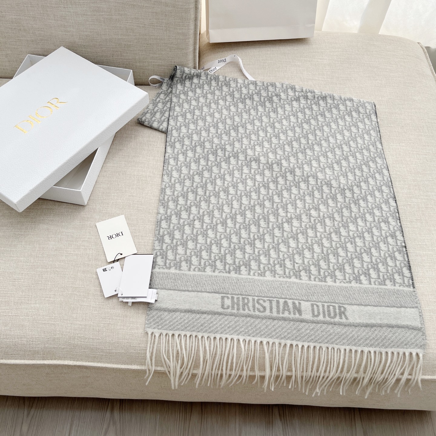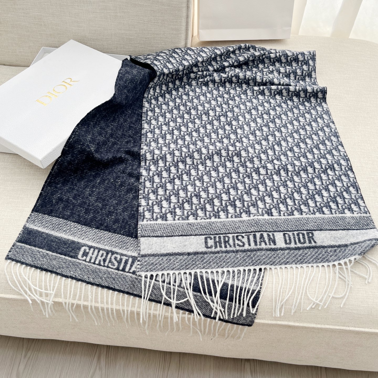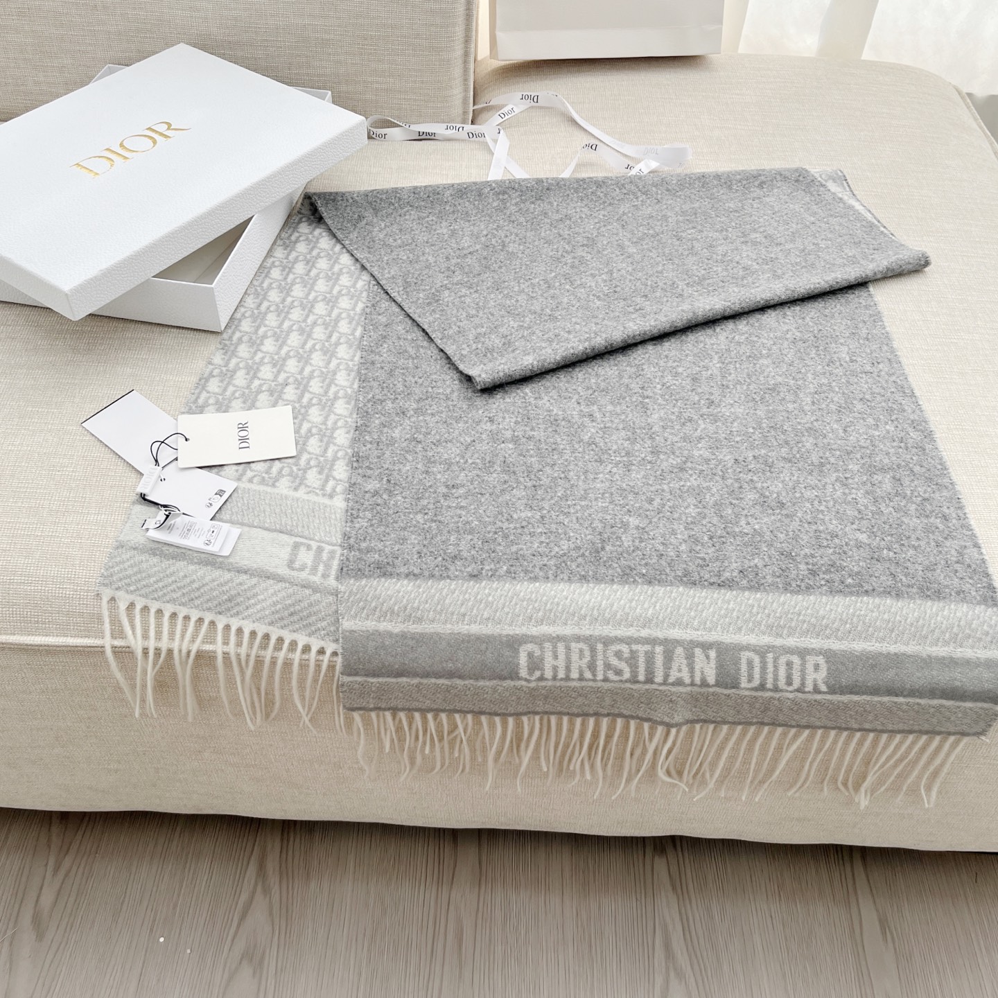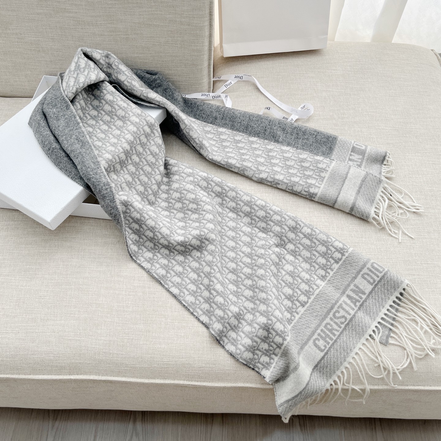 𝐃𝐈𝐎𝐑 · 【D家双面披肩】浅灰色 Size:45x200cm 材质:100%山羊绒 D家元素满满,克重手感顶级,顶级面料 精准进口机字母提花;一面纯色+一面经典Oblique字母 双面对比鲜明 可以做披肩的围巾 温暖整个冬天时尚感满屏 小姐姐时尚必备神器,让这个季节带着自信出门!