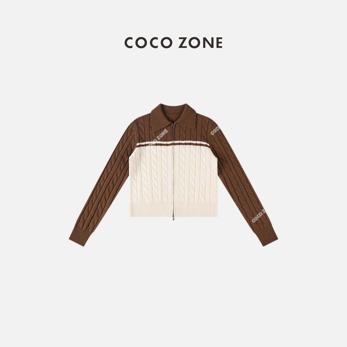COCO ZONE 100%羊毛秋款POLO领拉链撞色拼接针织衫上衣 23C29614