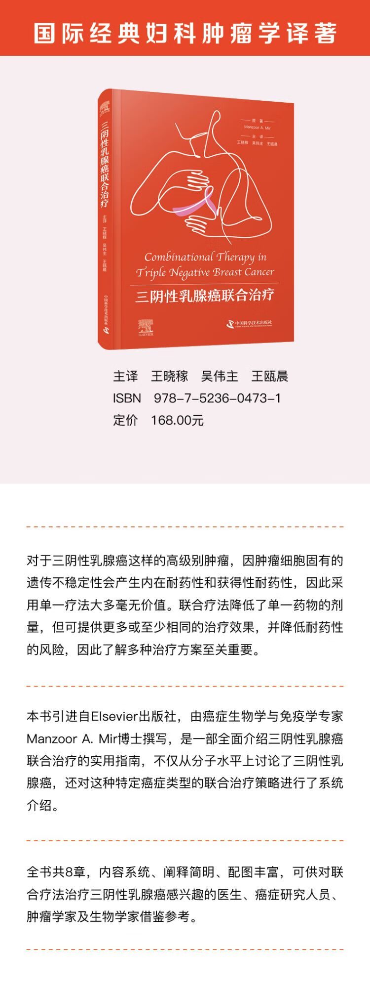 本书引进自 Elsevier 出版社,由癌症生物学与免疫学专家 Manzoor A. Mir 博士撰写,是一部全面介绍三阴性乳腺癌联合治疗的实用指南,不仅从分子水平上讨论了三阴性乳腺癌,还对这种特定癌症类型的联合治疗策略进行了系统介绍。对于三阴性乳腺癌这样的高级别肿瘤,因肿瘤细胞固有的遗传不稳定性会产生内在耐药性和获得性耐药性,因此采用单一疗法大多毫无价值。联合疗法降低了单一药物的剂量,但可提供更多或至少相同的治疗效果,并降低耐药性的风险,因此了解多种治疗方案至关重要。全书共 8 章,内容系统、阐释简明、配图丰富,可供对联合疗法治疗三阴性乳腺癌感兴趣的医生、癌症研究人员、肿瘤学家及生物学家借鉴参考。