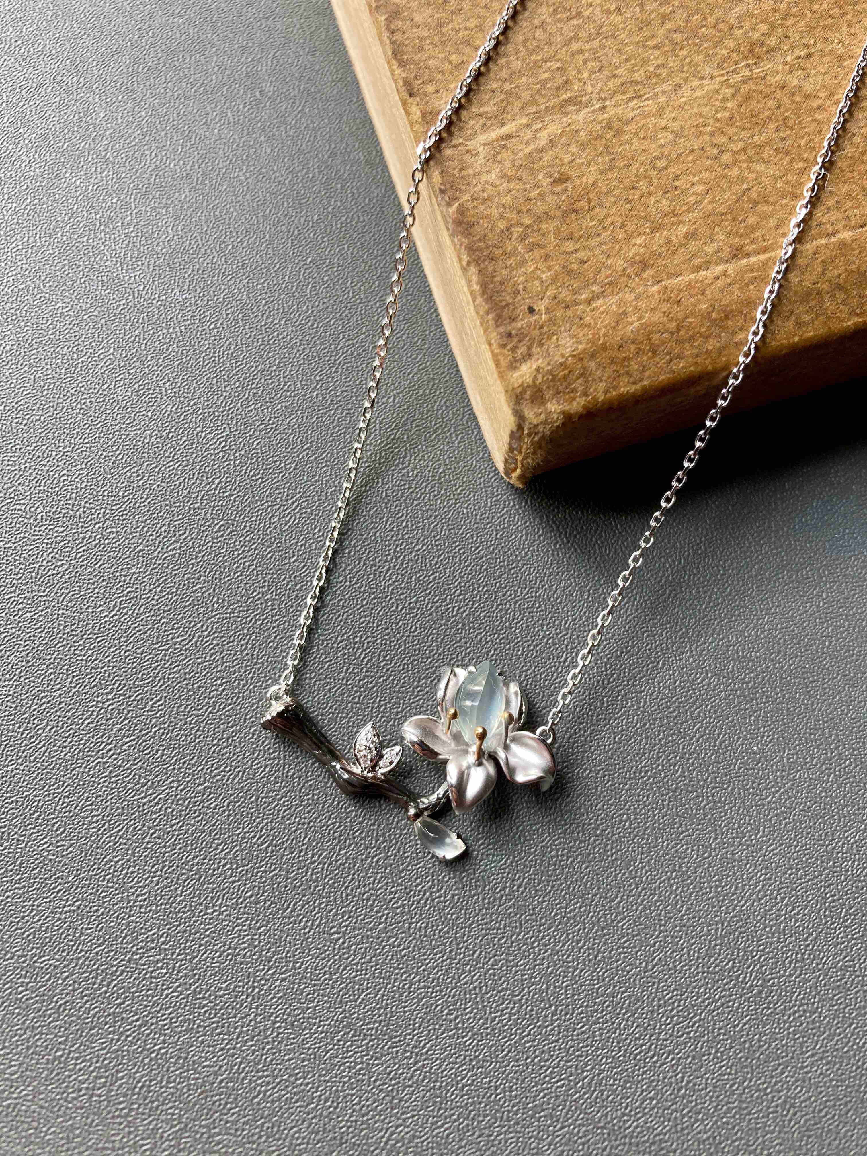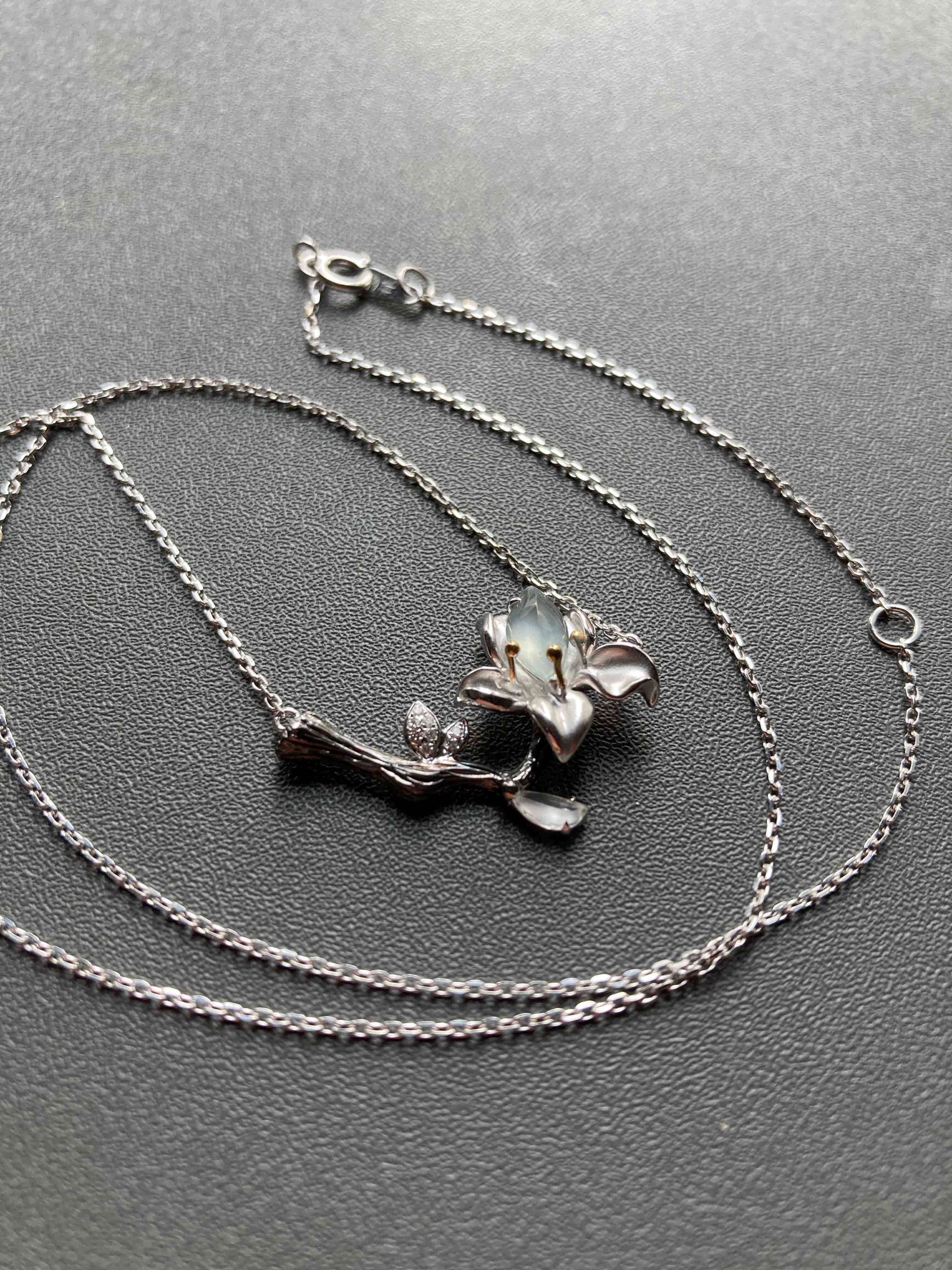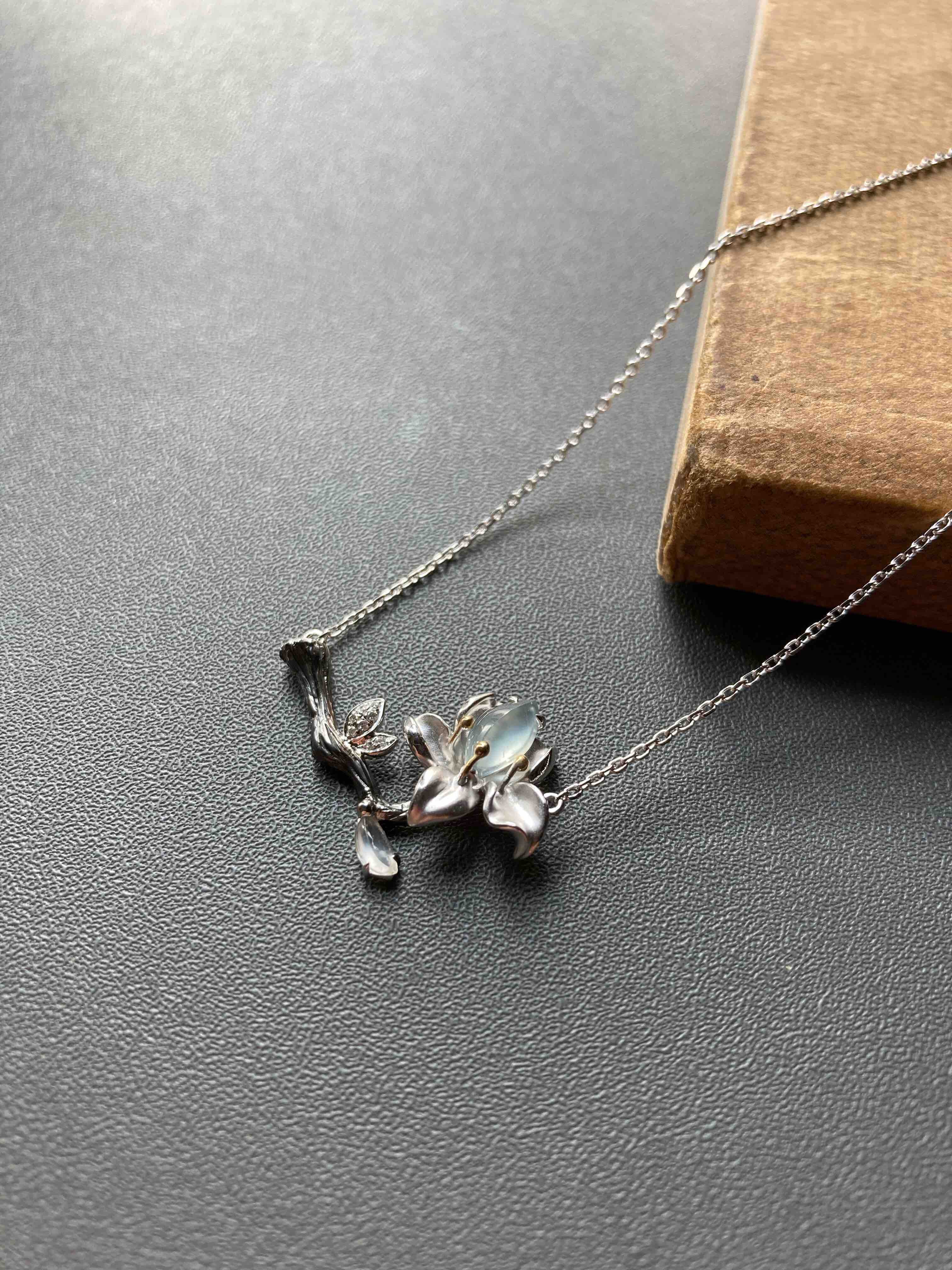 见过玻璃种的梅花,你一定没有见过玻璃种的兰花翡翠项链,真正的设计师原创系列,高级定制珠宝的制作工艺,看这花瓣和花心的细节充满雕塑感的设计,简直是一件艺术品,花瓣的玻璃种翡翠 品质非常棒,强刚性表现,荧光四射。镶嵌后25.5×16.1×5.2mm,链长40cm加5cm延长链