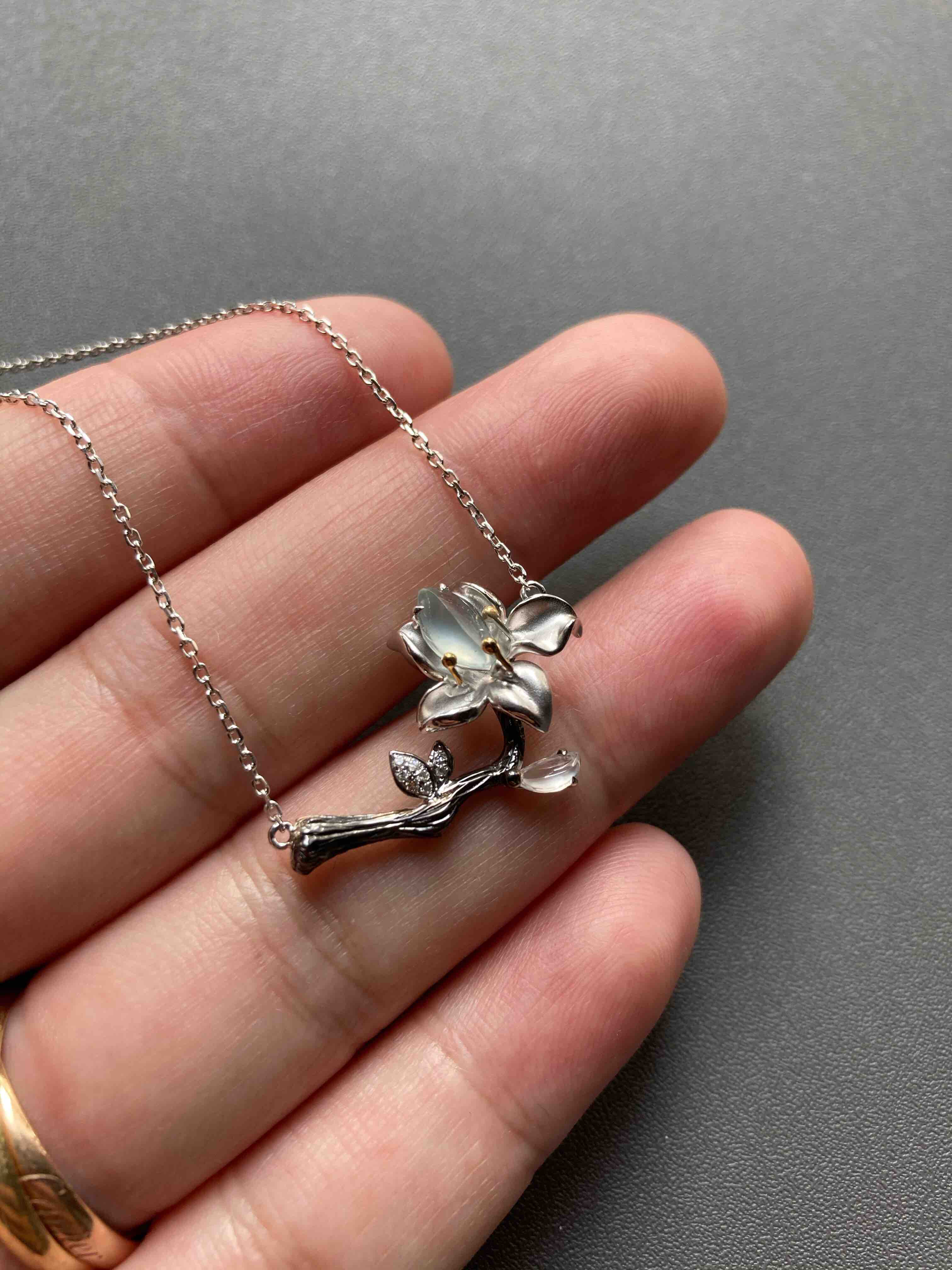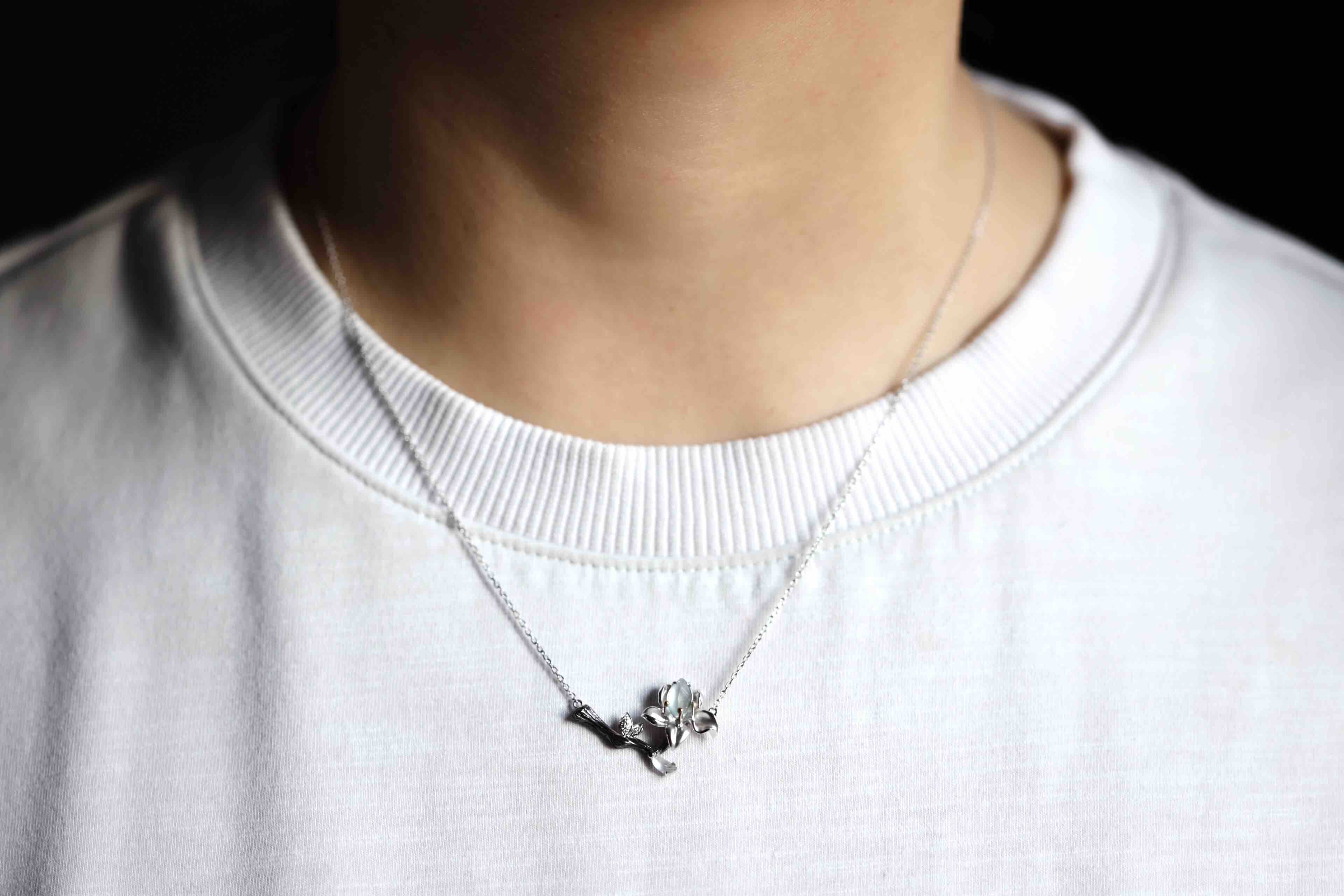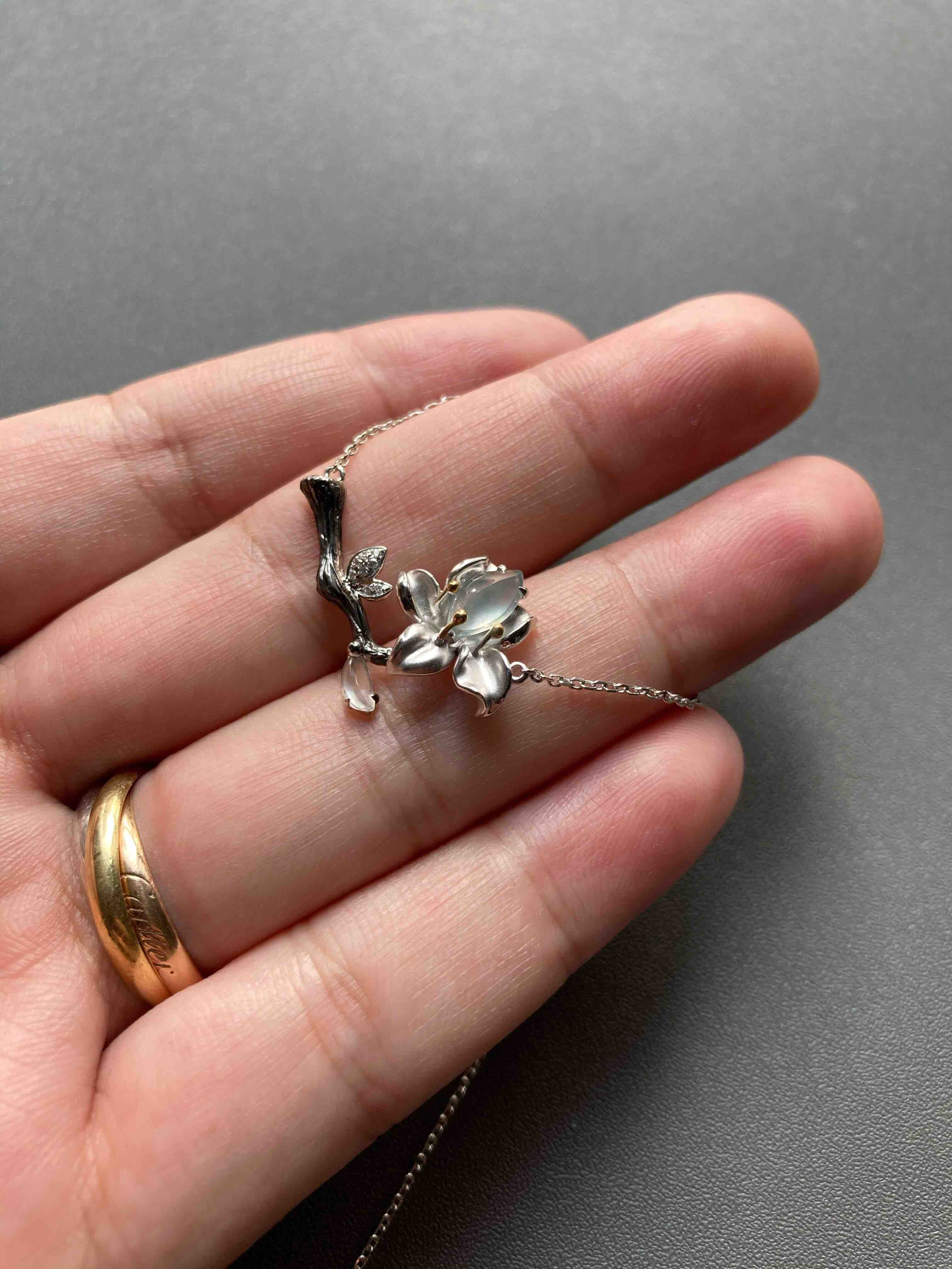 见过玻璃种的梅花,你一定没有见过玻璃种的兰花翡翠项链,真正的设计师原创系列,高级定制珠宝的制作工艺,看这花瓣和花心的细节充满雕塑感的设计,简直是一件艺术品,花瓣的玻璃种翡翠 品质非常棒,强刚性表现,荧光四射。镶嵌后25.5×16.1×5.2mm,链长40cm加5cm延长链