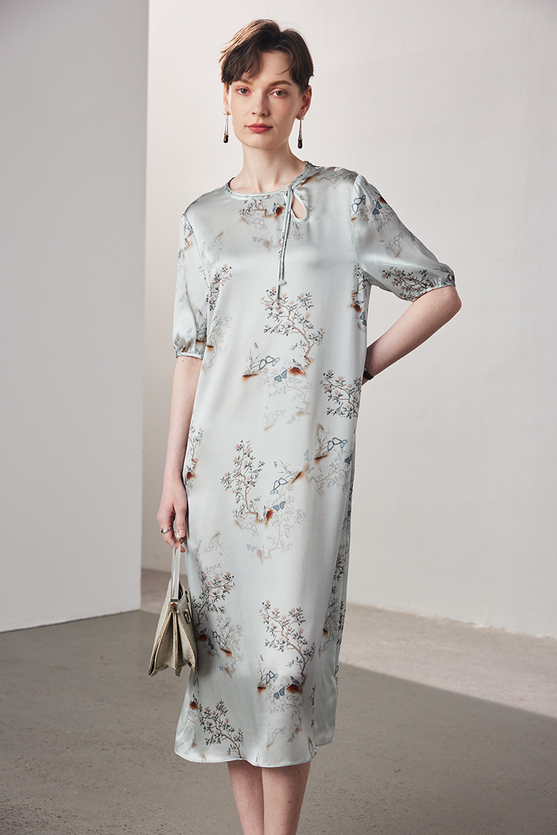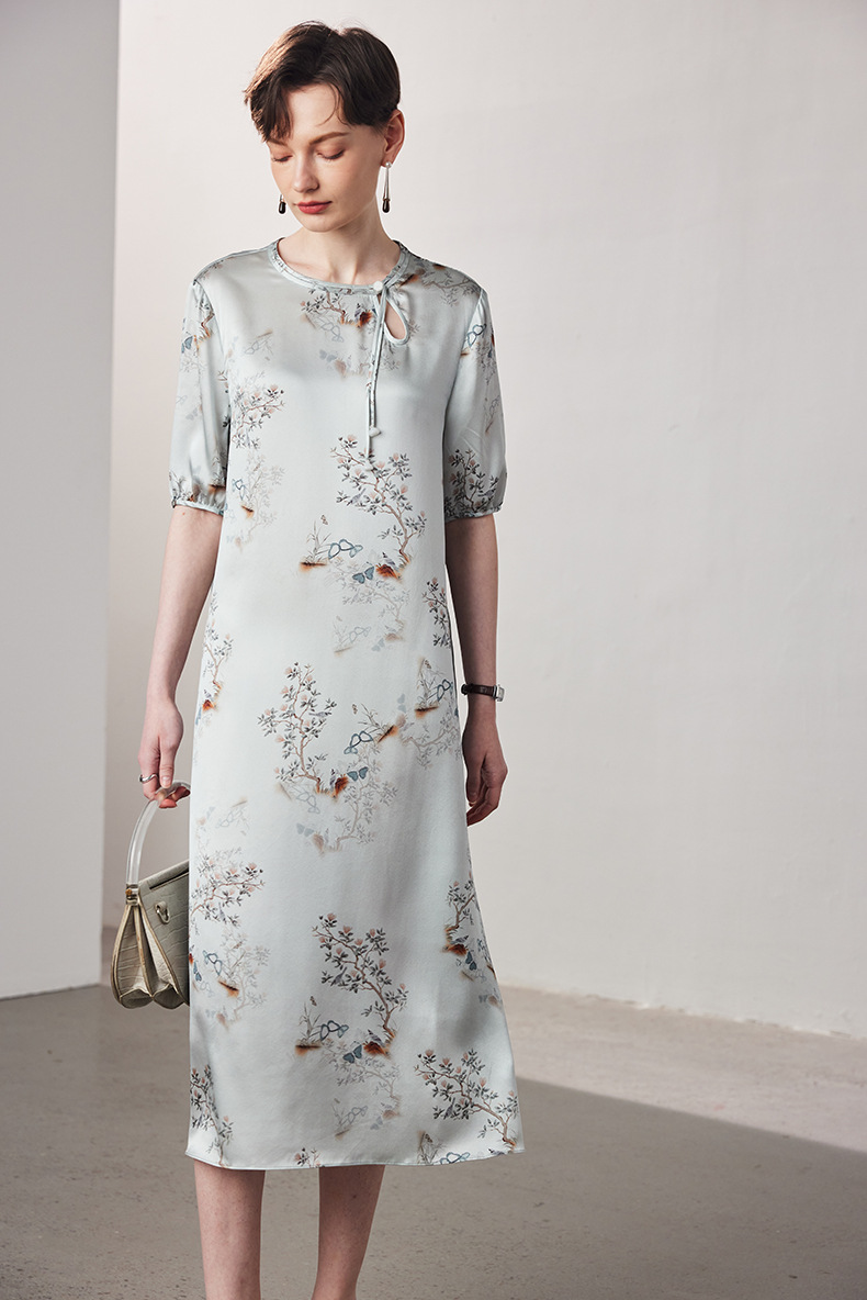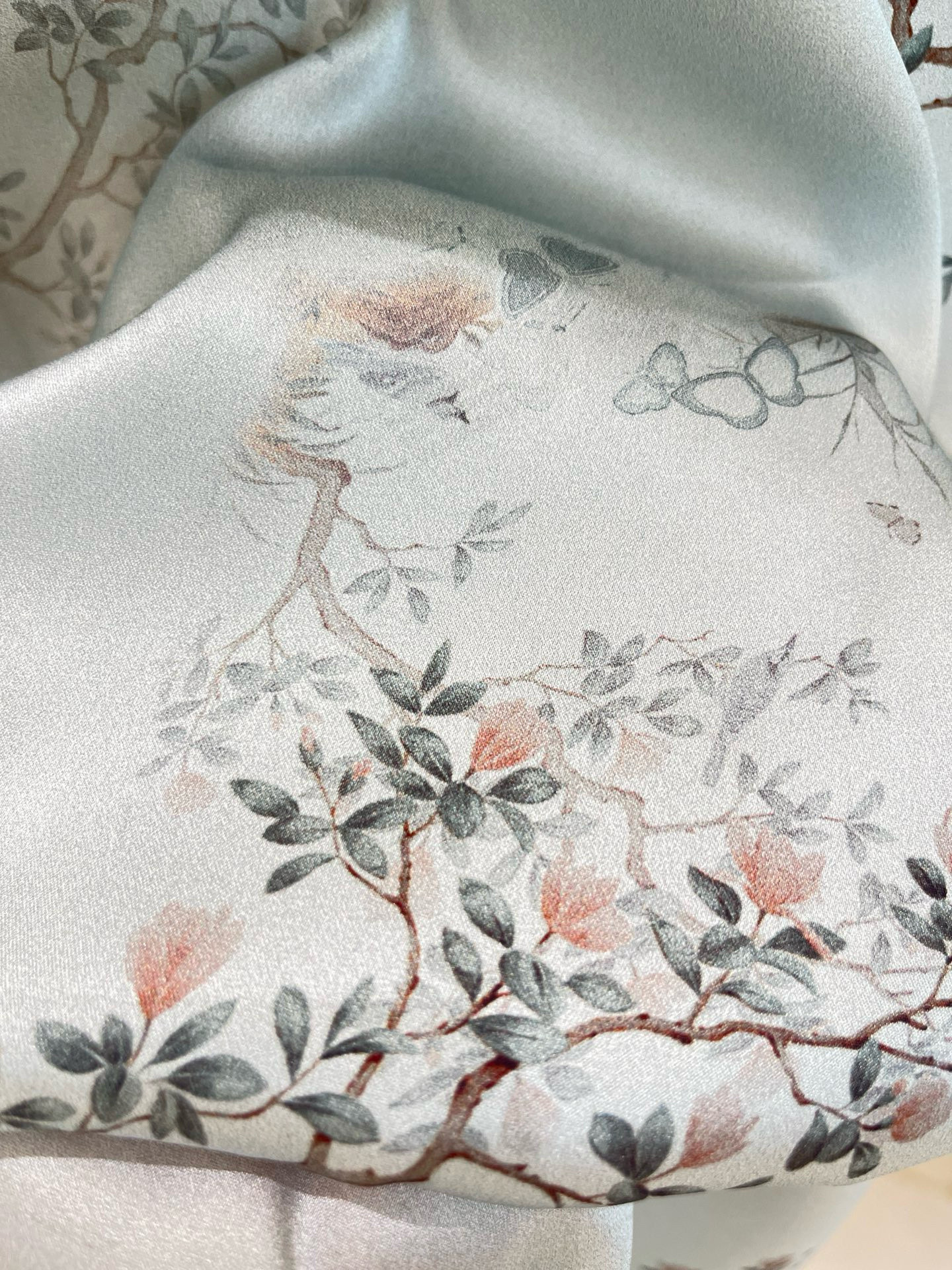 晕染工艺朦胧感国画,尽显国风大气优雅,清新淡雅的高级灰色,缎面真丝自带光泽,薄若蝉翼,轻如云雾~