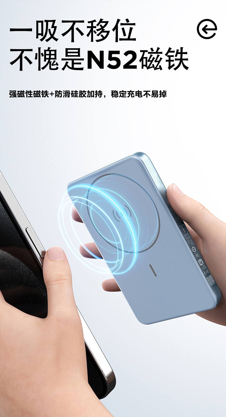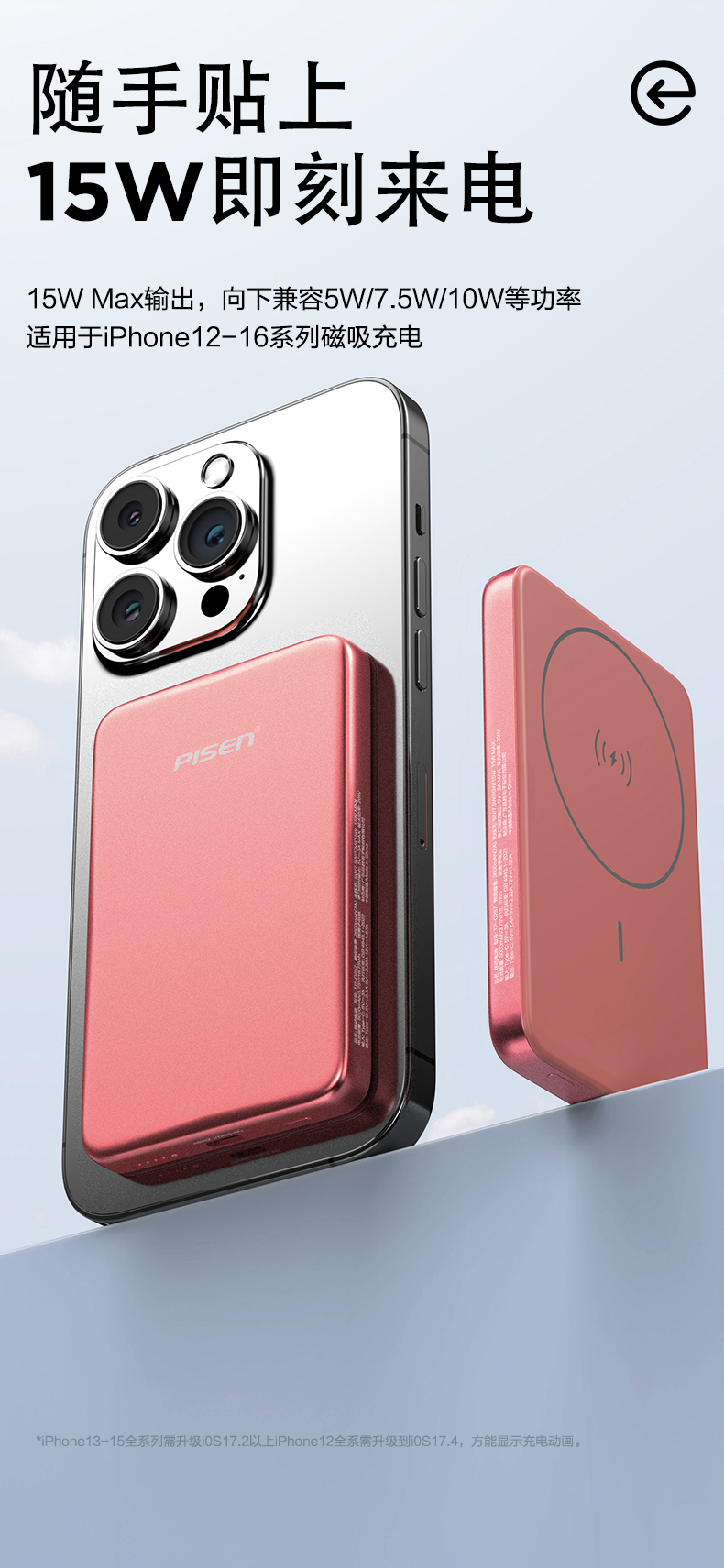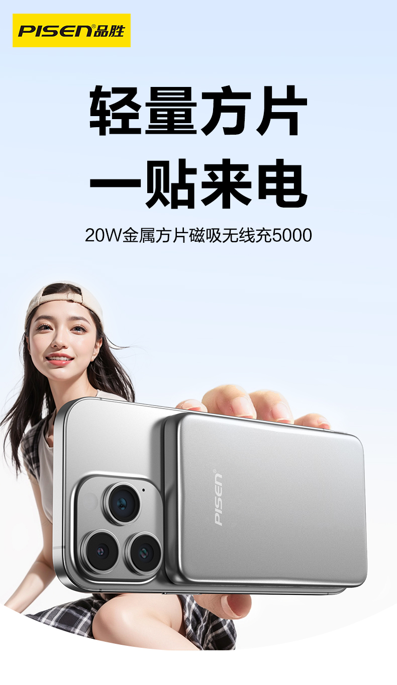 品胜 20W金属方片磁吸无线充5000毫安 支持20W磁吸MagSafe超薄小巧支持苹果/安卓设备