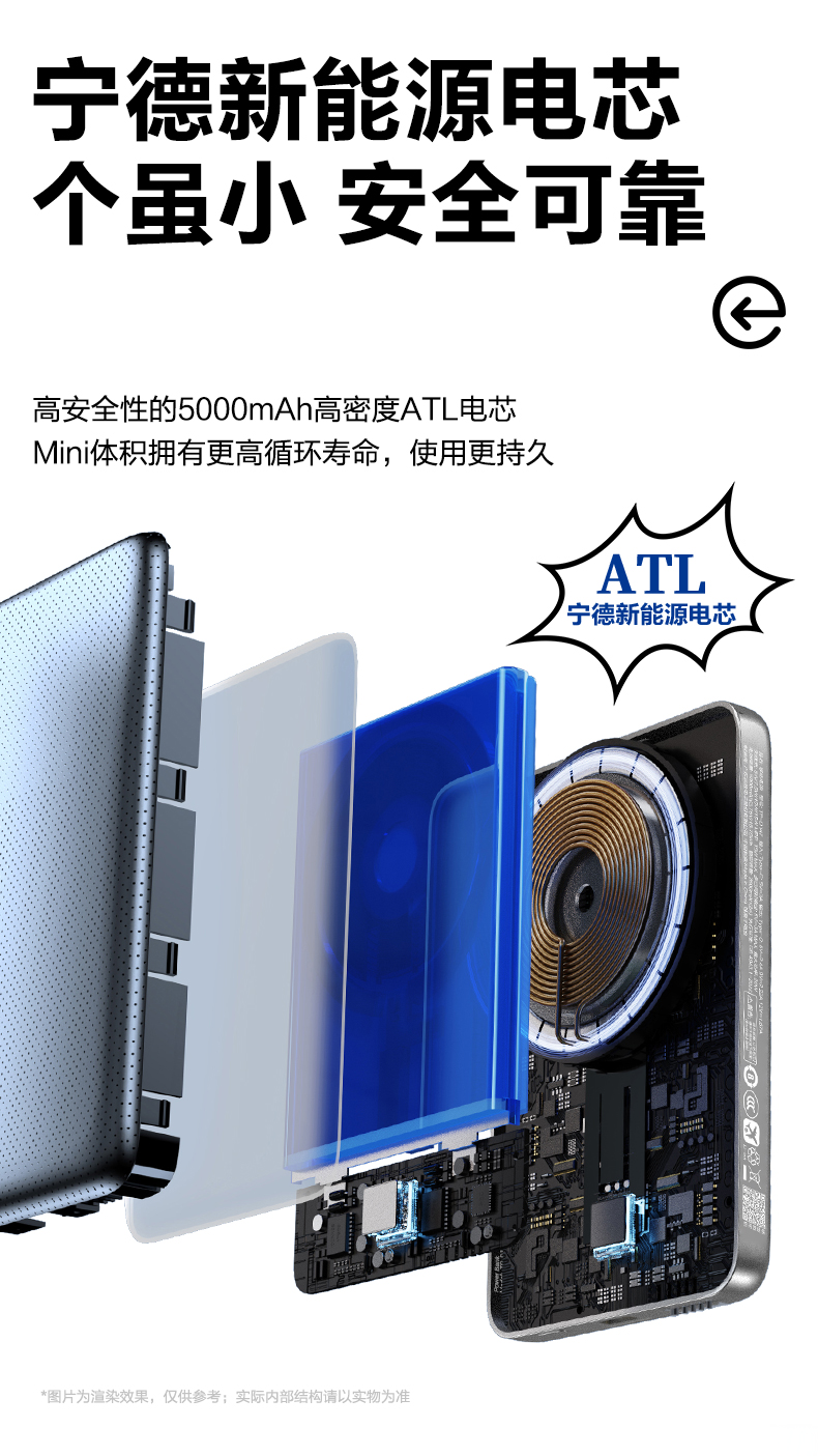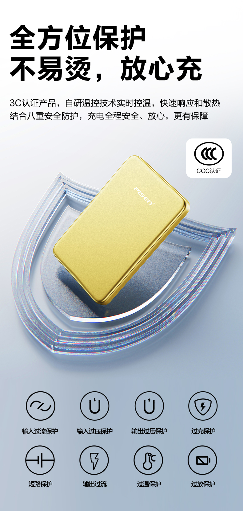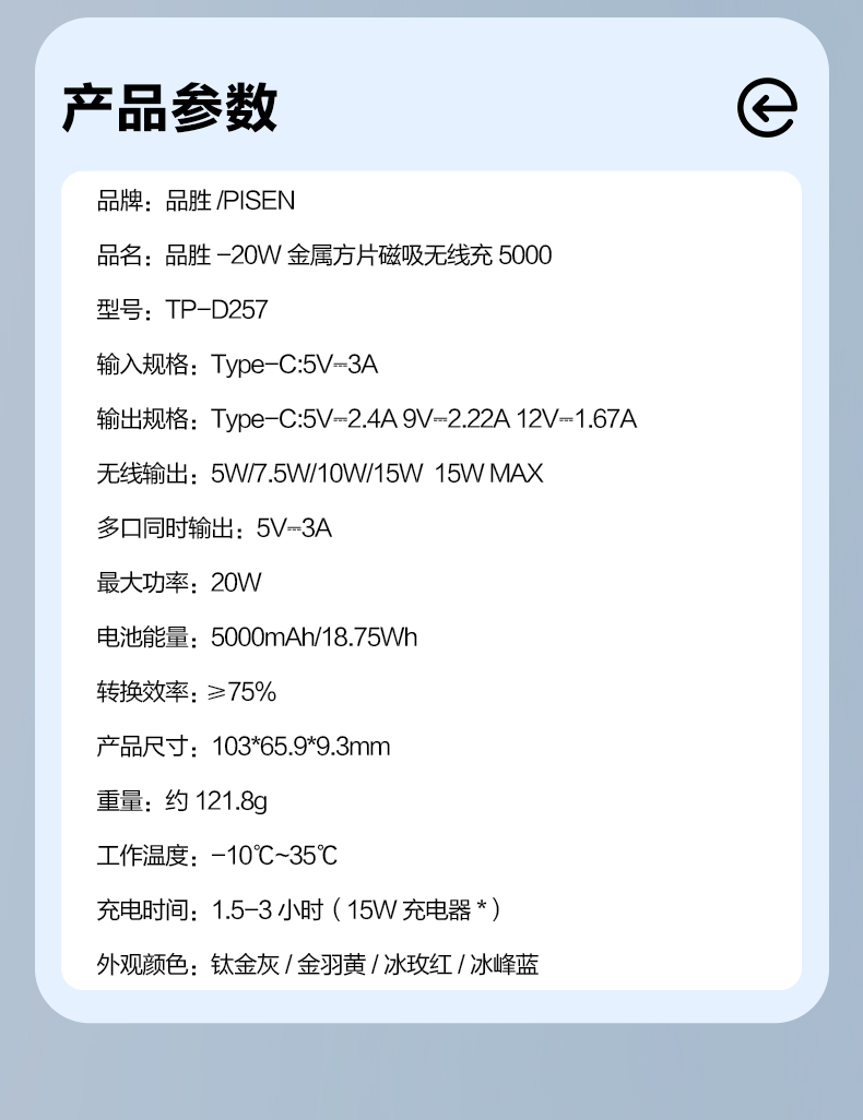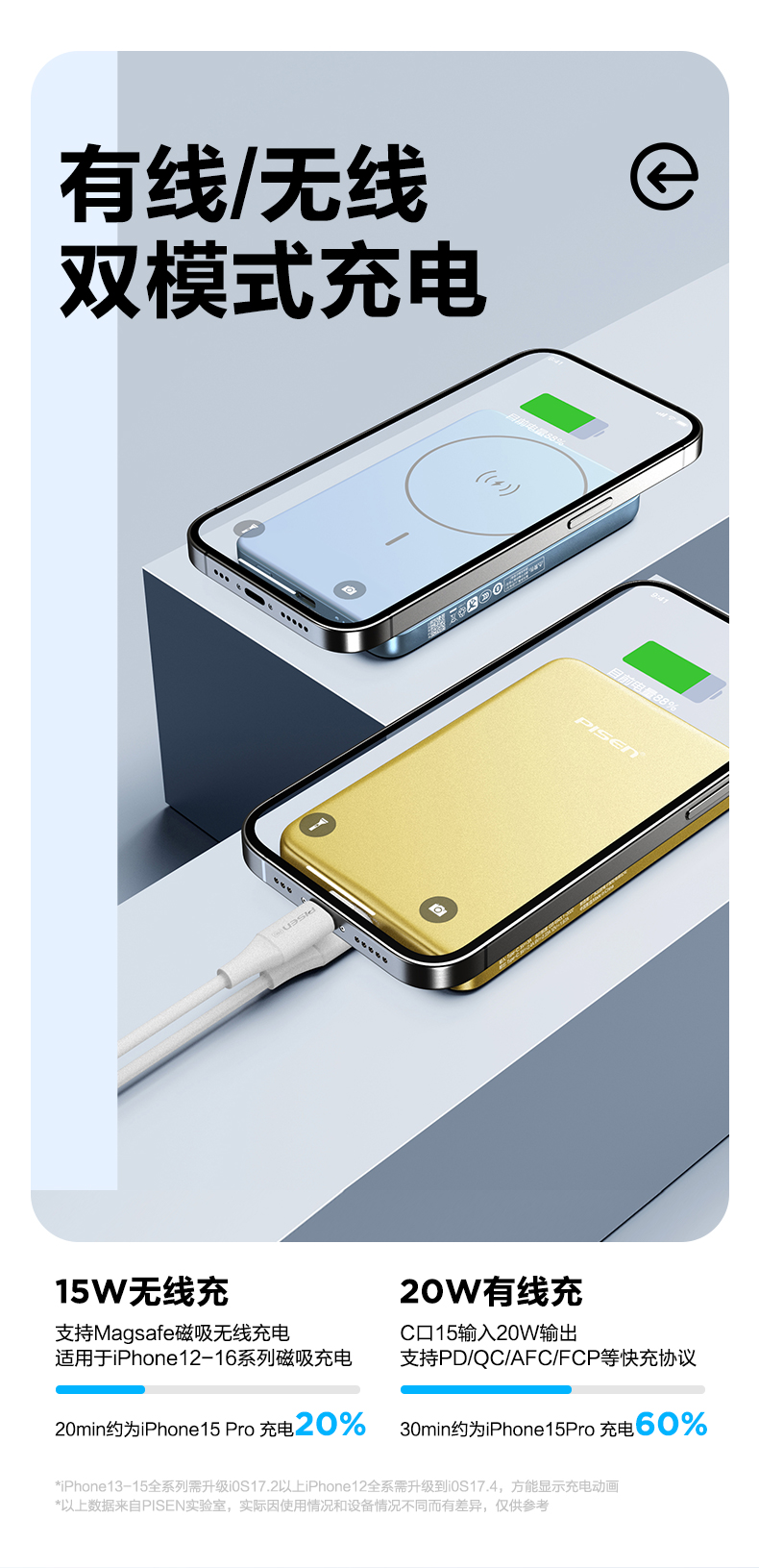 品胜 20W金属方片磁吸无线充5000毫安 支持20W磁吸MagSafe超薄小巧支持苹果/安卓设备