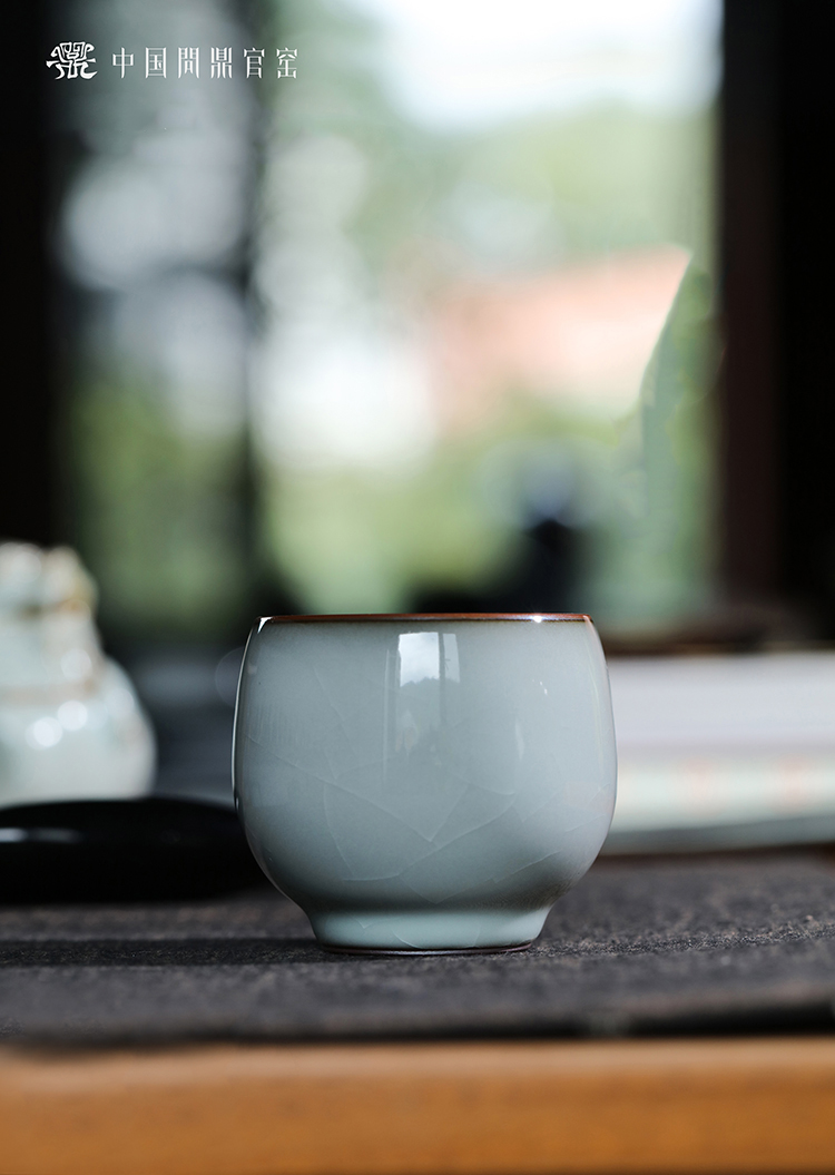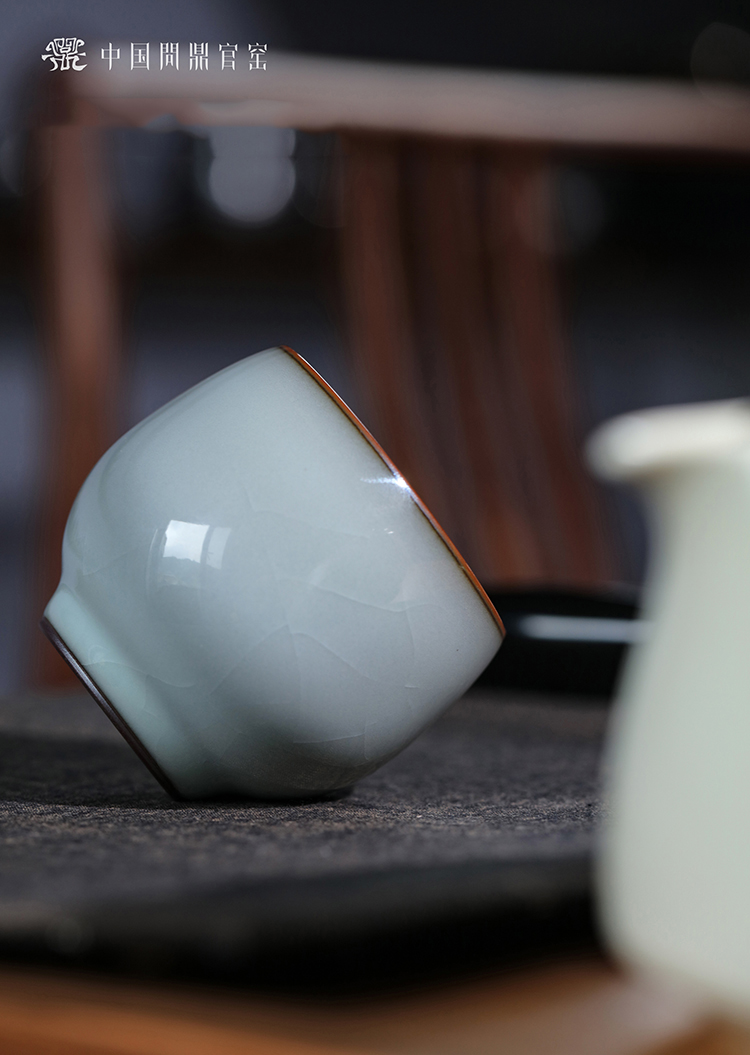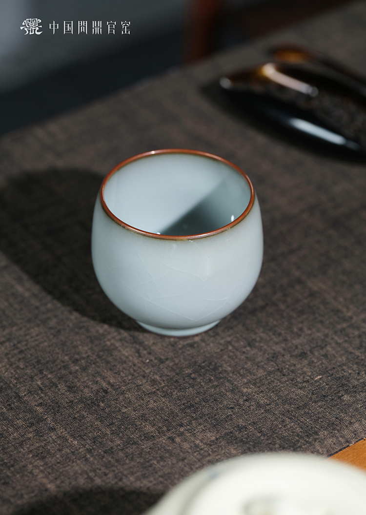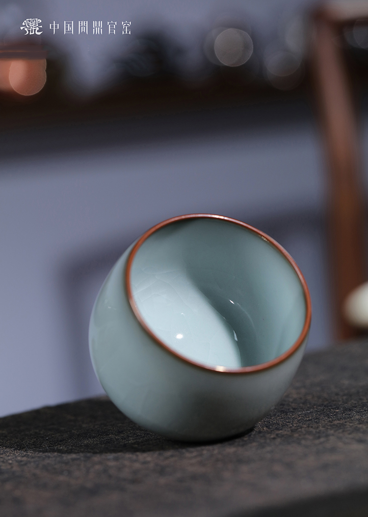 问鼎汝瓷鼎峰柴窑月白观月杯(梵红描金狮子绣球)