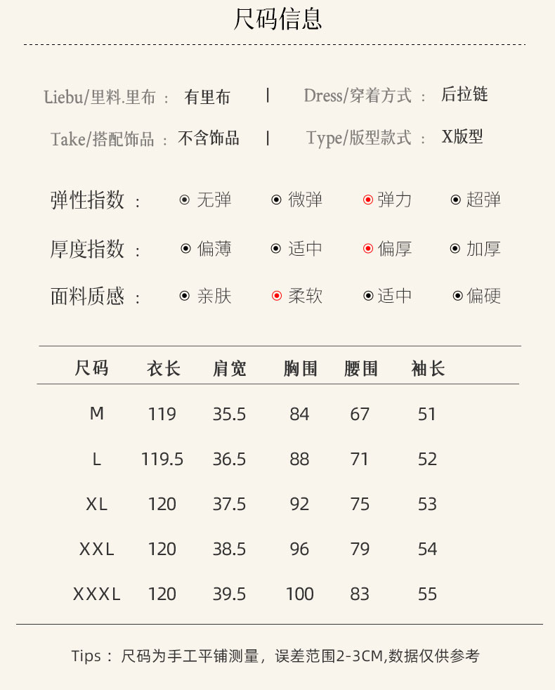 🔸衣长120cm。领高:4.5cm。装袖长袖。后拉。有弹。