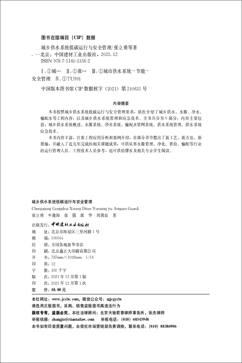 本书内容丰富,注重工程应用分析和案例介绍,在部分章节提出了新工艺、新方法、新措施,并融入了近几年完成的相关课题成果,可供从事水源管理、净化、供给、输配等行业的运行管理人员、工程技术人员参考,也可供给排水及相关专业学生阅读。