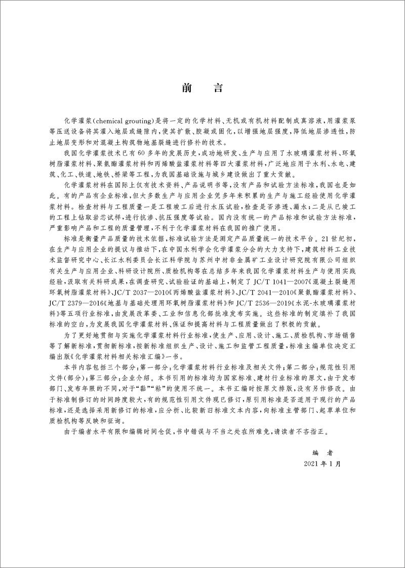 为了更好地贯彻与实施化学灌浆材料行业标准,使生产、应用、设计、施工、质检机构、市场销售等了解新标准,贯彻新标准,按新标准组织生产、设计、施工和监管工程质量,标准主编单位决定汇编出版《化学灌浆材料相关标准汇编》一书。