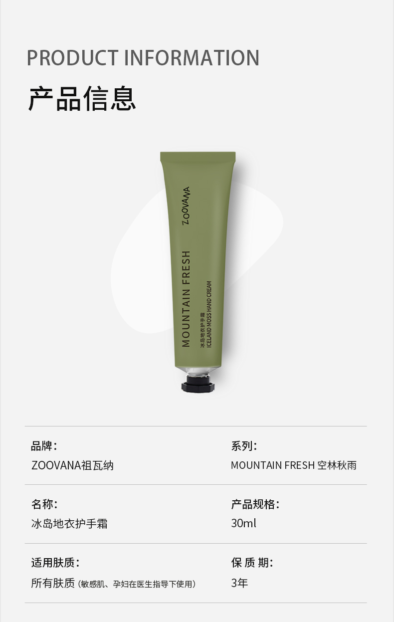 ZOOVANA祖瓦纳 冰岛苔藓香氛护手霜 锁水保湿不黏腻 单支装/礼盒装 30ml/支