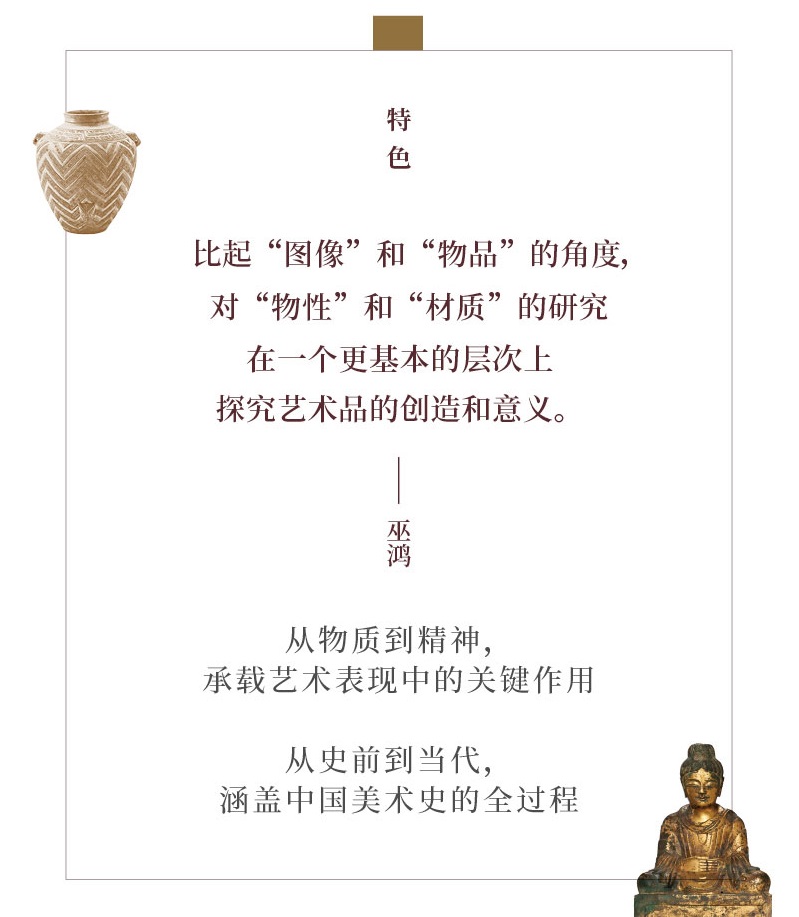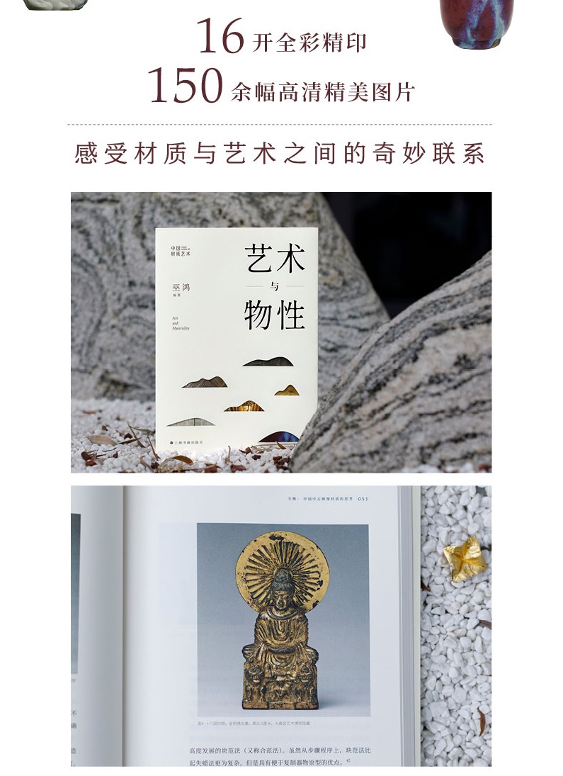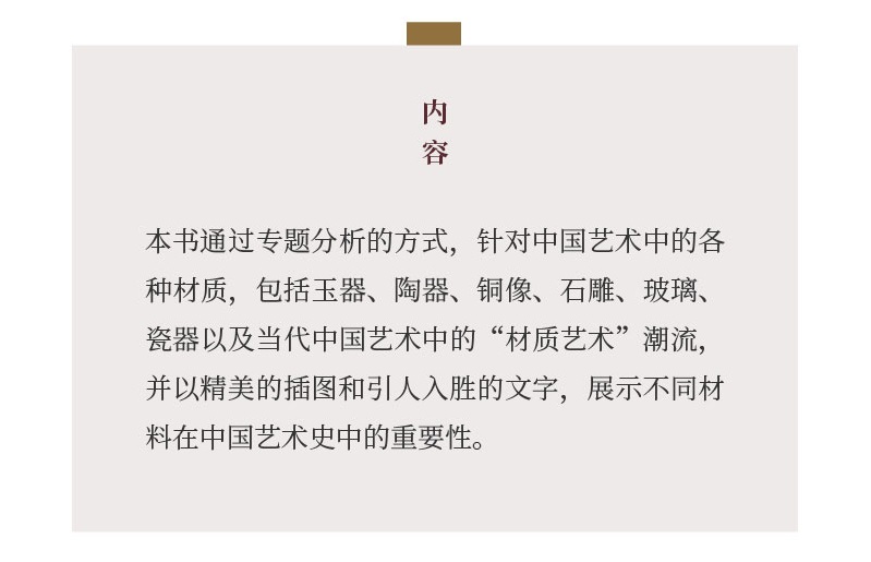 ;中国材质艺术是著名美术史家、艺评家、策展人巫鸿主持编著的一个全新系列。本丛书旨在引进;图像与;物件之外的第三个研究和理解艺术品的角度,即以材料和质料为研究出发点的;物性。 ;材质艺术是艺术研究和艺术批评中的一个新观念,指的是特定材料在艺术表现和表达中起到的关键作用,由此构成艺术发展和创作中的一个长远传统和重要方面。;材质一词既指制作艺术品和建筑物的;材料,也意味着不同材料在意识形态和审美层次上的;质量。这个概念因此包含和联结了物质和精神两个维度,一方面引导我们探究艺术创作中对不同材料的选择标准和使用方式,同时也促使我们探索这些材料所承载的历史、文化、宗教、政治、性别和思想上的含义。沿循这两个维度,我们可以更加自觉地思考艺术创造与物质文化及技术发展之间的关系,也可以把中国美术中的诸多品种和特性与中国文化传统的多元性更加紧密地连接起来。