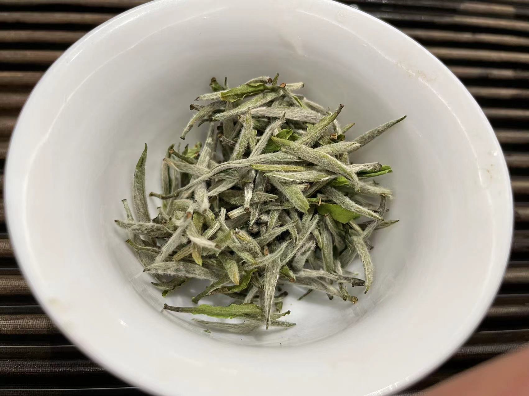 大家看干茶,白毫清晰,成色中不带青绿,整体灰白。这就是工艺到位的一种表现。