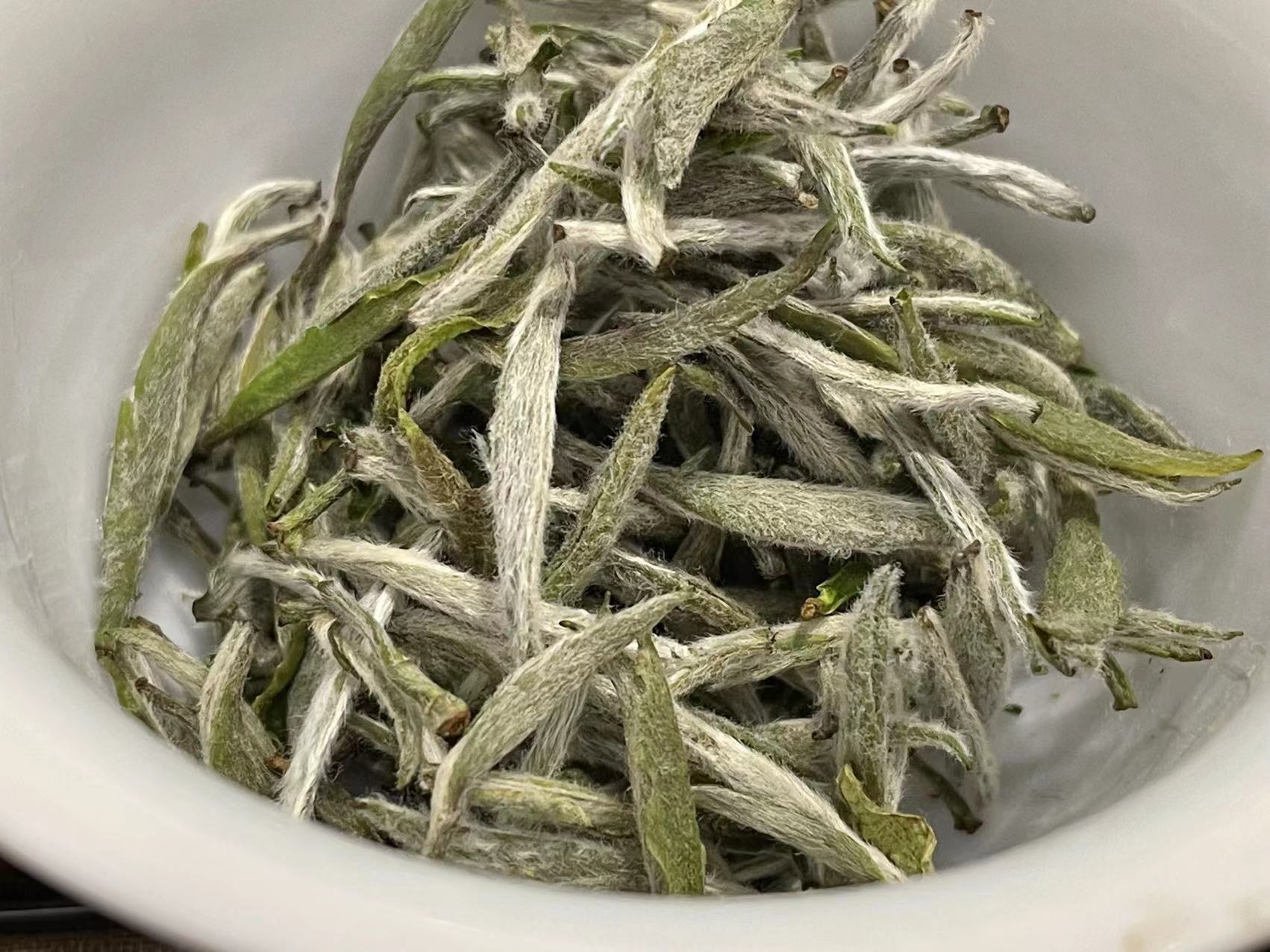 特写干茶:芽头分明,毫下隐翠。芽形明显的头采特征。