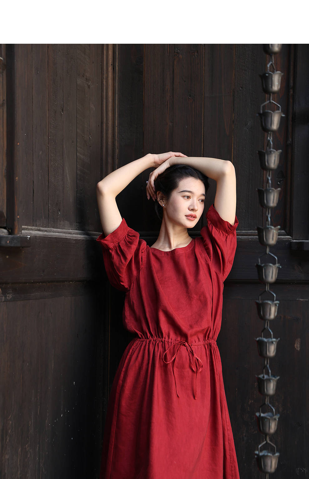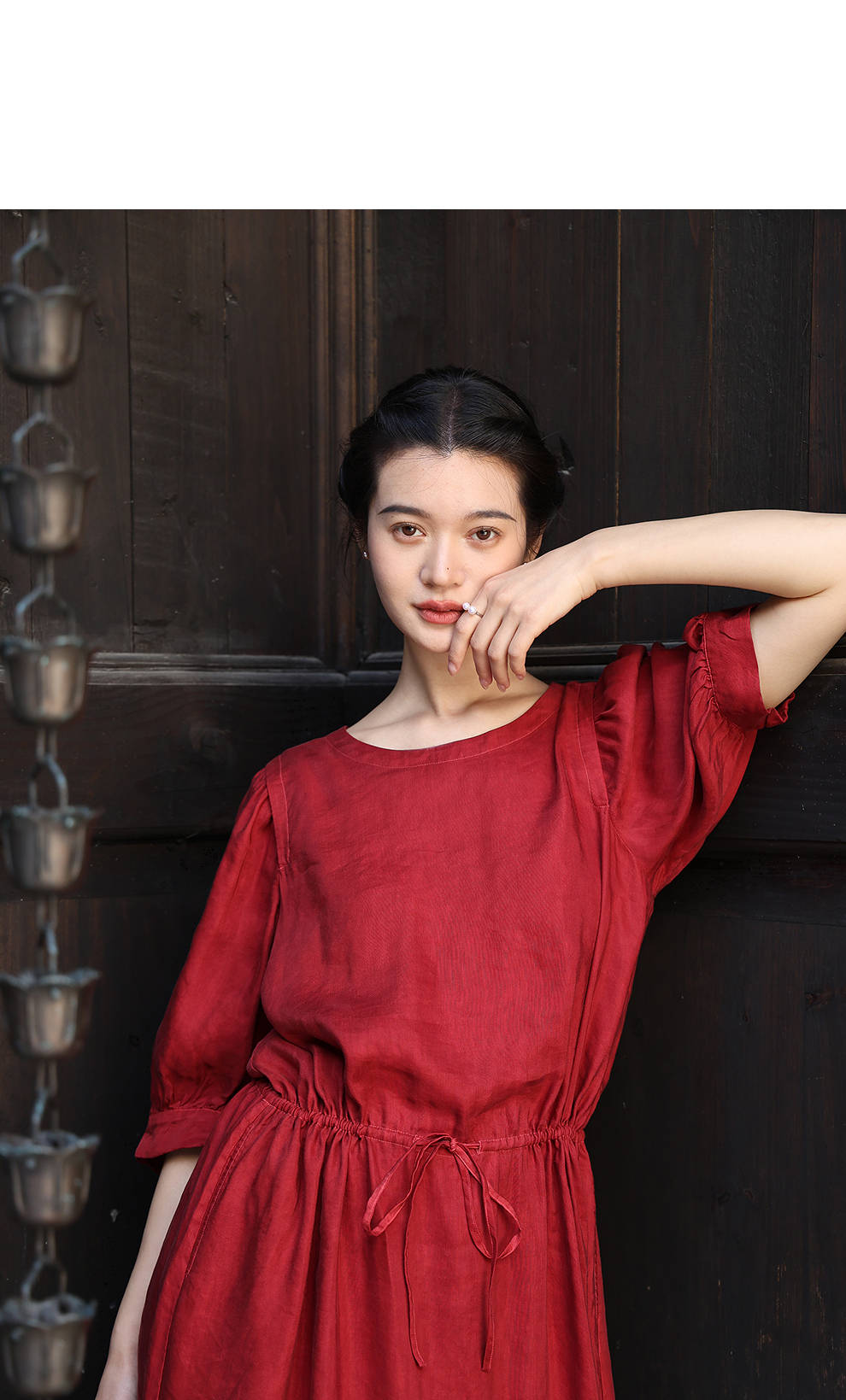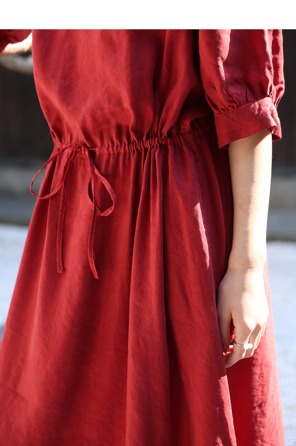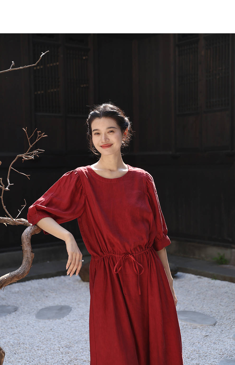 绽放旅行女装261朵/铜氨天丝亚麻灯笼袖通带系带七八分袖连衣裙子
