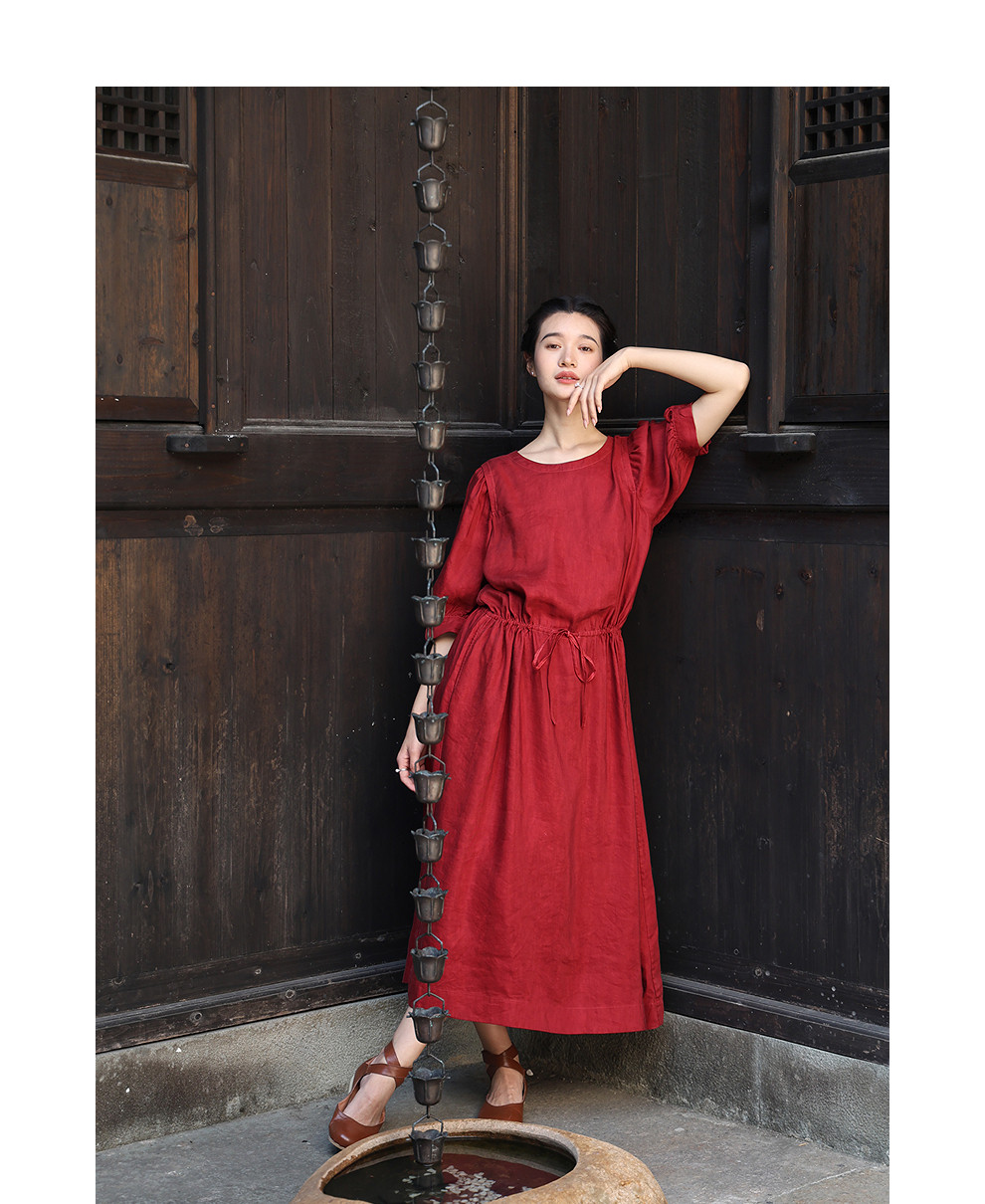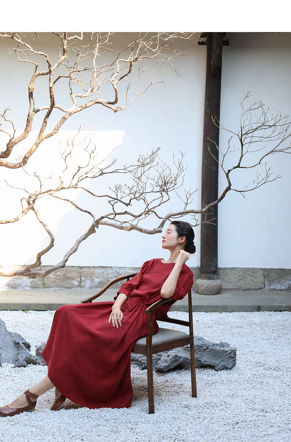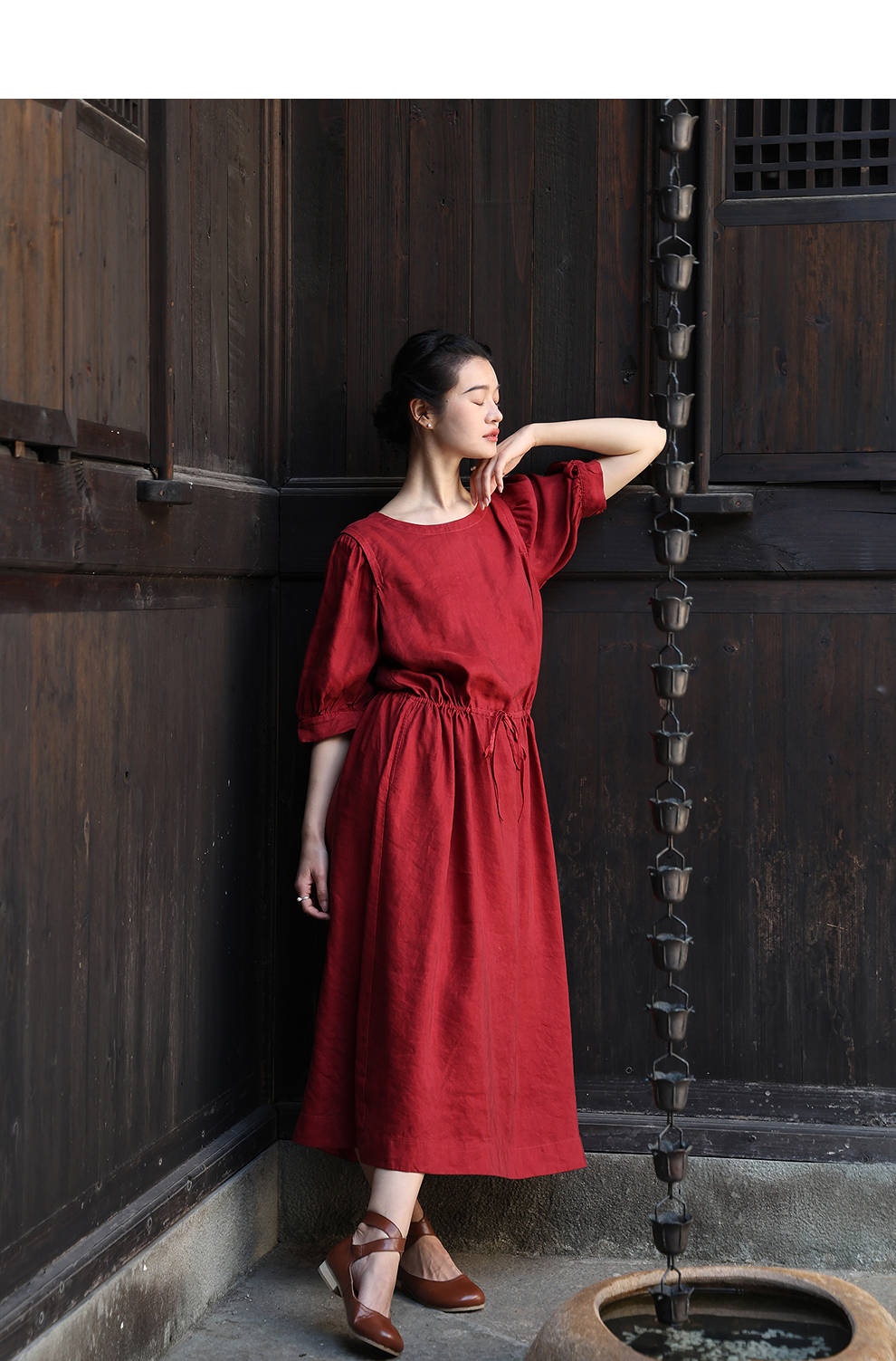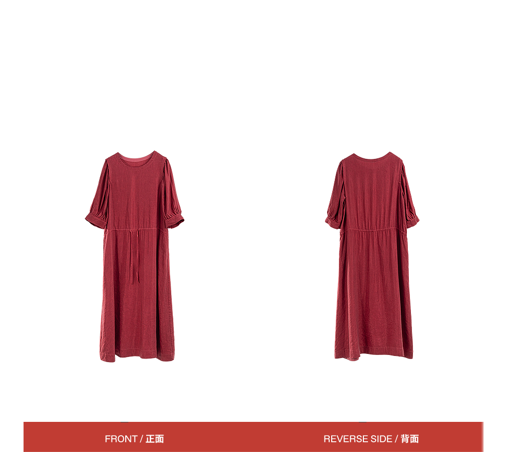绽放旅行女装261朵/铜氨天丝亚麻灯笼袖通带系带七八分袖连衣裙子