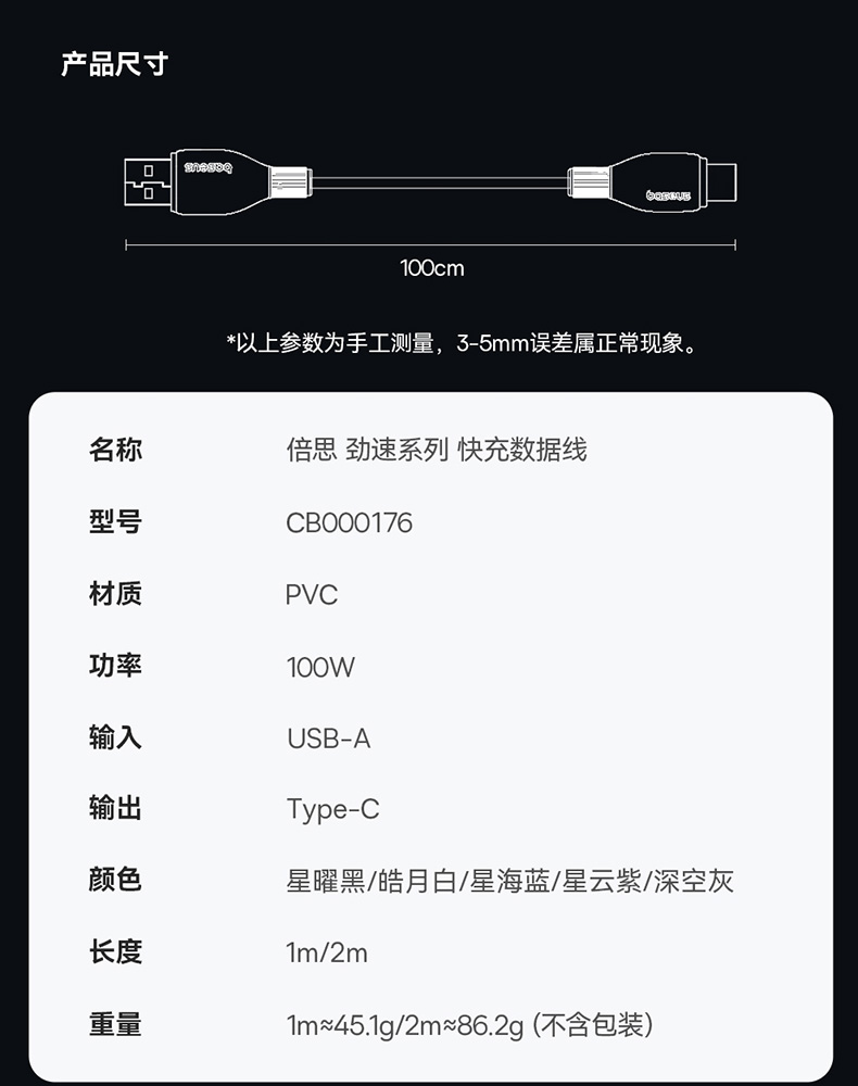 倍思 劲速系列 快充数据线 USB to Type-C 100W
