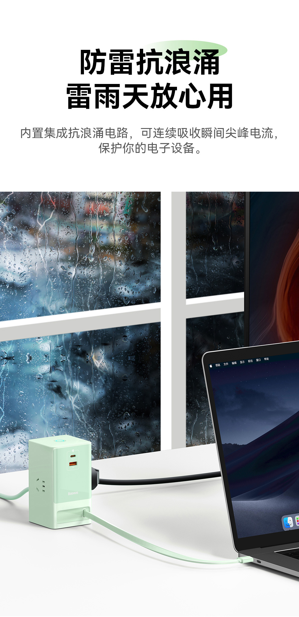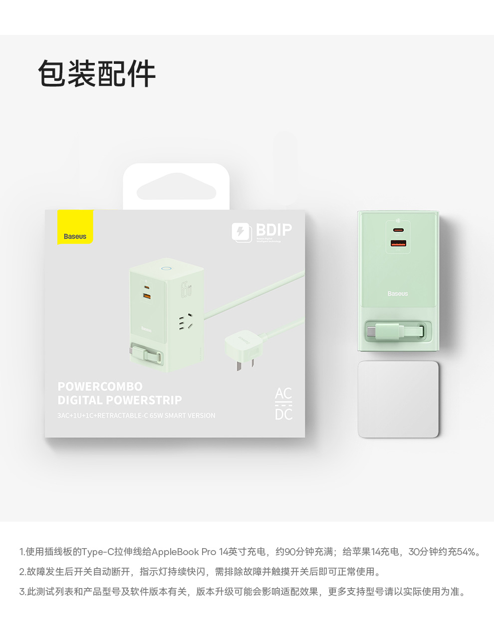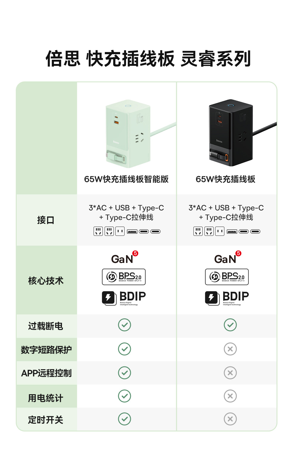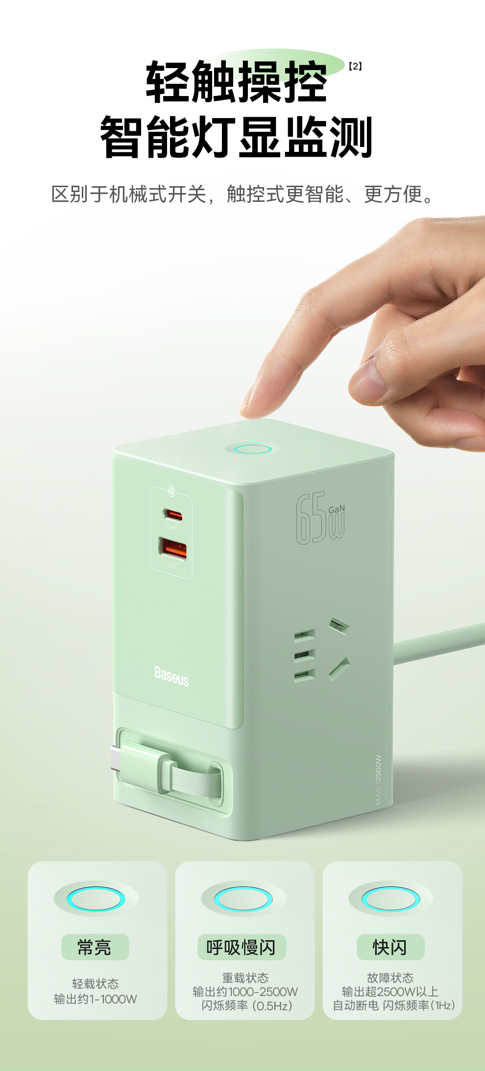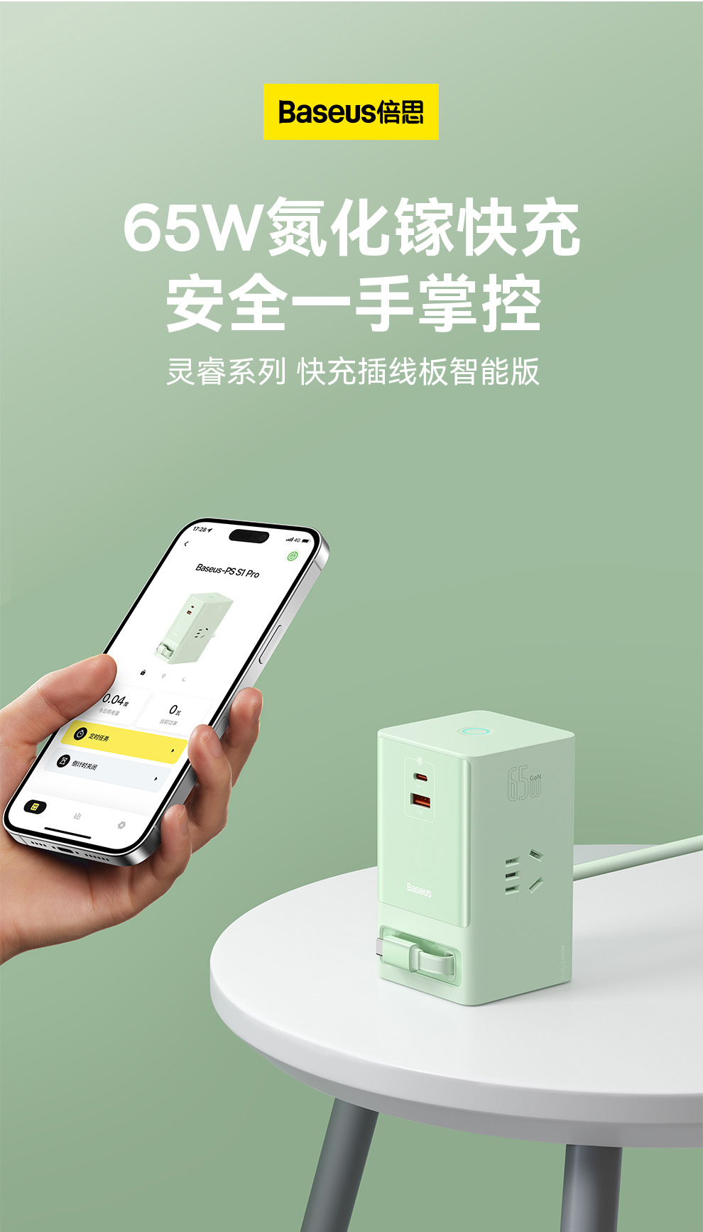 倍思 灵睿系列 数字式插线板 3AC+1U+1C+拉伸线C 65W 智能版 1.5m电源线