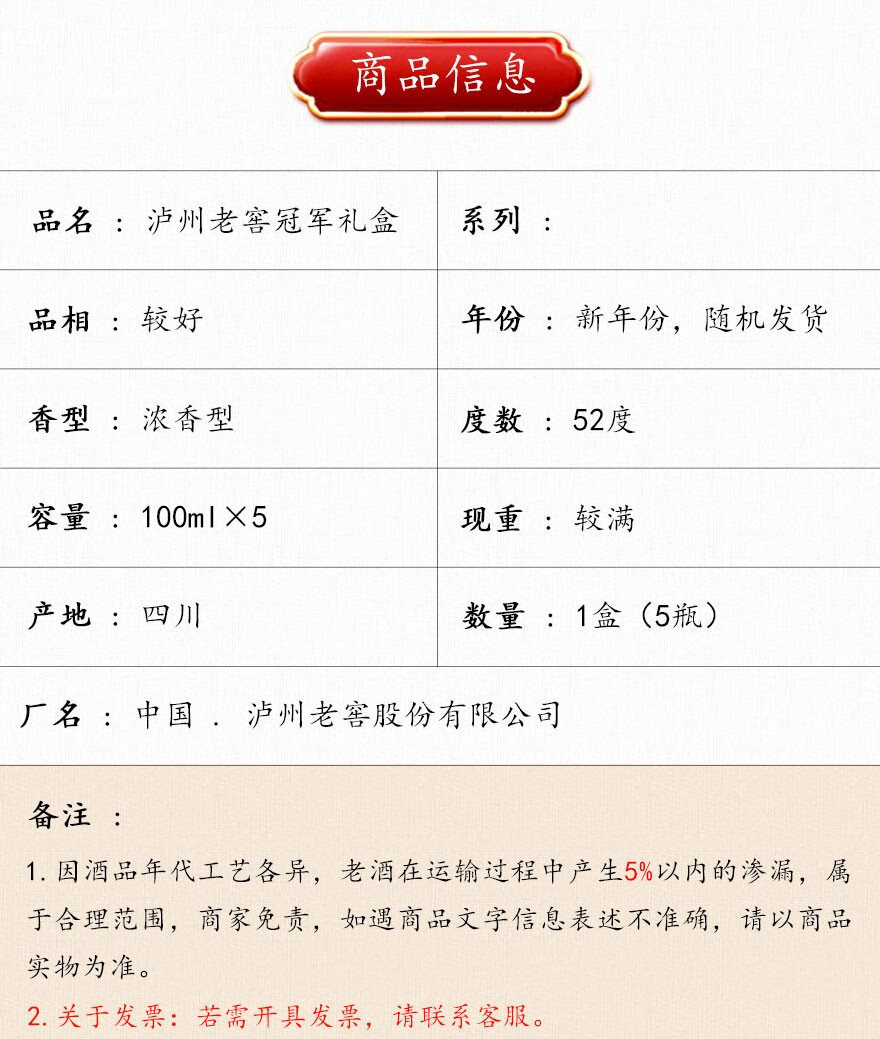 泸州老窖冠军礼盒52°浓香型白酒礼盒装 100ml*5