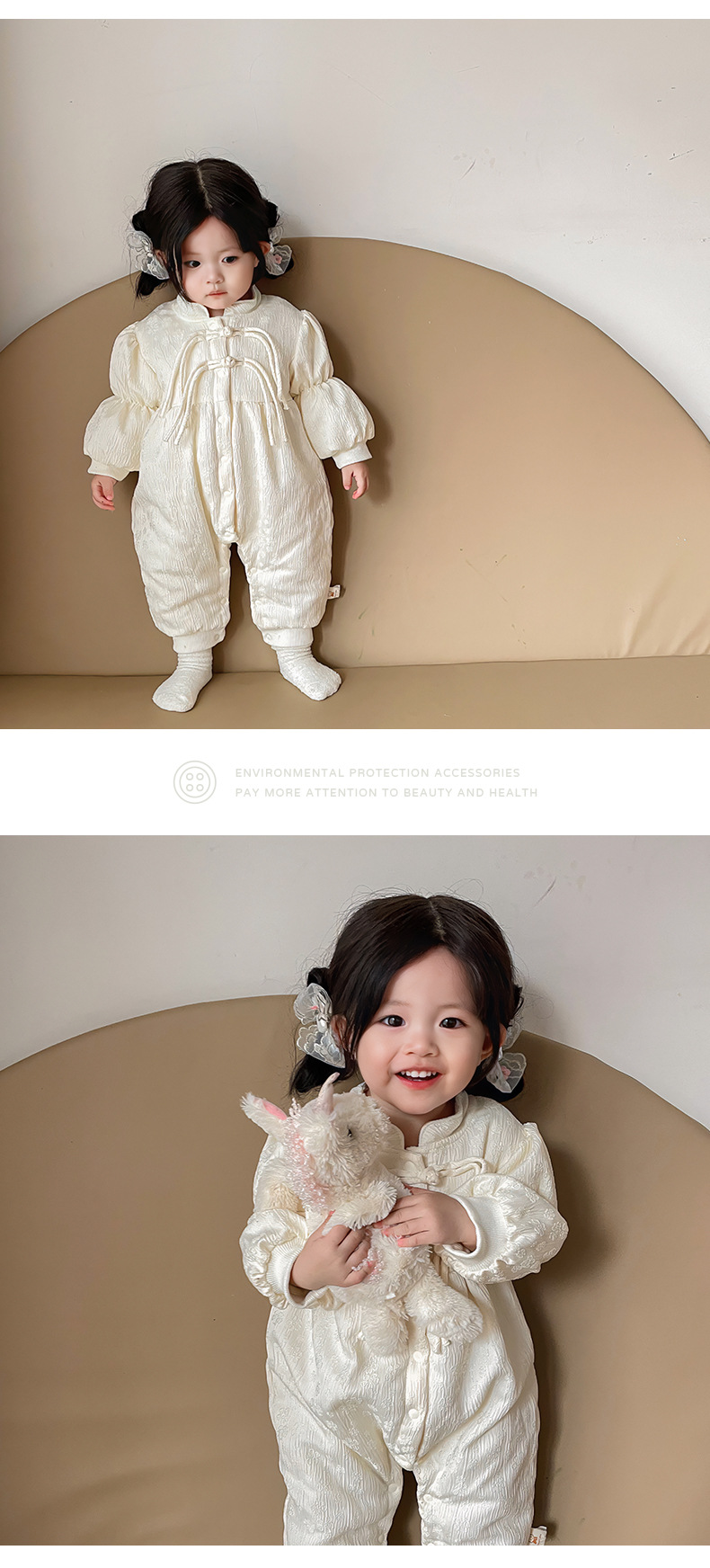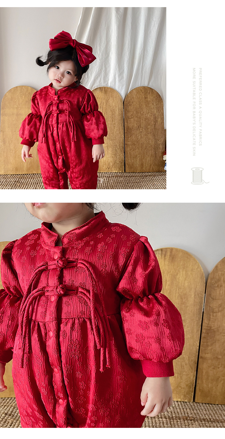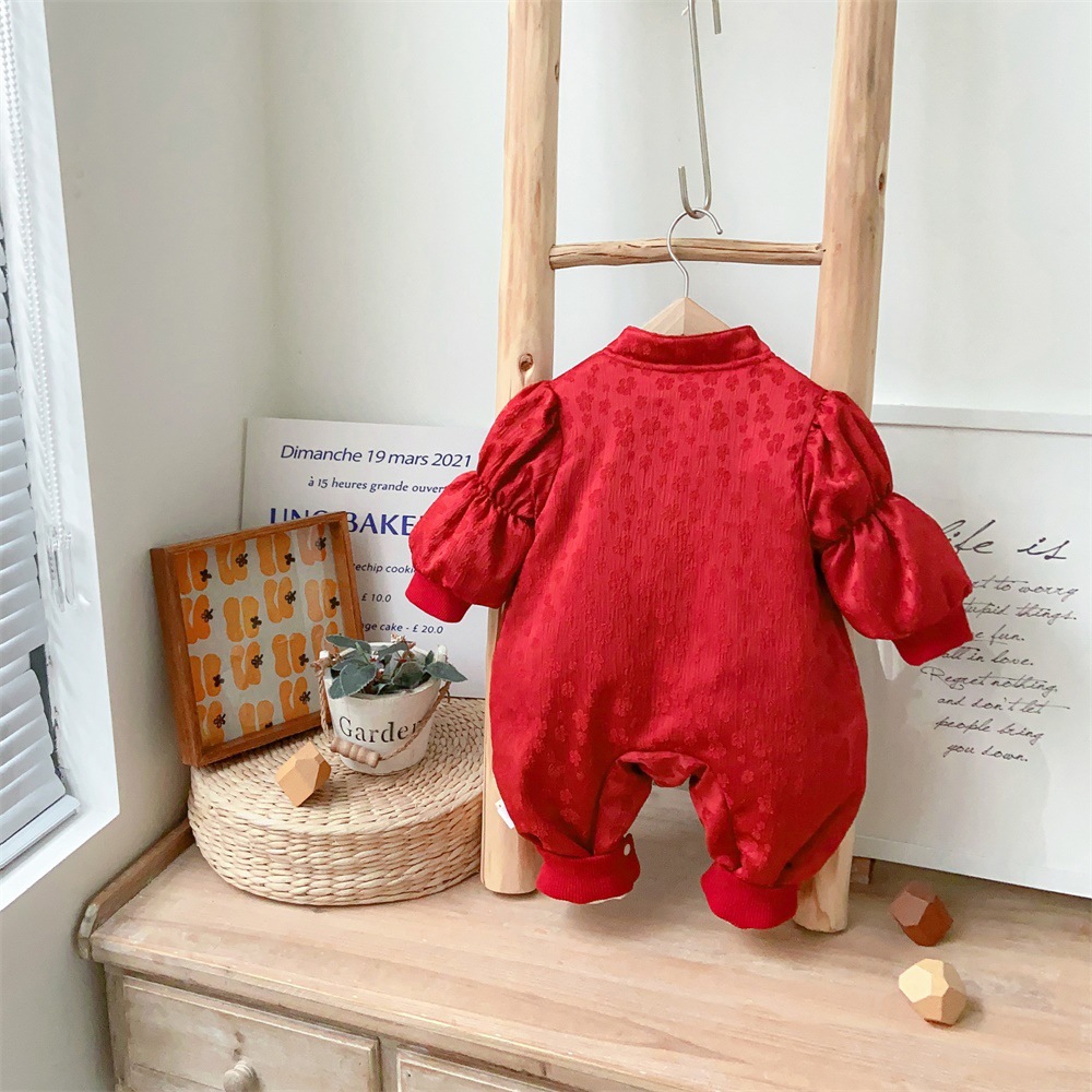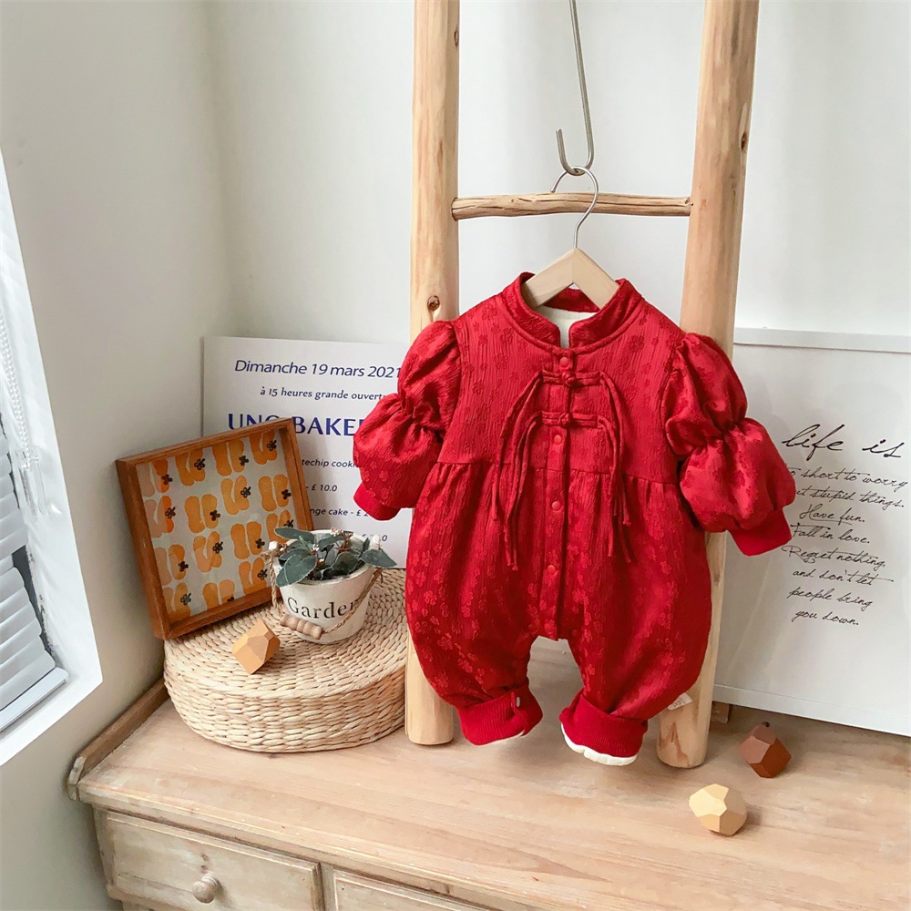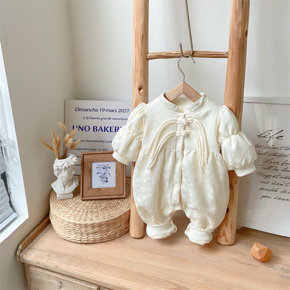 【中国风提花盘扣泡泡袖哈衣】满月婴儿衣服秋冬女宝宝加绒加厚连体衣