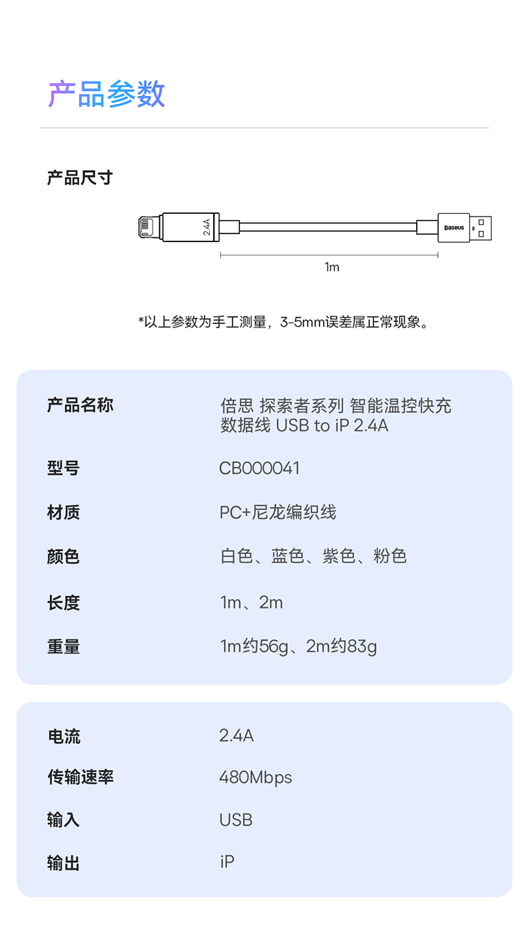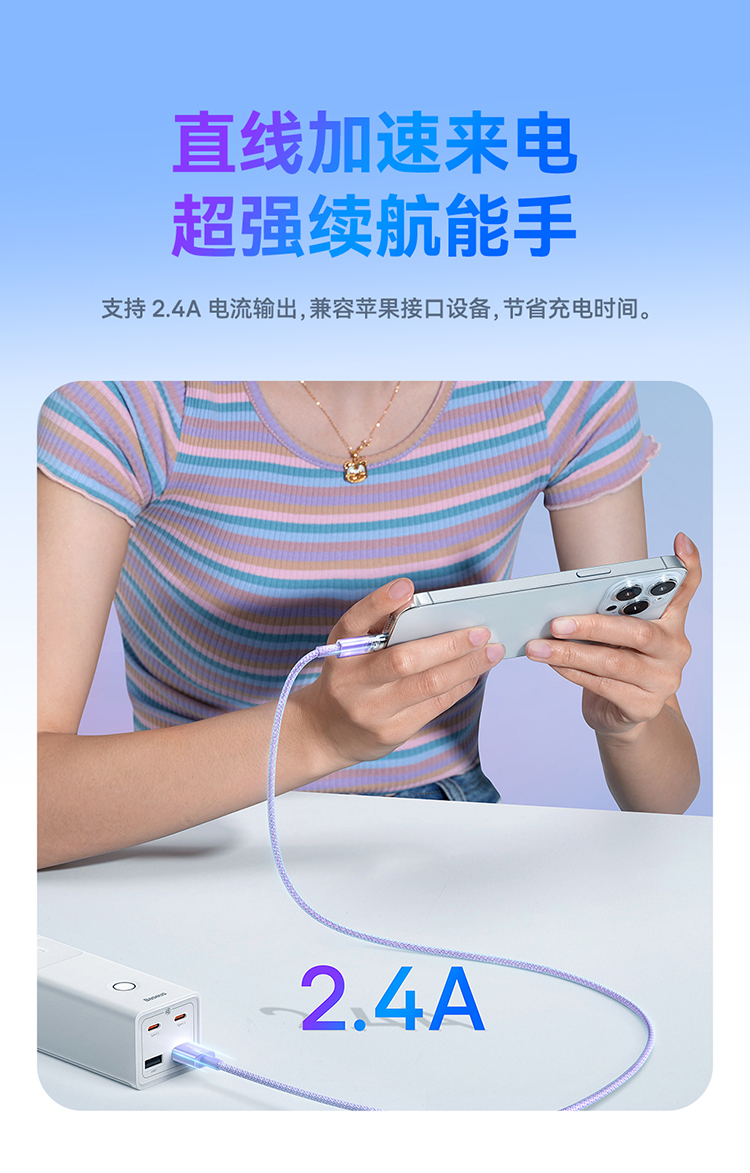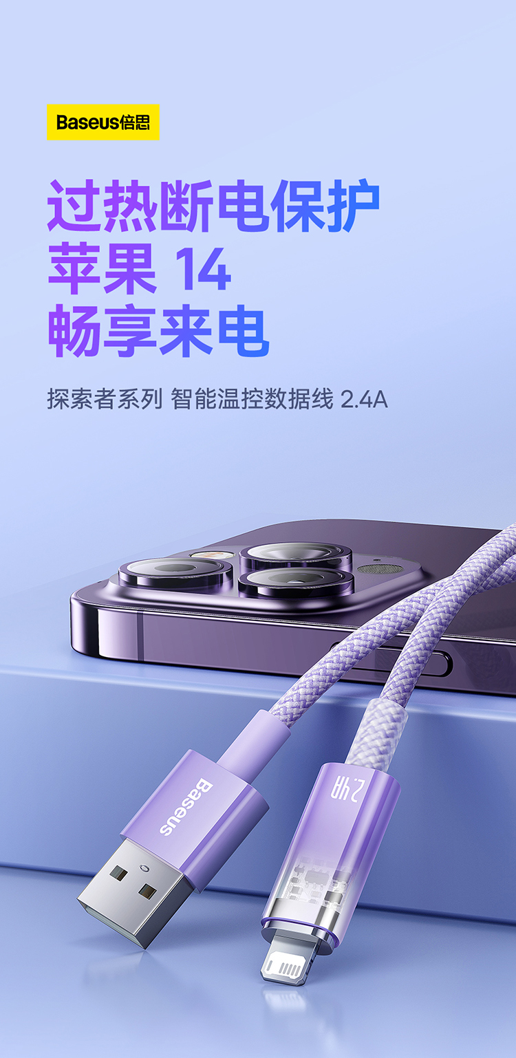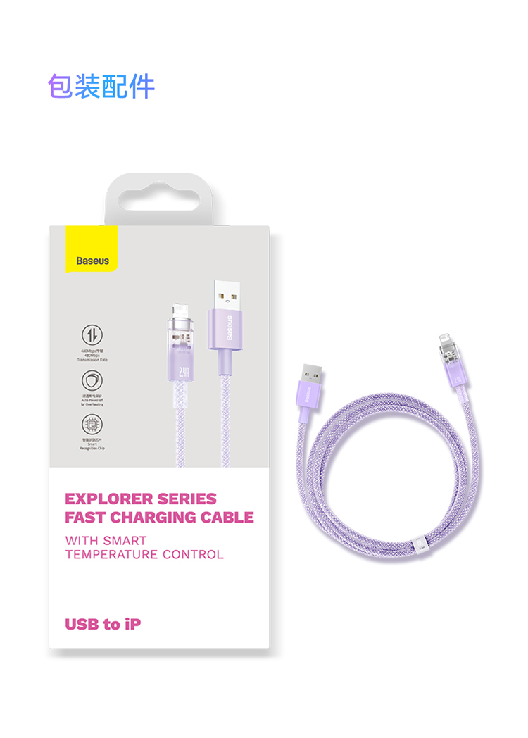 倍思 探索者系列 智能温控快充数据线USB to iPone 2.4A