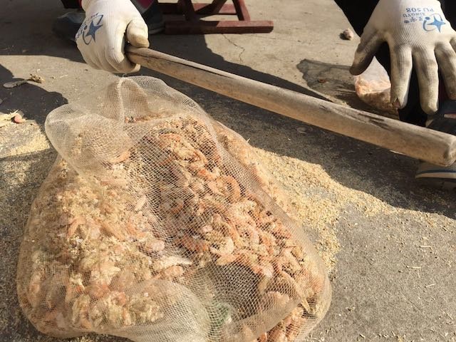 干透后,装在细网兜里,用棒子反复敲打,去皮。每次装的不多,要敲打好久,才能让大部分虾皮去掉。那些没有去掉皮的,再一只只手工剥掉。
