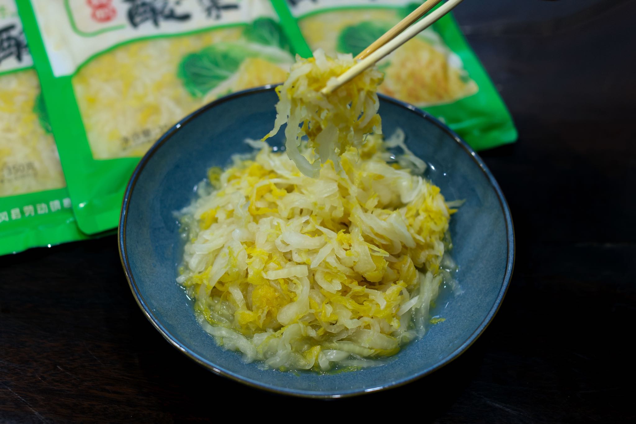 制作过程 将有机大白菜 乳酸菌放入食品级不锈钢罐中开始腌制30天,腌制完成开始洗菜、选菜、切丝、装袋、高温灭菌