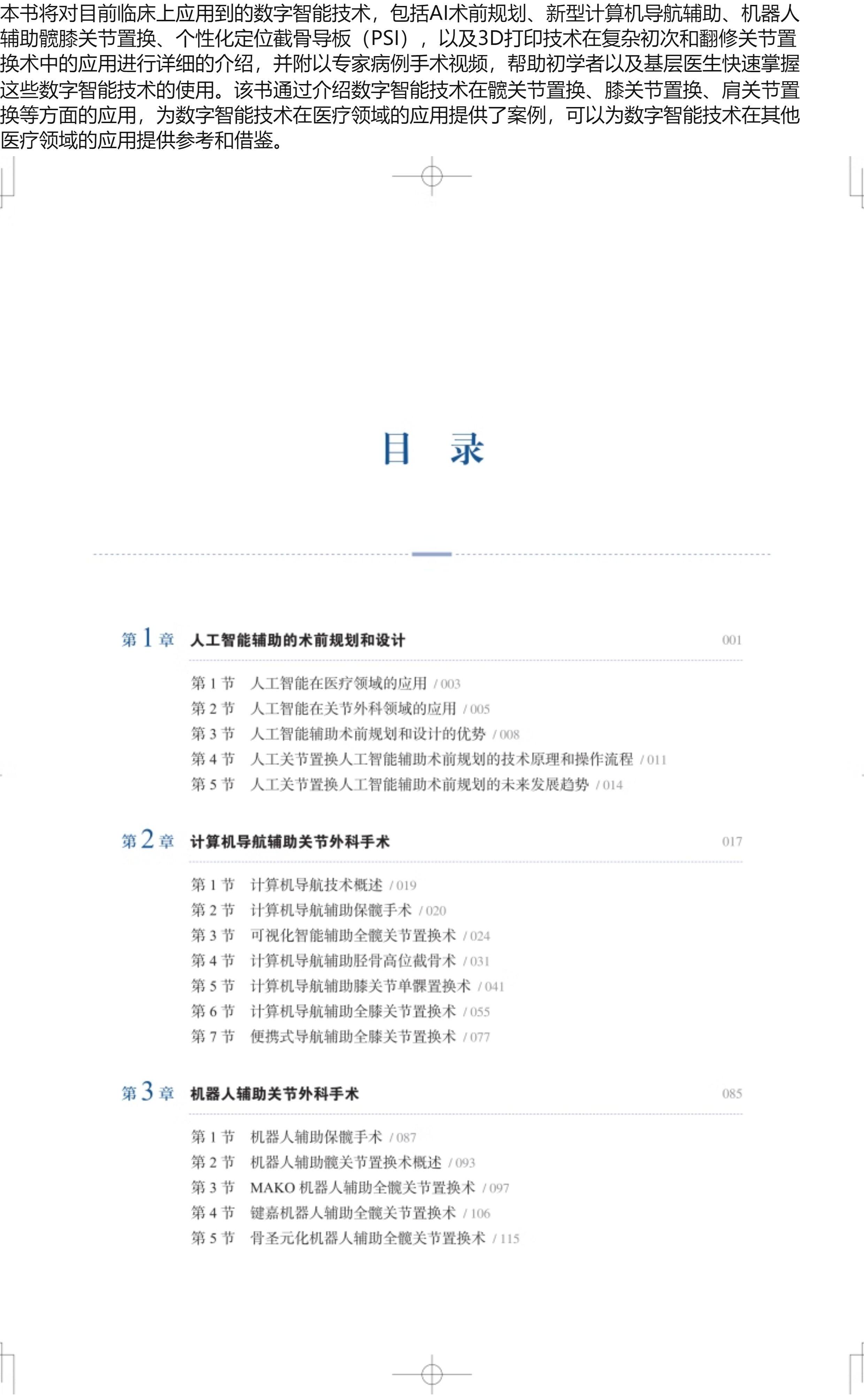 本书将对目前临床上应用到的数字智能技术,包括AI术前规划、新型计算机导航辅助、机器人辅助髋膝关节置换、个性化定位截骨导板(PSI),以及3D打印技术在复杂初次和翻修关节置换术中的应用进行详细的介绍,并附以专家病例手术视频,帮助初学者以及基层医生快速掌握这些数字智能技术的使用。该书通过介绍数字智能技术在髋关节置换、膝关节置换、肩关节置换等方面的应用,为数字智能技术在医疗领域的应用提供了案例,可以为数字智能技术在其他医疗领域的应用提供参考和借鉴。