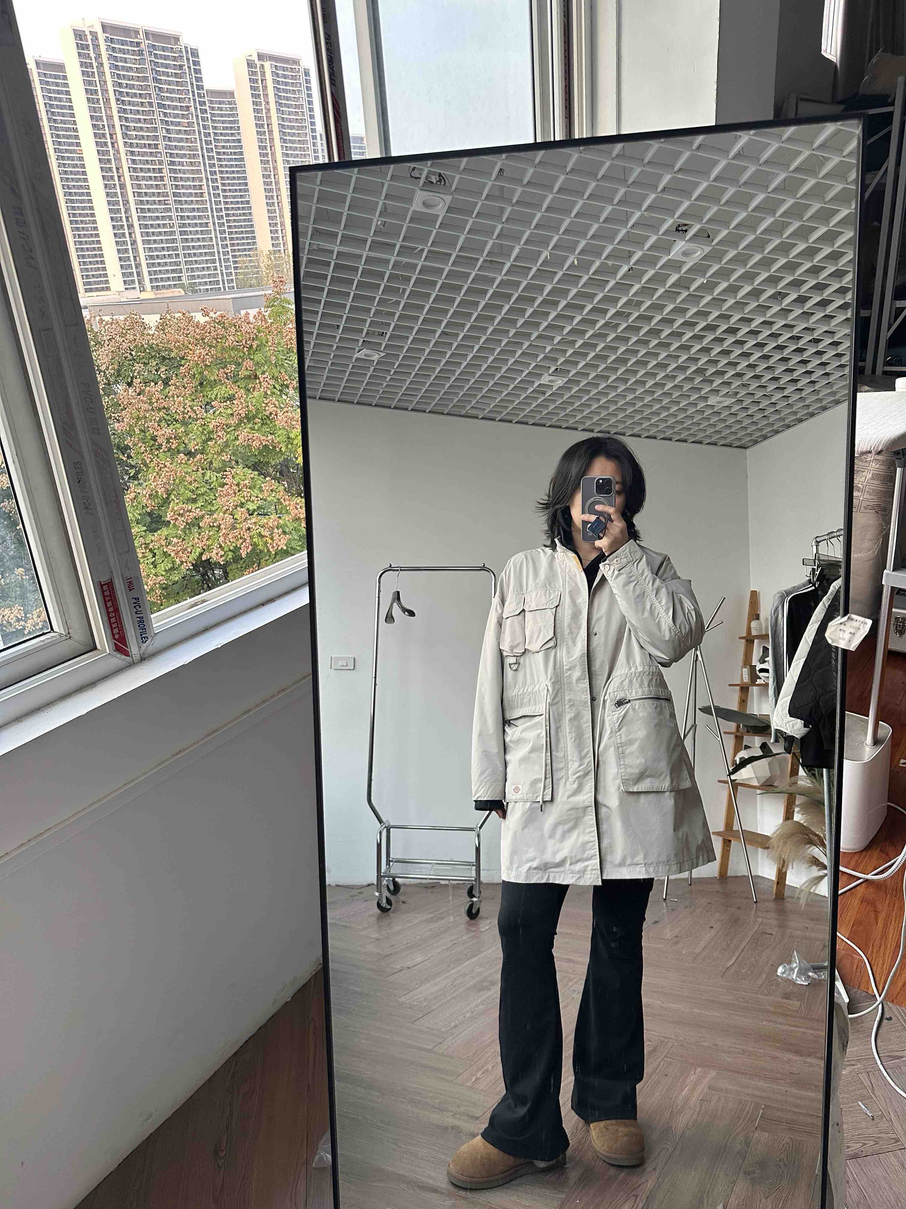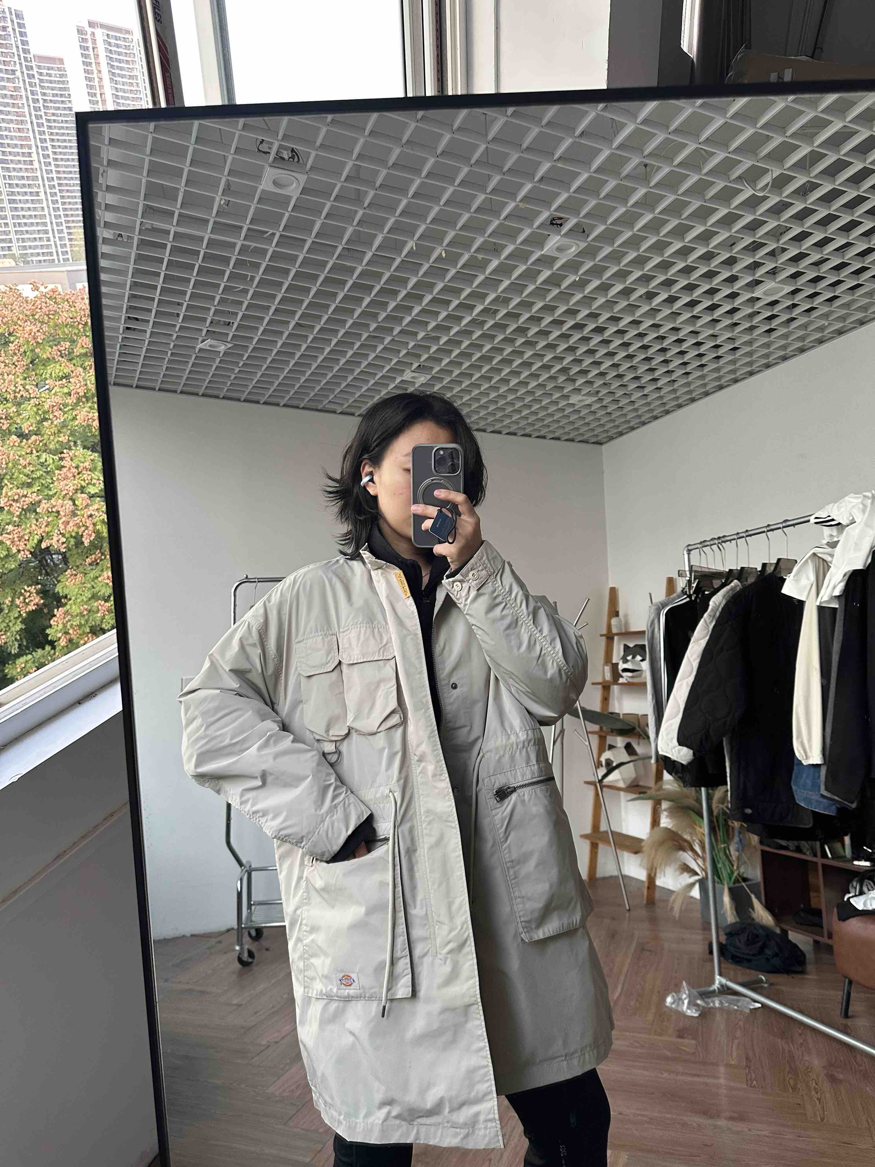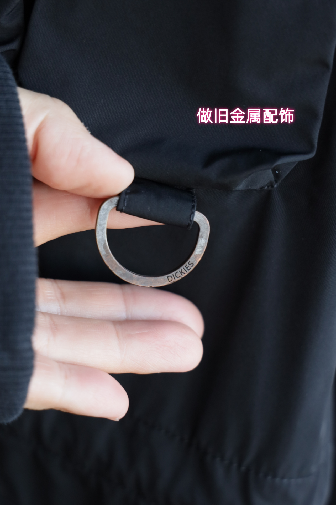 两侧大口袋设计实用,金属拉链和按扣配件,落肩袖