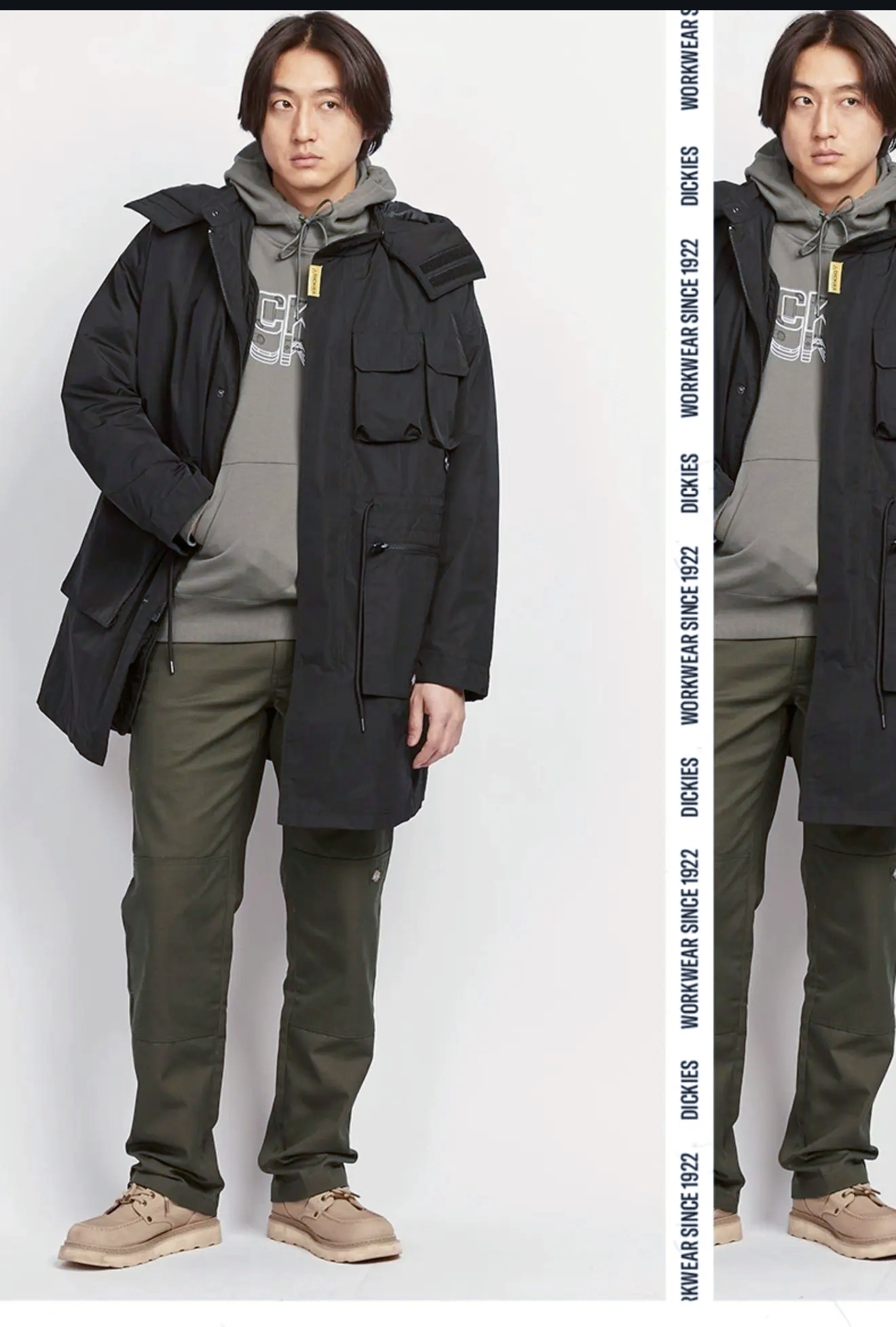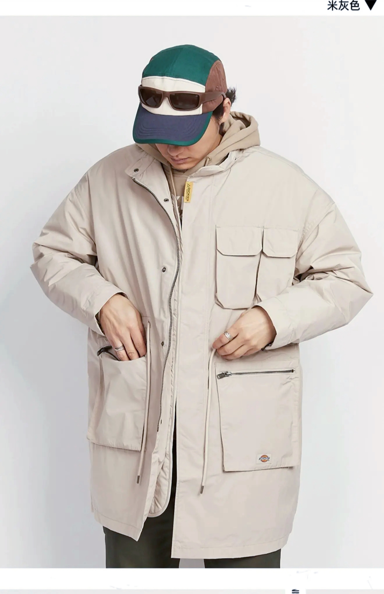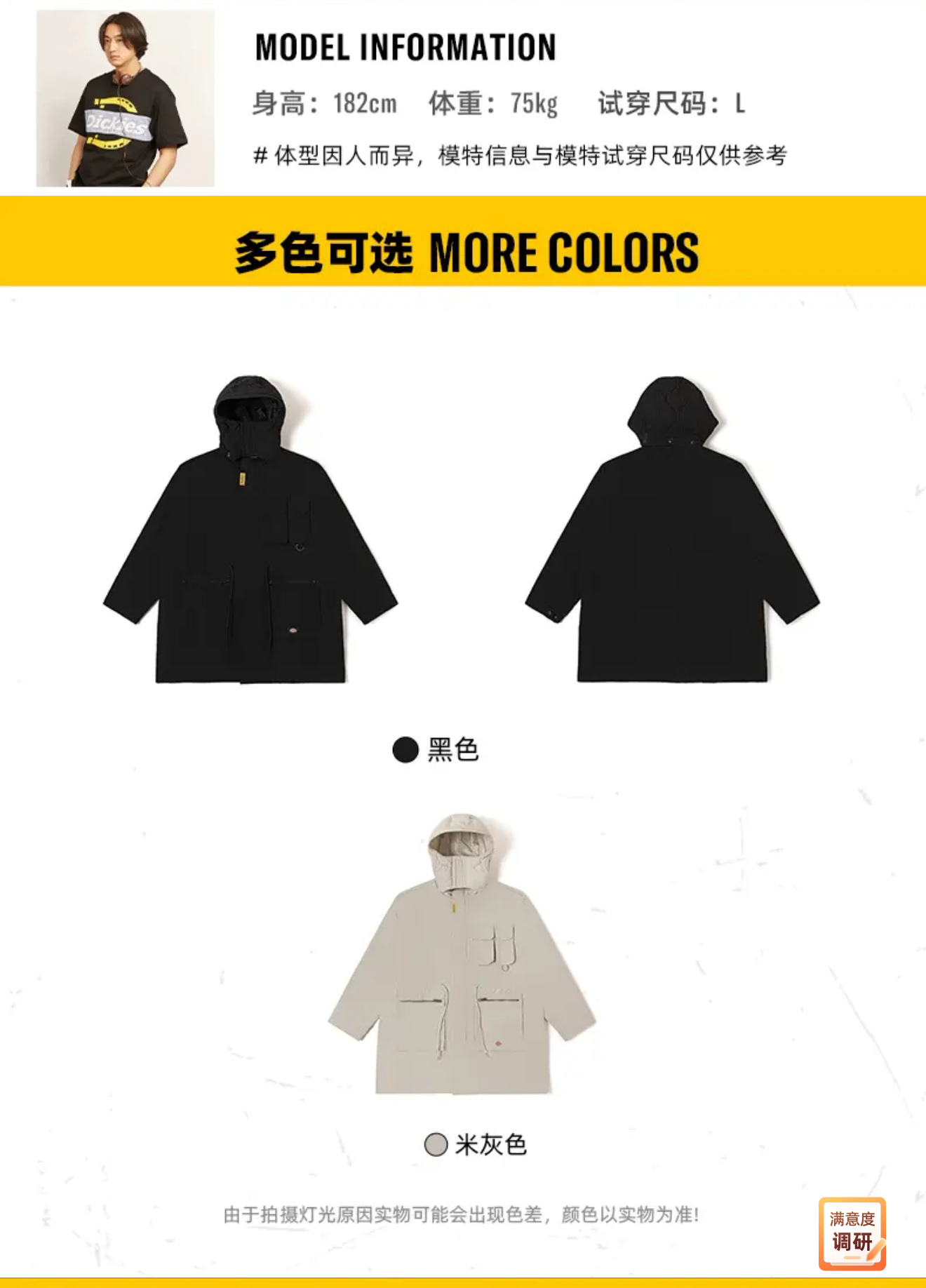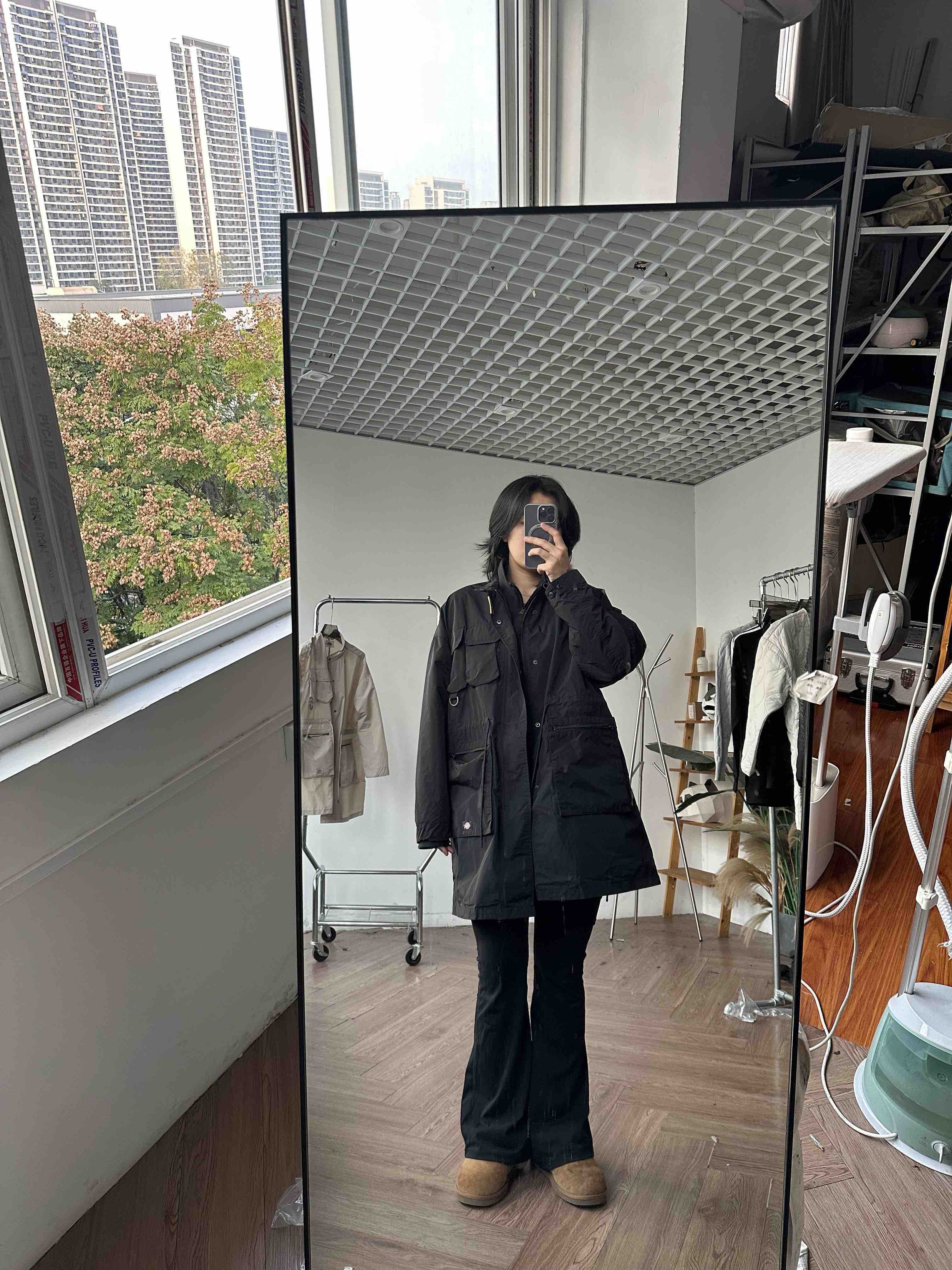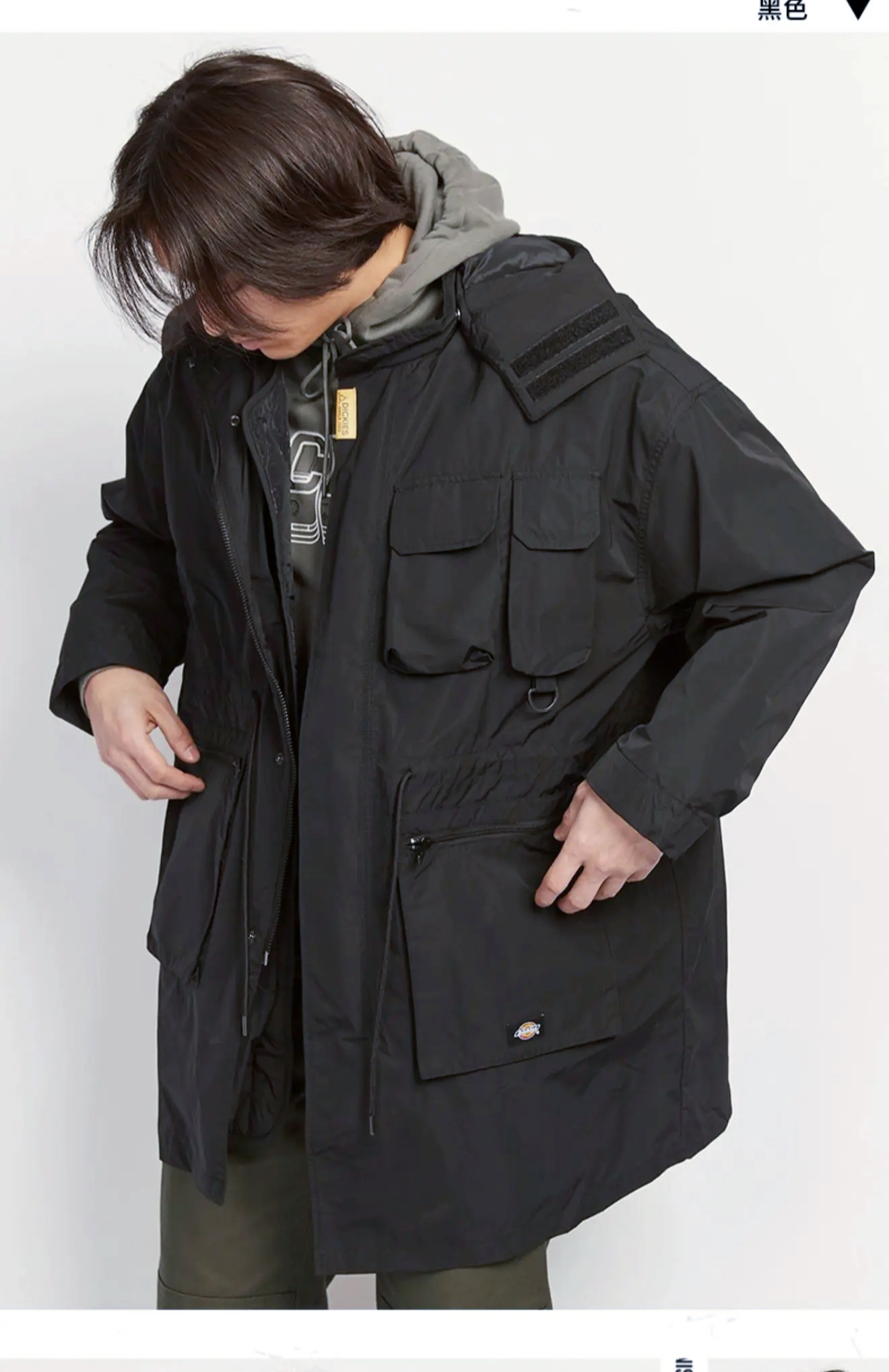 黑色和灰白可选,连帽设计,多口袋工装风格,抽绳收腰,适合秋冬季节穿着。