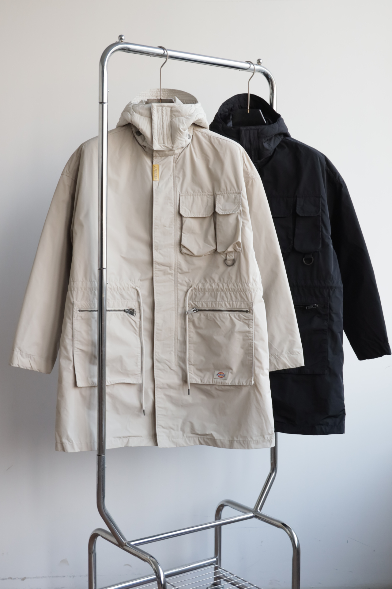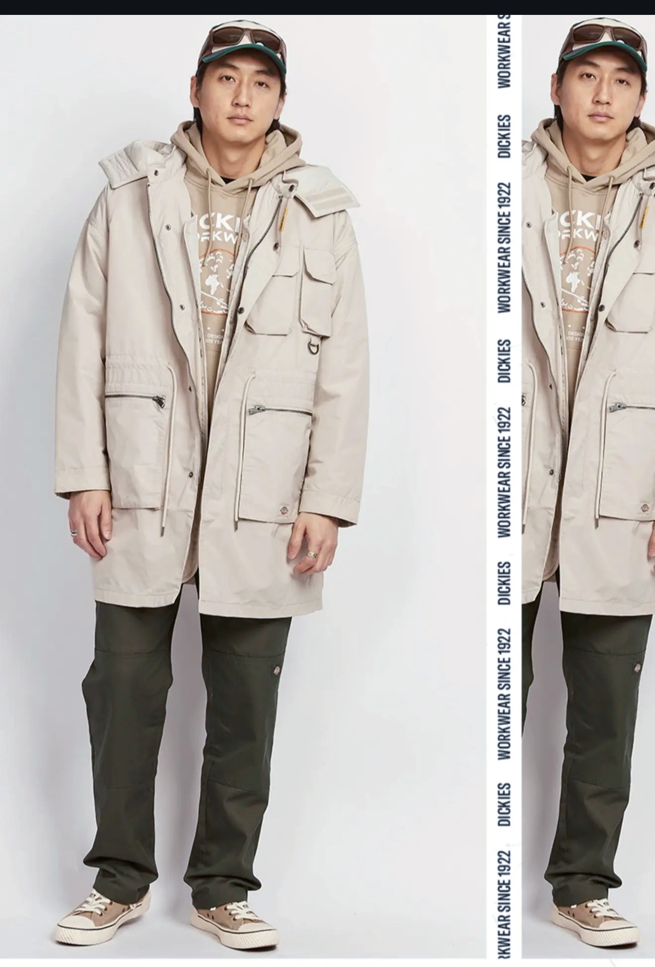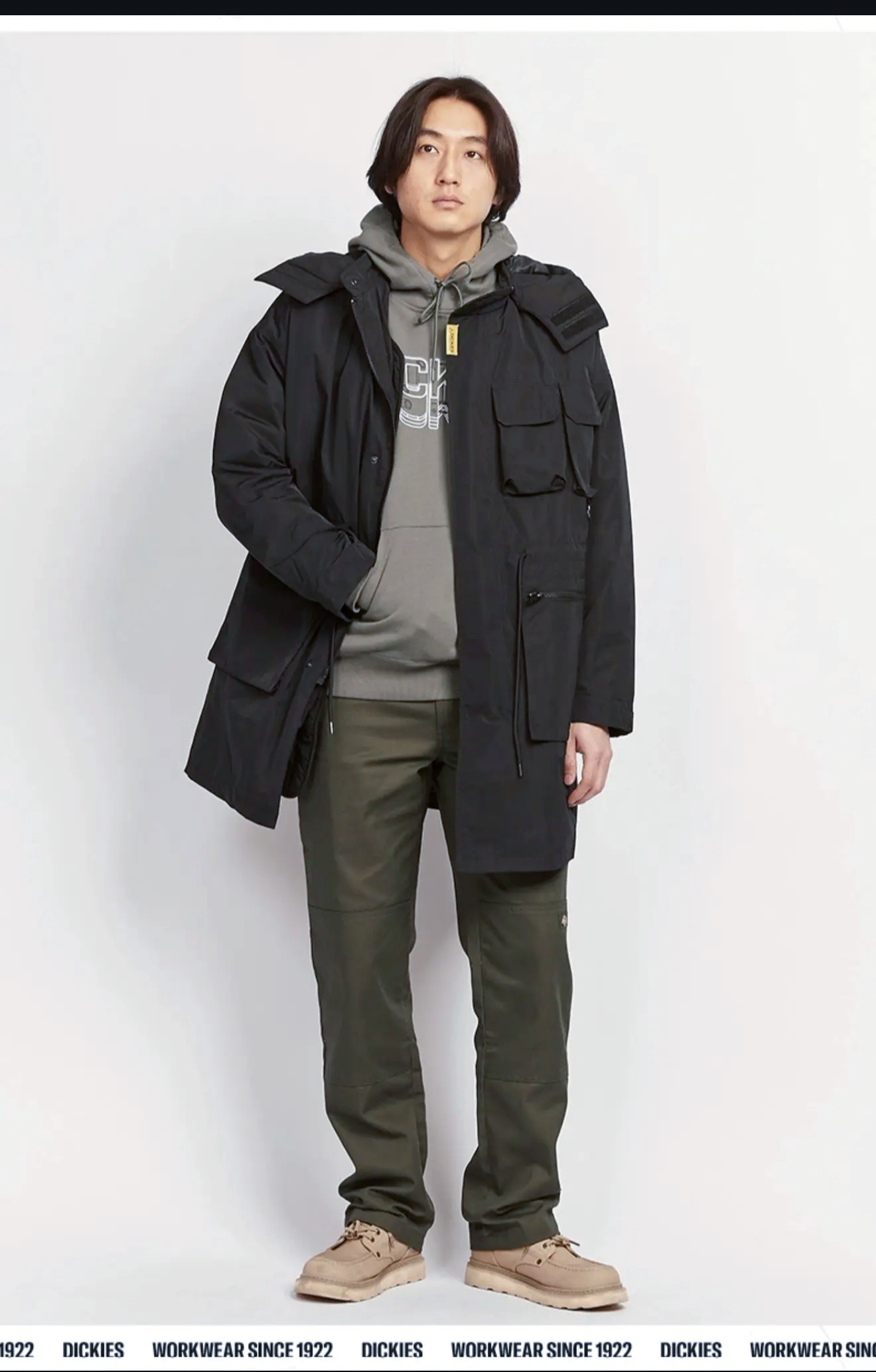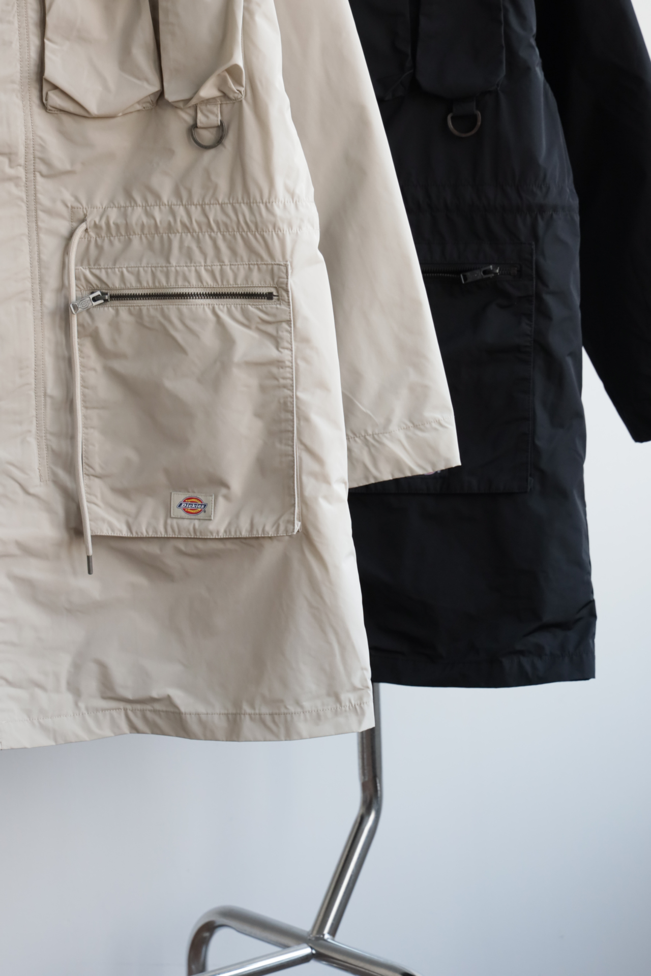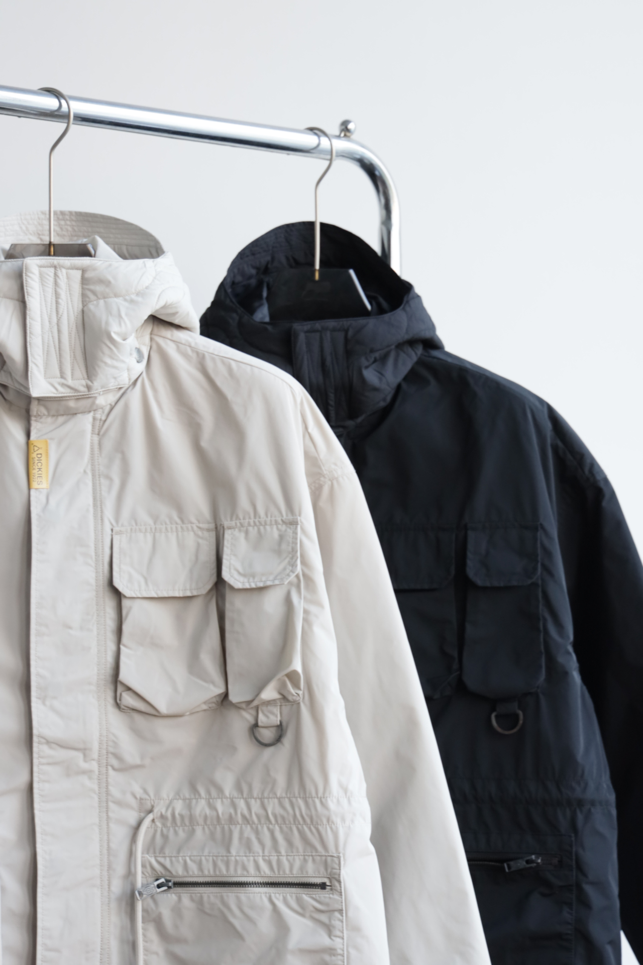 黑色和灰白可选,连帽设计,多口袋工装风格,抽绳收腰,适合秋冬季节穿着。