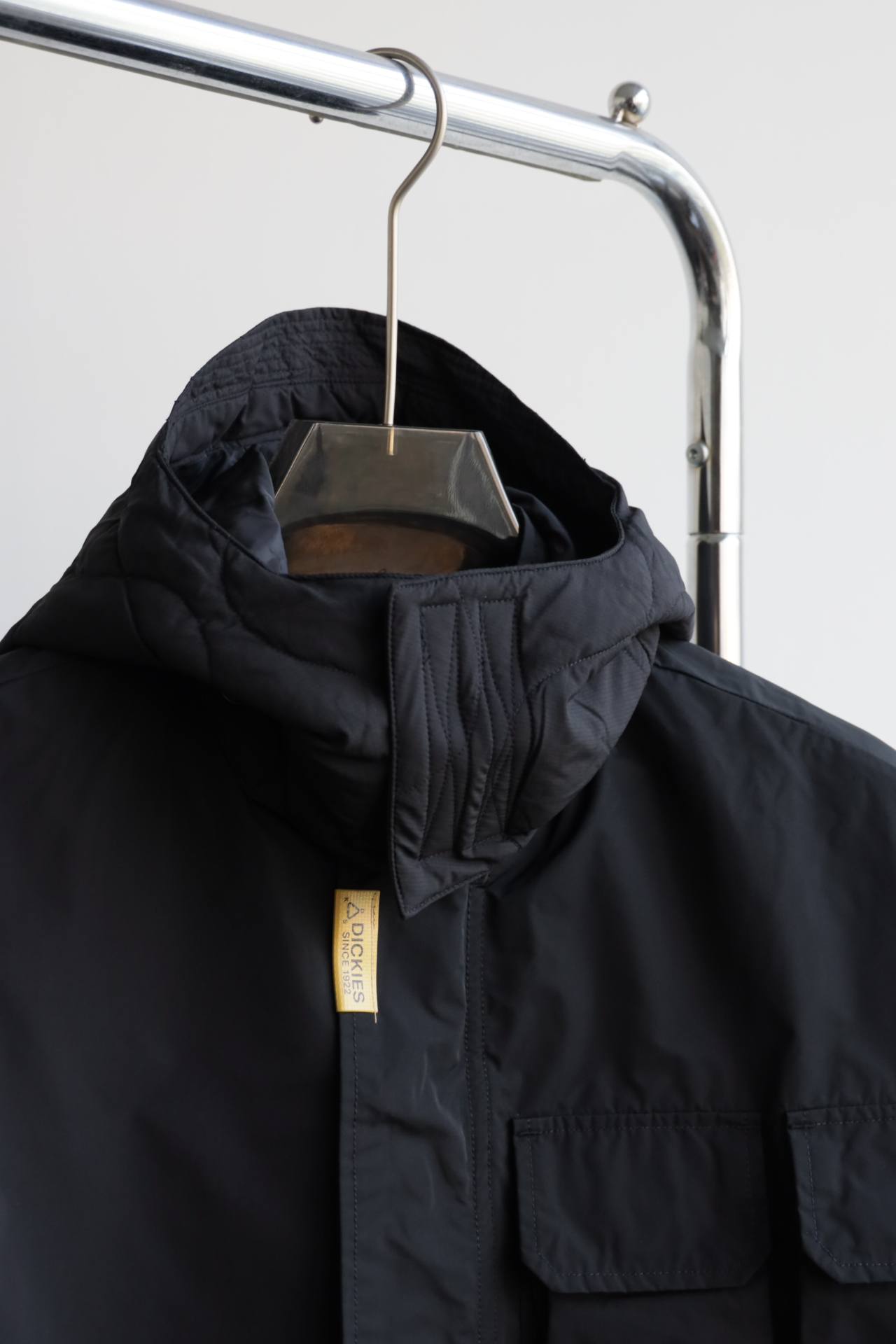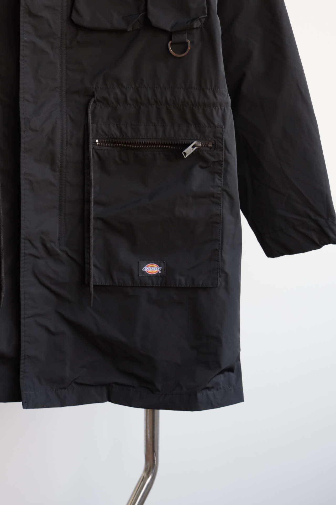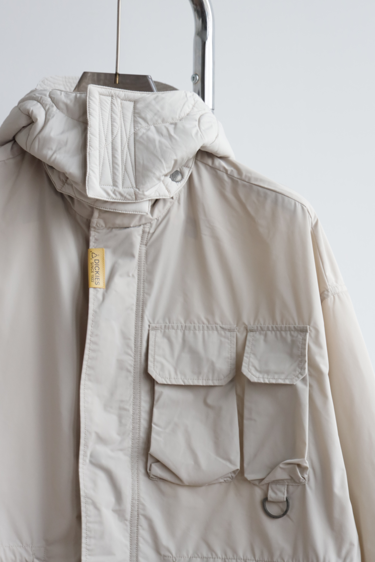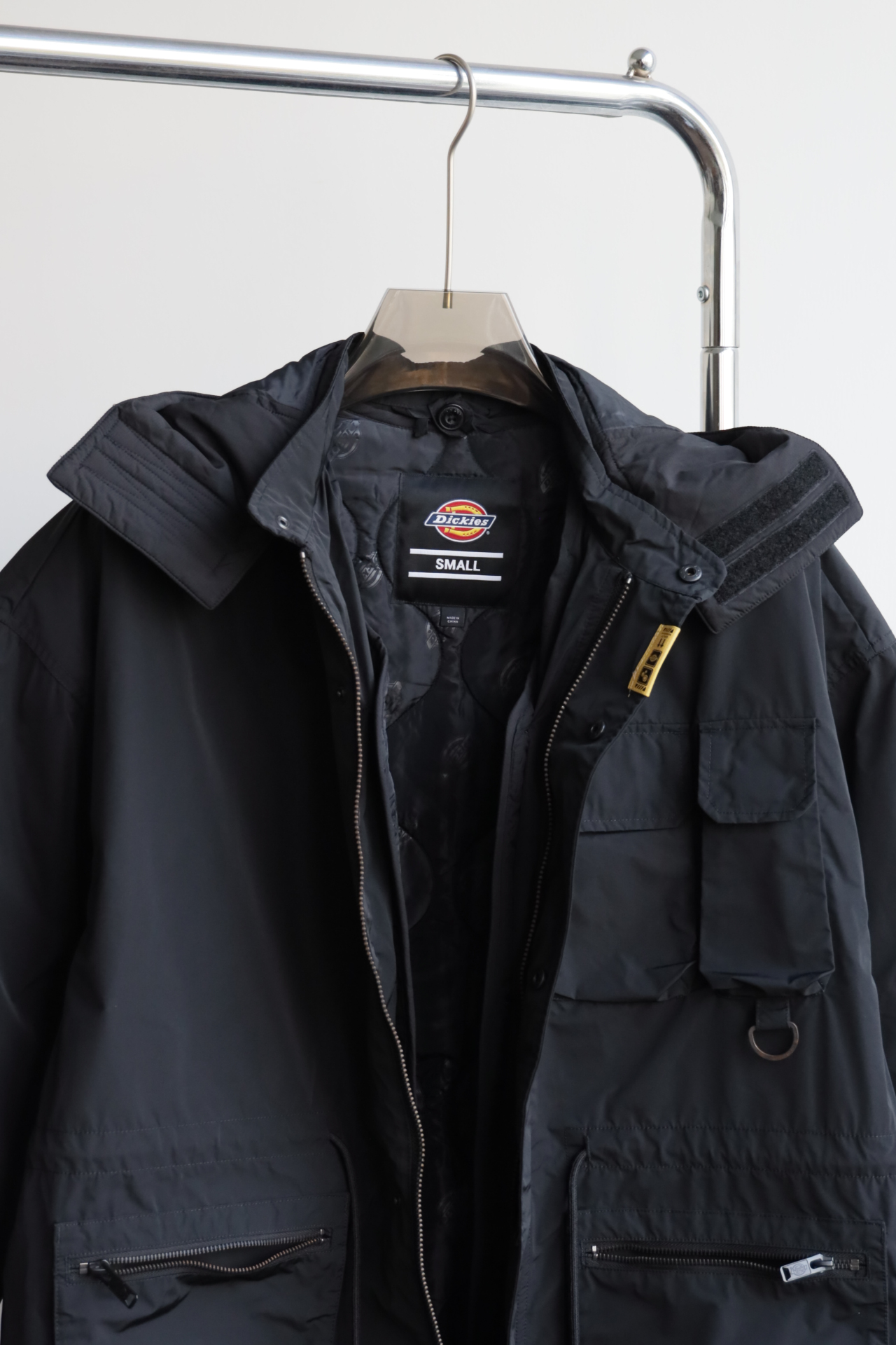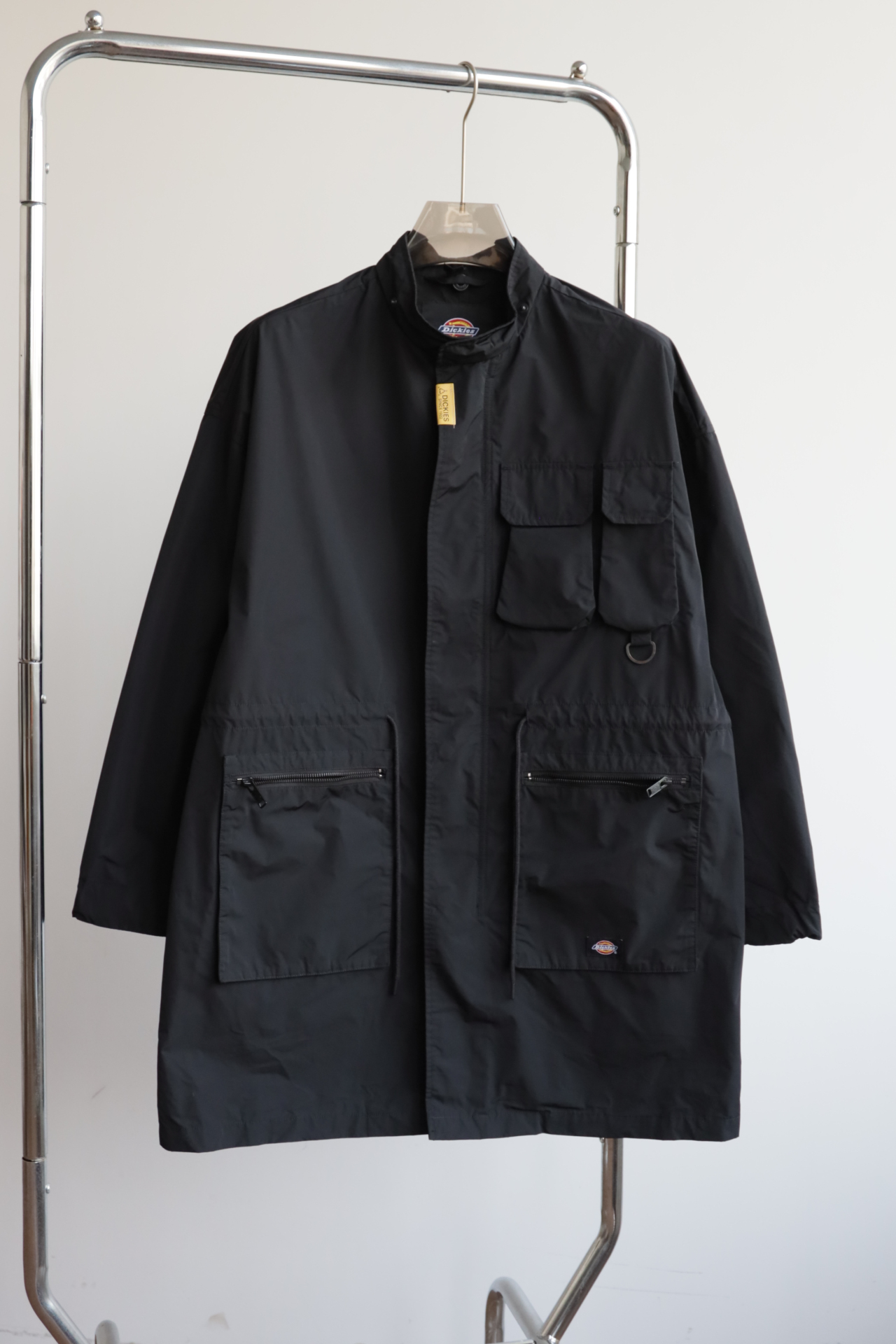 黑色和灰白可选,连帽设计,多口袋工装风格,抽绳收腰,适合秋冬季节穿着。