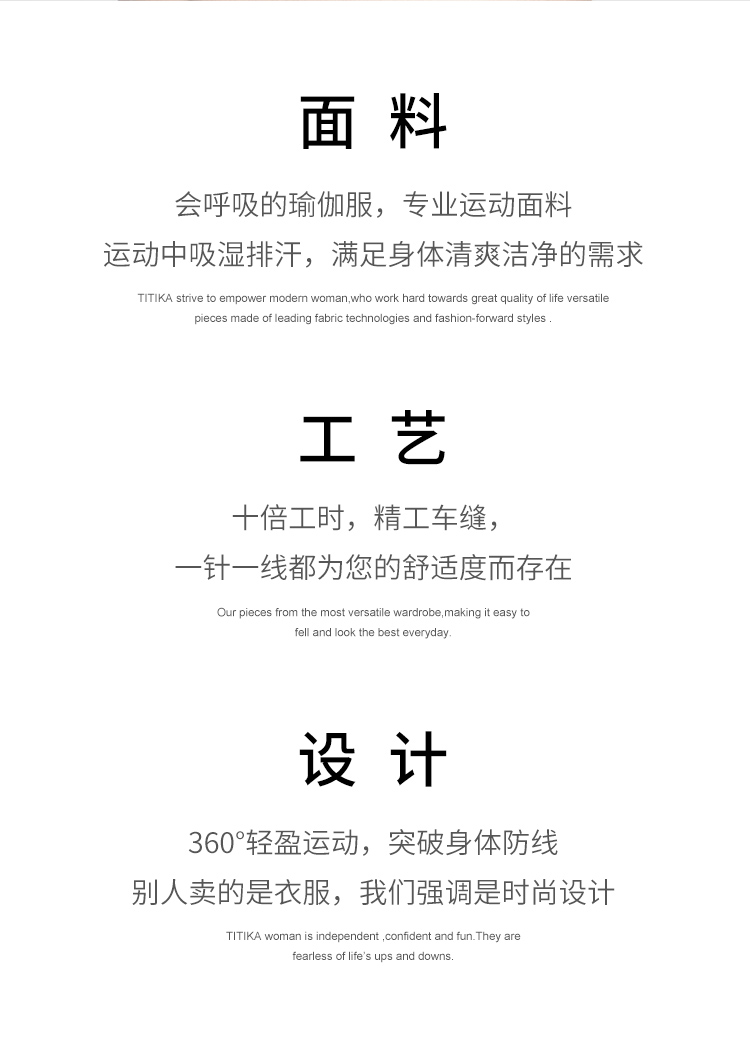 - 2009年,Titika Active Couture诞生于北美时尚之都,重新定义运动服饰,让运动时尚,前卫、性感,更宣扬一种无畏自由的生活态度。TITIKA缇缇卡不断求变,为品牌添加多种元素