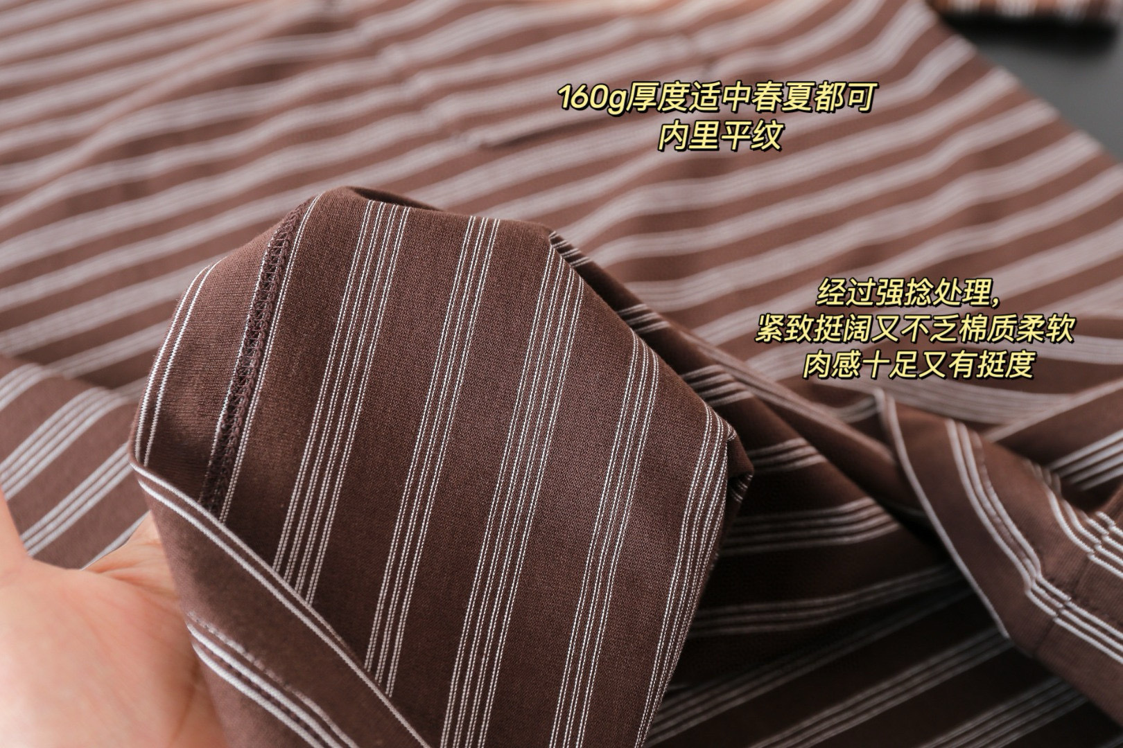 面料采用60支长绒棉色织成布,经过强捻处理,紧致挺阔又不乏棉质柔软。