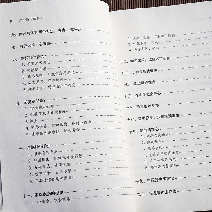 老教授六十几年游历世界各地讲学与各类演讲、讲座交流中,经常论及传统的预防保健、祛疾养生的道理和方法,老教授道德高尚而博学多闻,以数十年修学、阅历所得与亲身实践的成功经验,于淡淡而叙、款款而谈之间,将中华民族传统的儒家、佛教和中医文化理念与现代前卫科学原理融会贯通,阐述为许多现代人闻所未闻的诸如“卫生”“卫性”“卫心”的素食养生之道,和简单饮食、培养清净心、慈悲心等养生理念方法,以及惜福积德、断恶修善以改造命运、获得人生幸福的道德人生观,从而使养生保健之道成为圆满、积极的人生之道、生命之道。其中布施修福、日中一食、倡导天然农耕等亲身经历,和诸如“荤”与“腥”的区别、住房影响心态、对中医的认识、中国素食传统起源等见闻,读来颇有趣味。