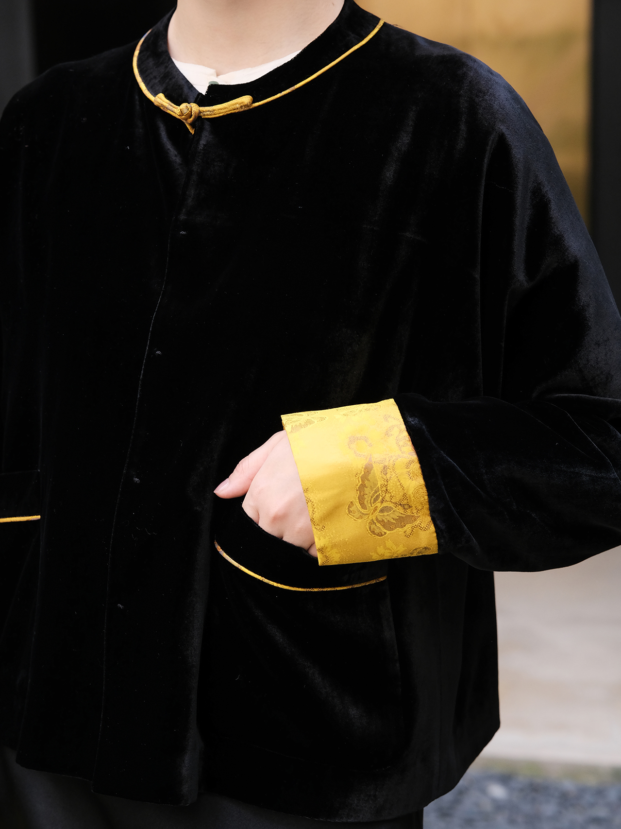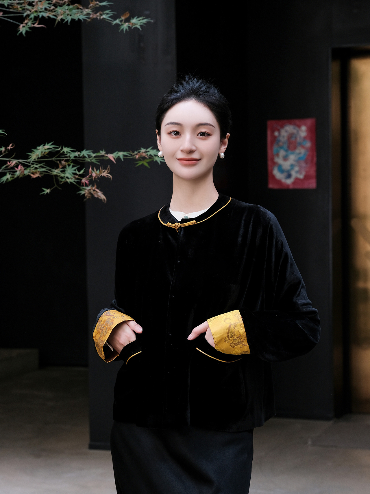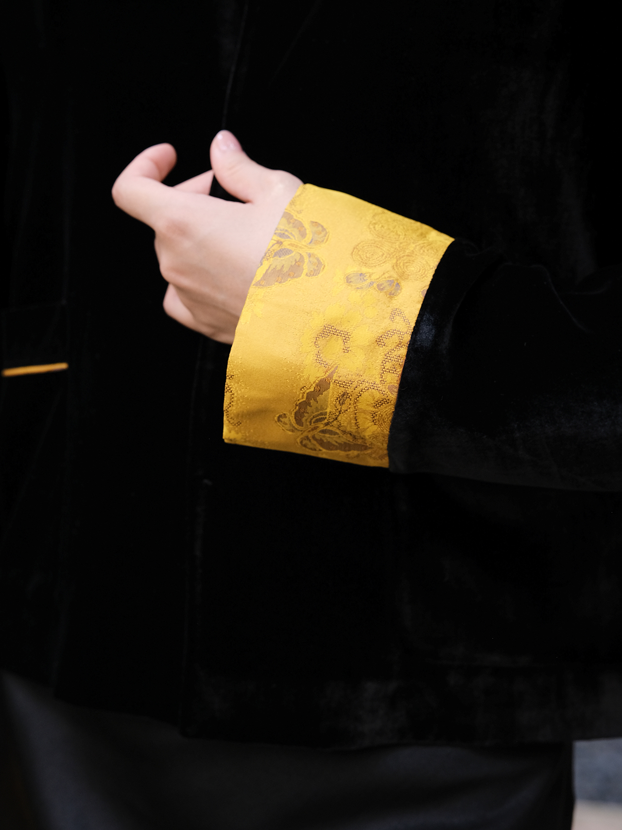 盛唐牡丹| 丝绒拼花香引蝶宋锦袖口外套