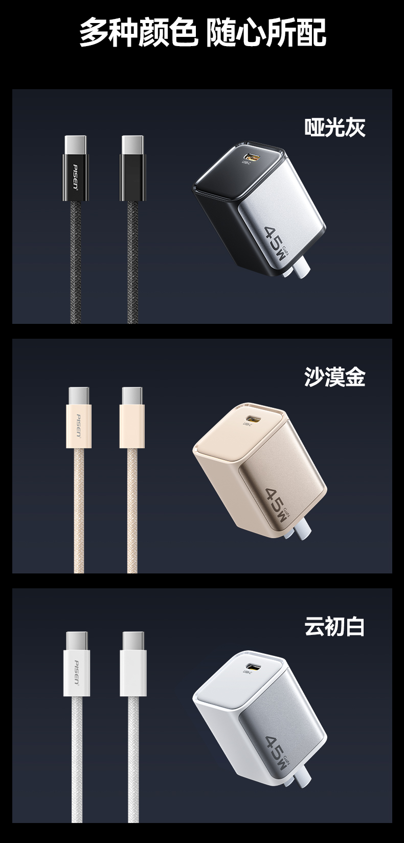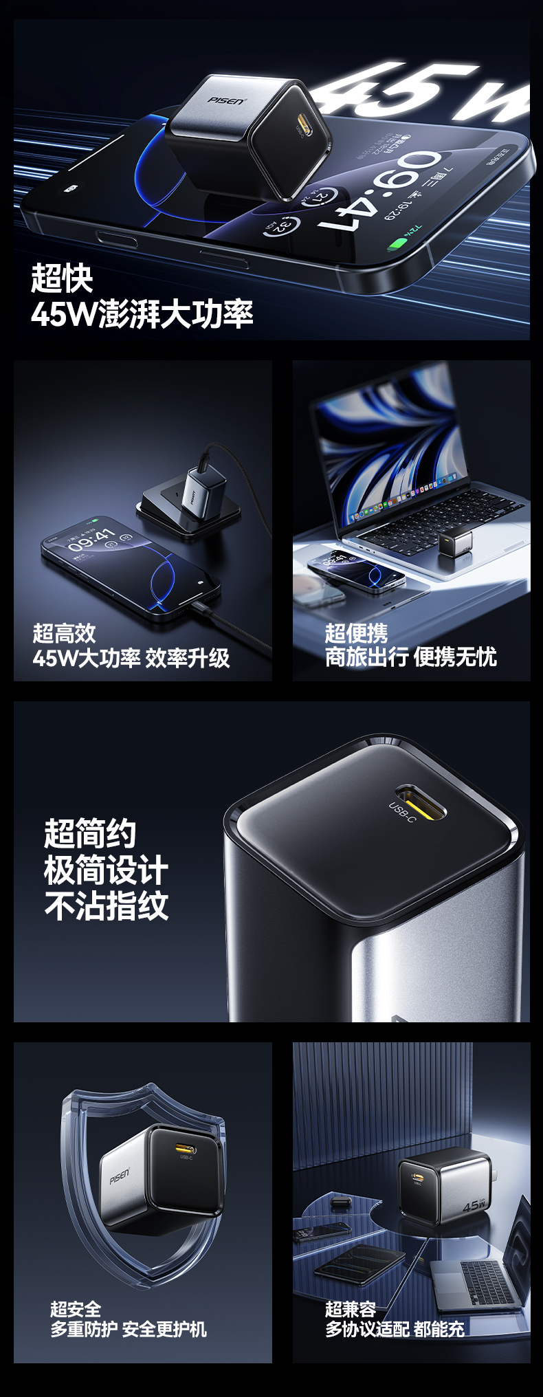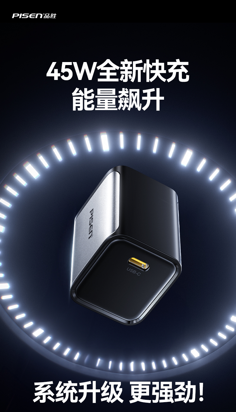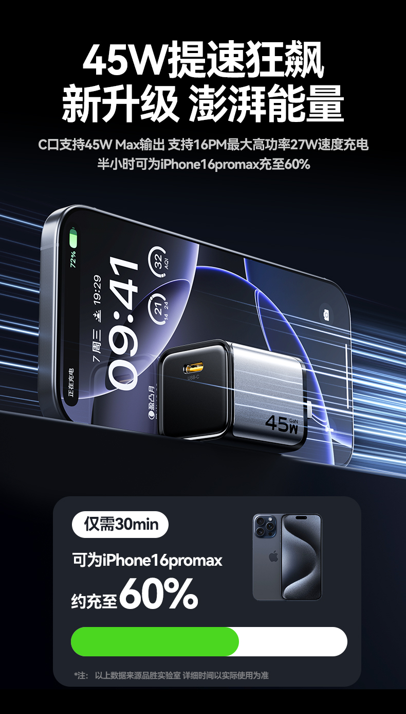 品胜 45W氮化镓闪电湃单口快速充电器Type-C快充头适用苹果16充电器iphone16e/ProMax/plus苹果华为三星手机插头
